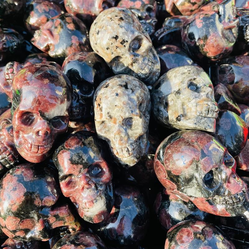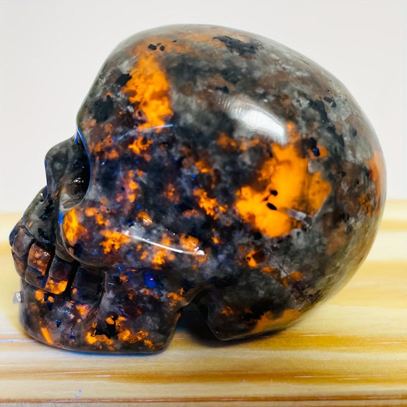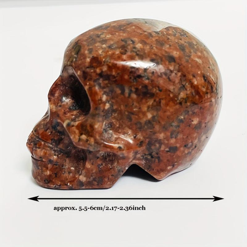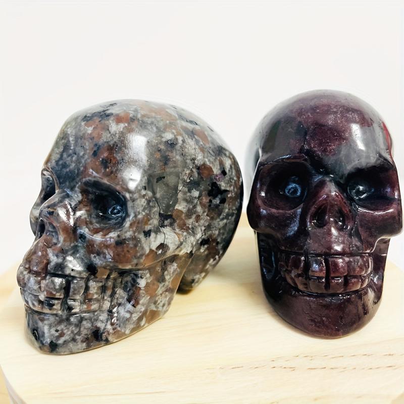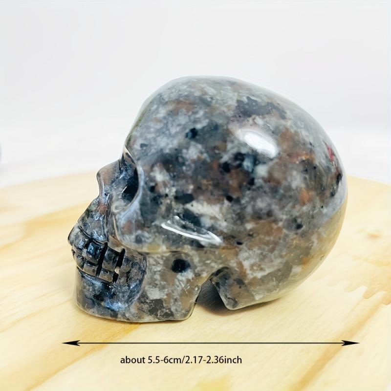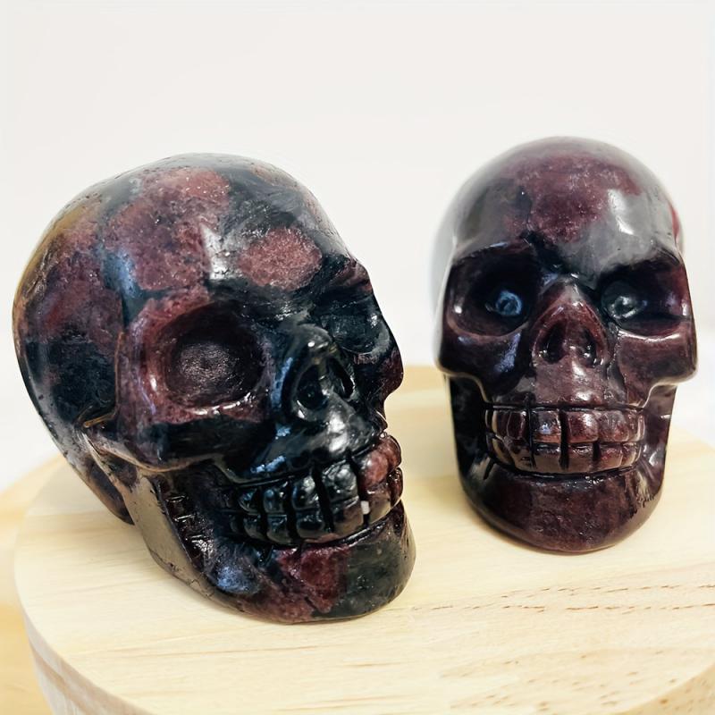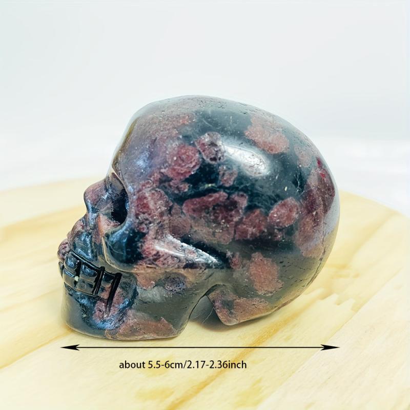 Add a unique touch to your home decor with this intricate skull stone carving made from Yooperlite and Garnet. The dark gray colors and intricate design will make it a standout piece in any room.