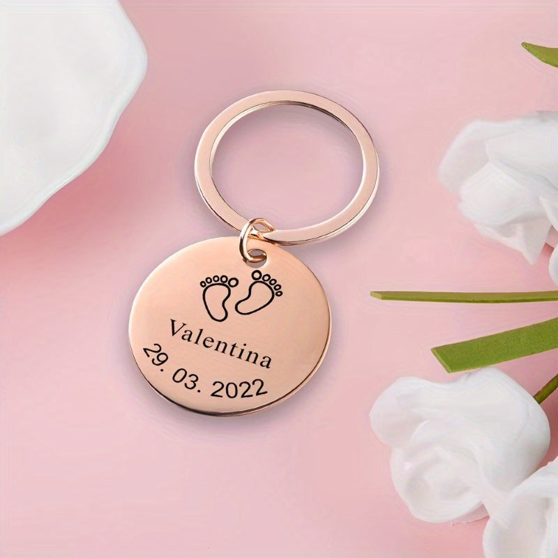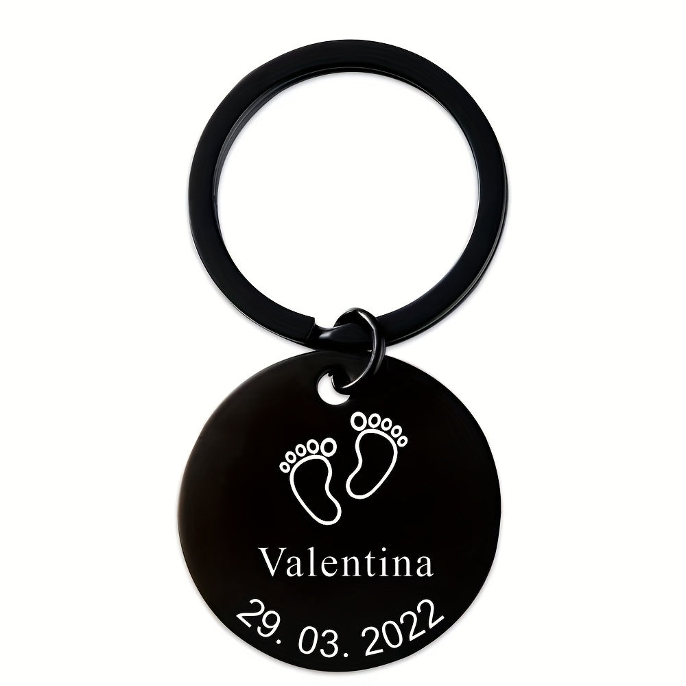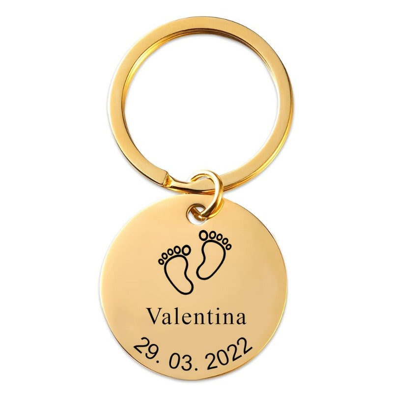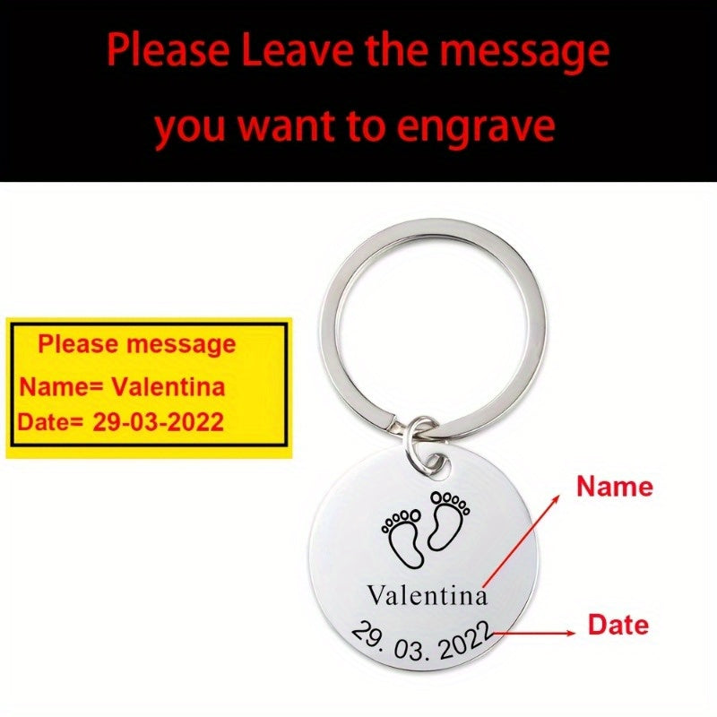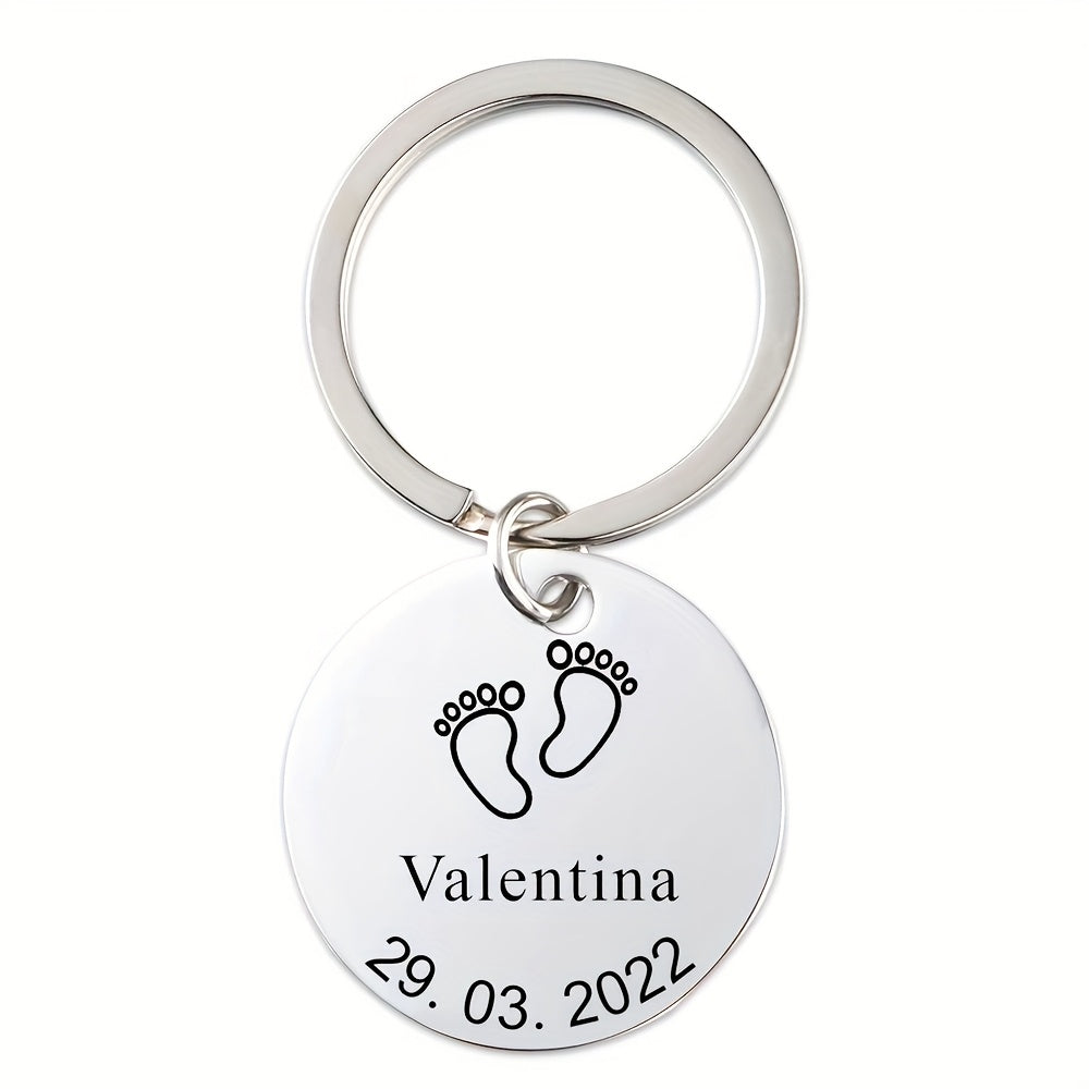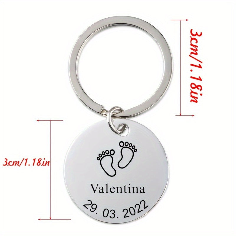 Dieser Schlüsselketten aus Edelstahl verfügt über Fußspuren für kleine Kinder und kann mit Namen und Daten individuell eingraviert werden. Es ist ein perfektes Geschenk für Eltern, Mütter, Väter und Teenager. Der Schlüsselbund ist langlebig und sentimental.