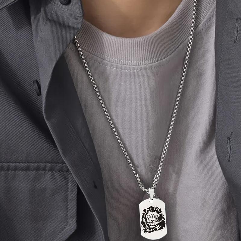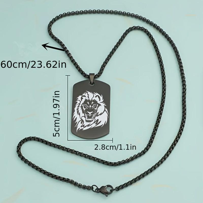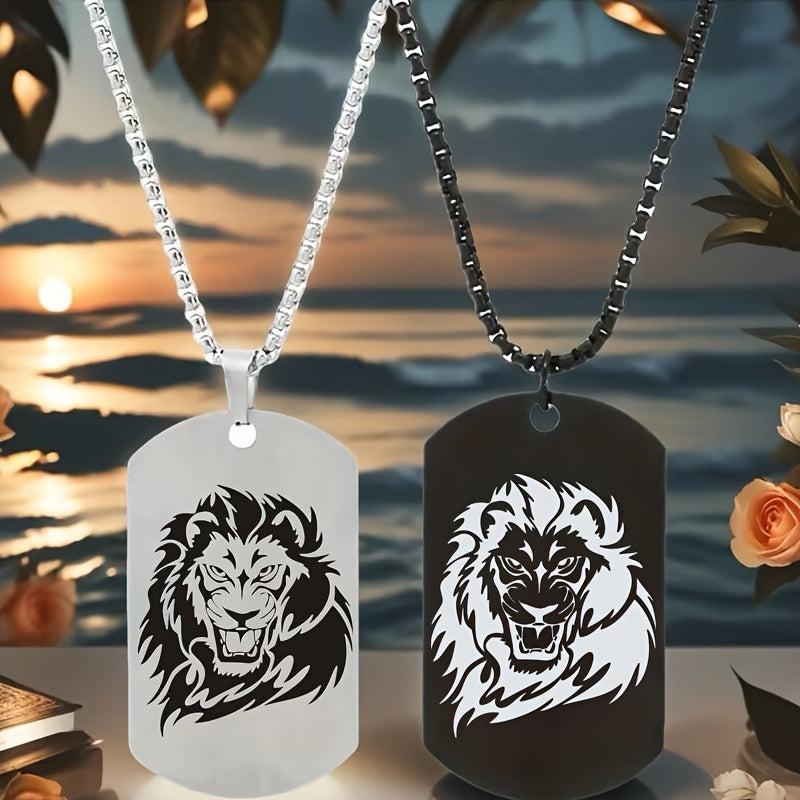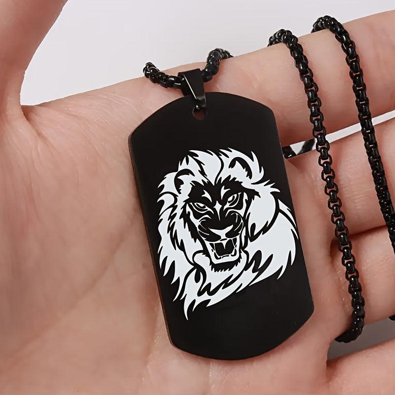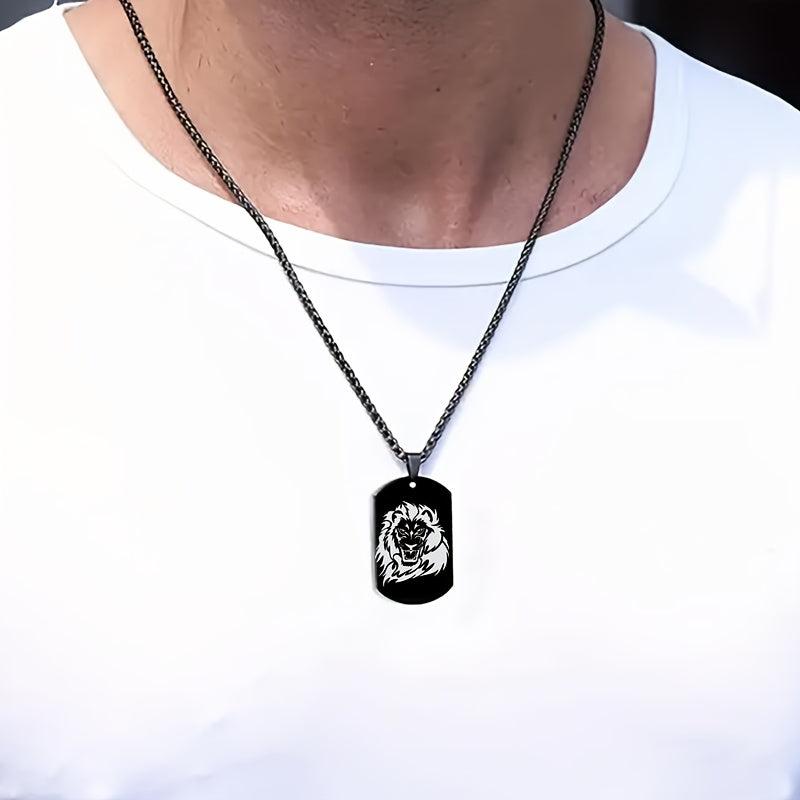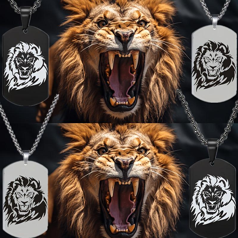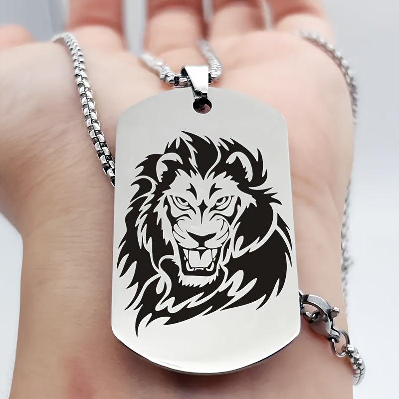 Custom Gravured Lion Anhängerkette aus Edelstahl. Ideal für tägliche Verschleiß oder besondere Anlässe wie Halloween. Fügen Sie Ihren Namen, Datum oder Telefonnummer für eine eindeutige Note hinzu.