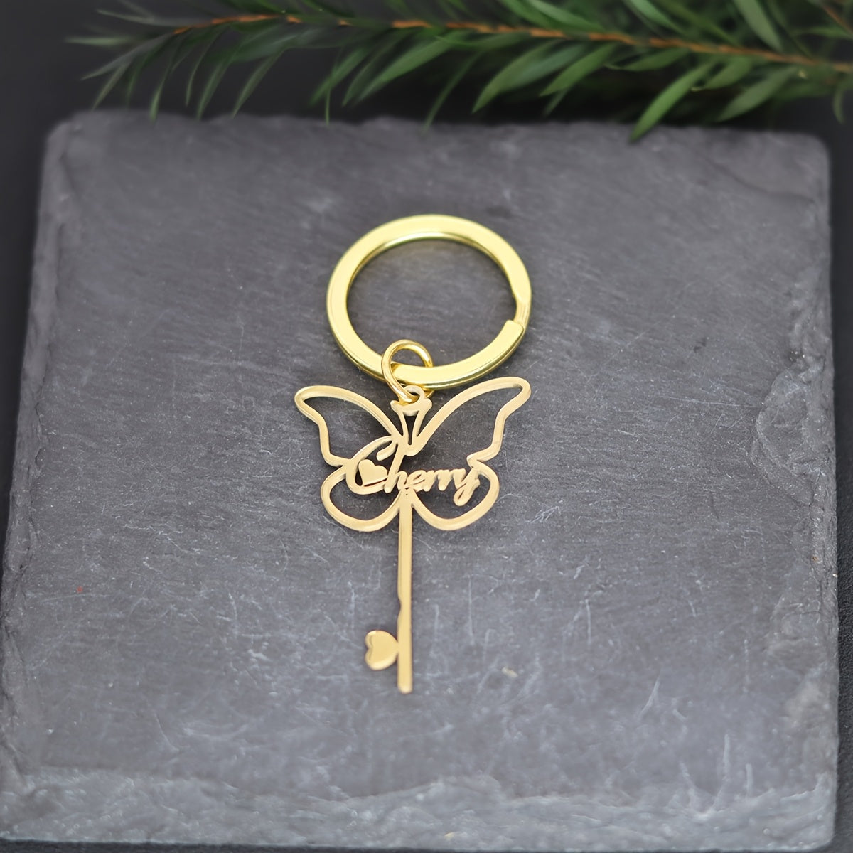 Personalisierte Edelstahl -Schmetterlingsschlüsselkette mit Kirschinschrift