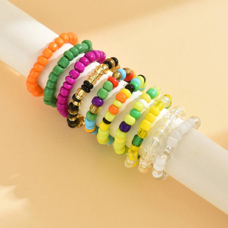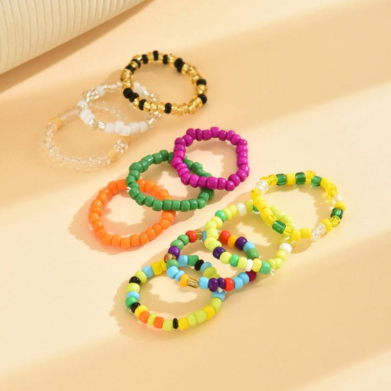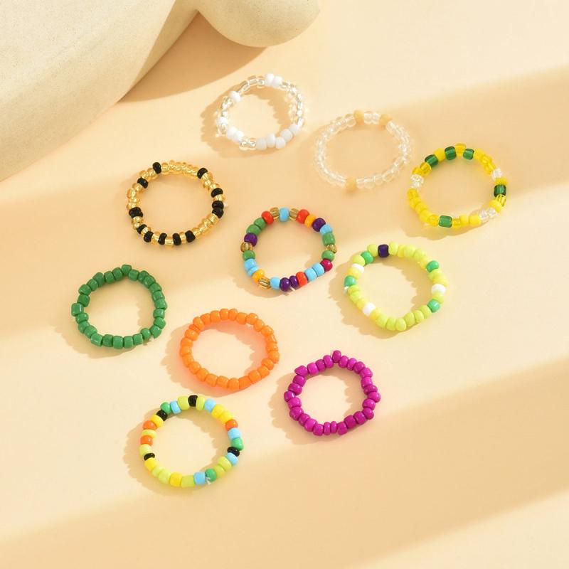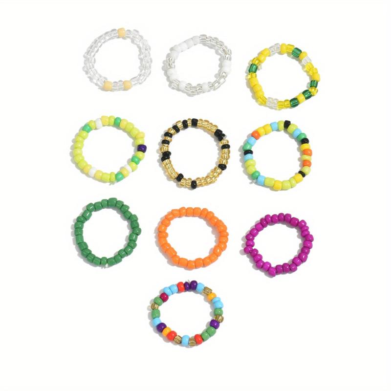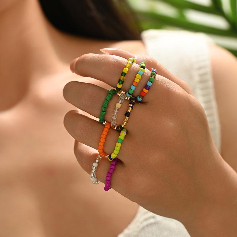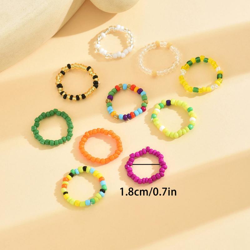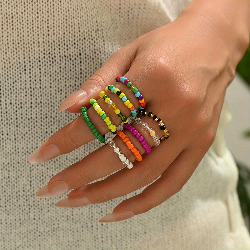 This set of 10 stackable rings is perfect for adding a touch of bohemian style to your summer beach vacation outfits. Each ring features colorful mixed beads and sea glass, creating a fun and vibrant look.