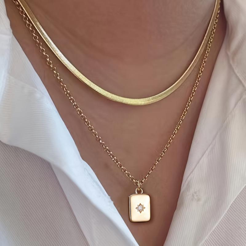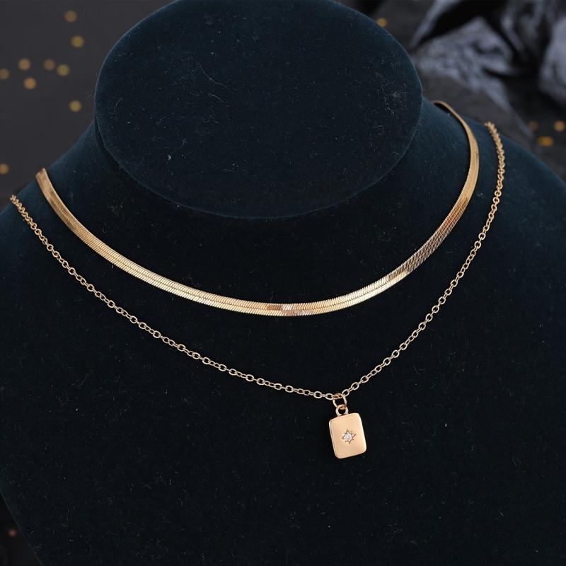 This set includes two stainless steel necklaces with sparkling zirconia stones. The flat rectangular pendants are stacked for a trendy look.