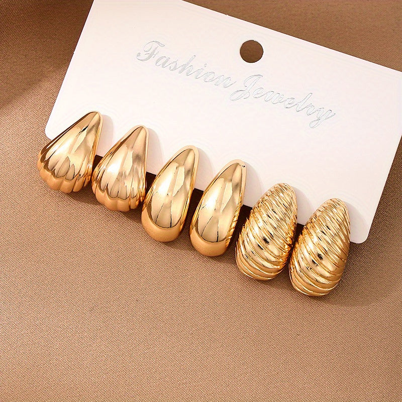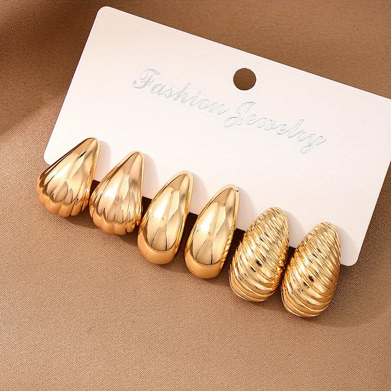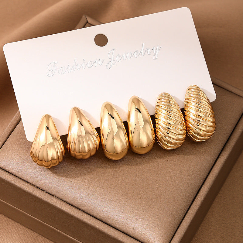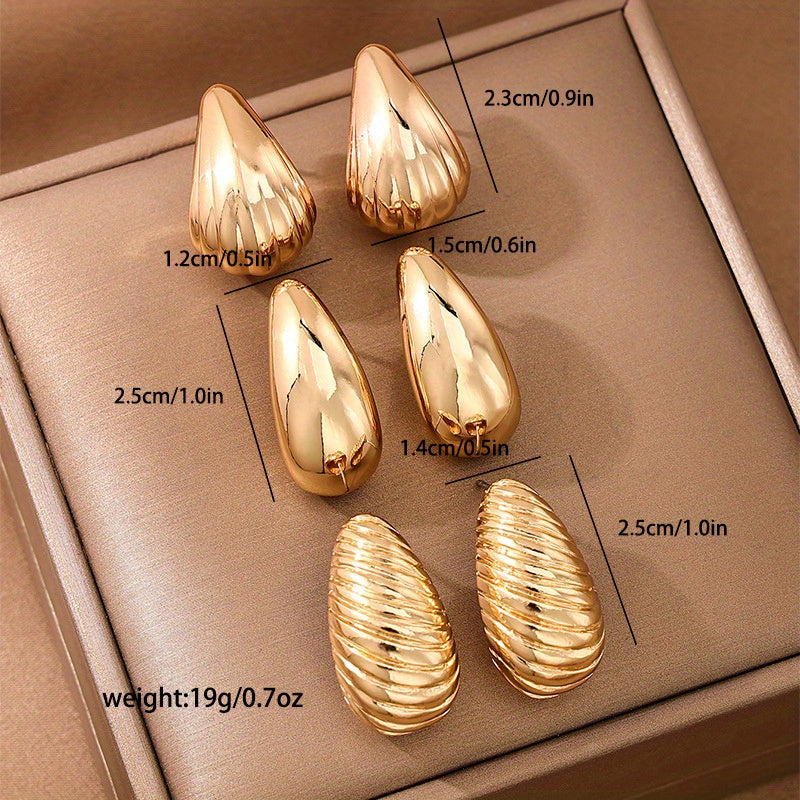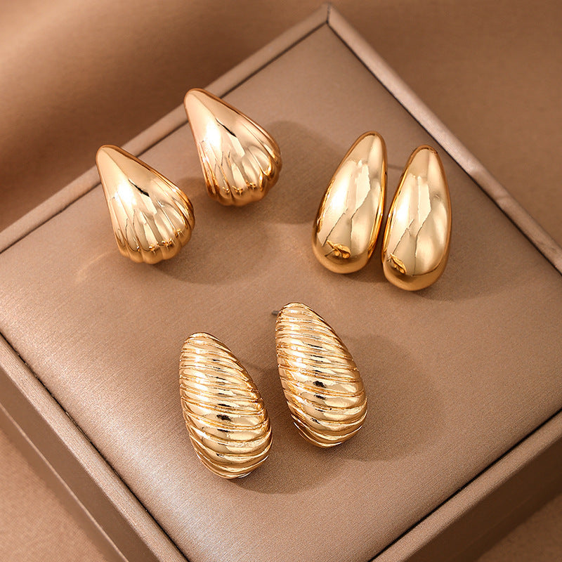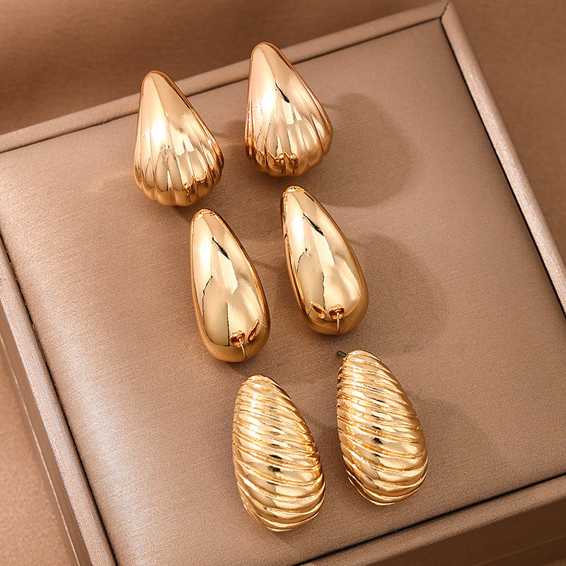 This set includes 3 pairs of stylish metal spiral shell water drop ear studs for daily wear. They are versatile and suitable for European and American fashion styles.