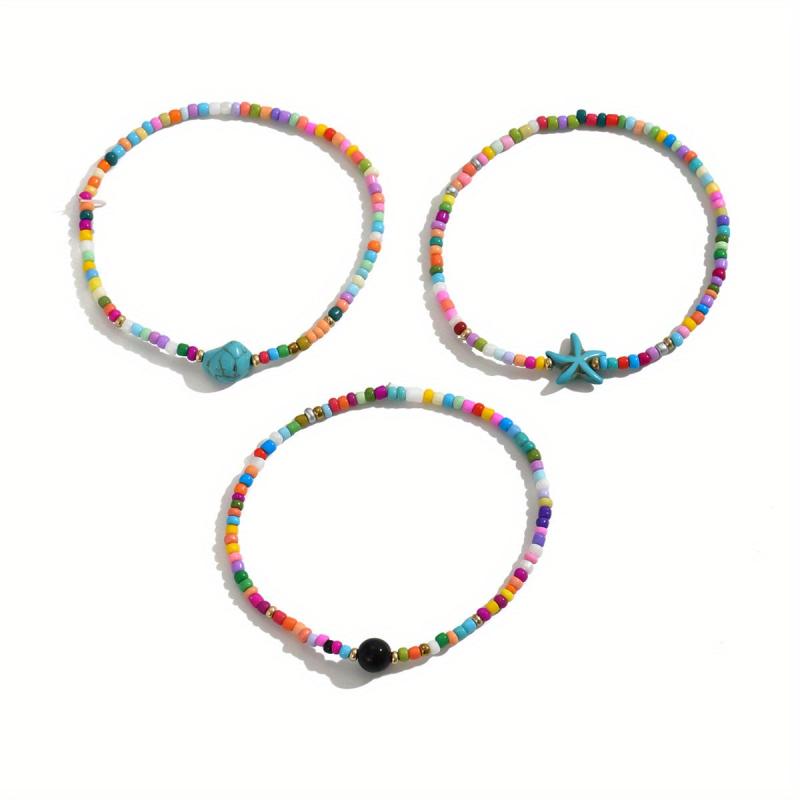 Complete your summer look with this set of 3 bohemian style bracelets featuring starfish, colorful beads, and a stretch rope design. Made from glass and synthetic turquoise materials.