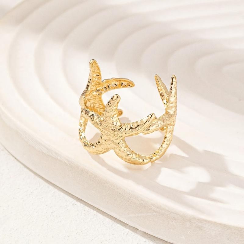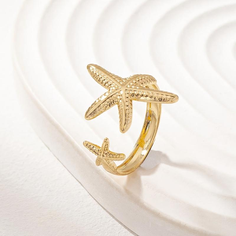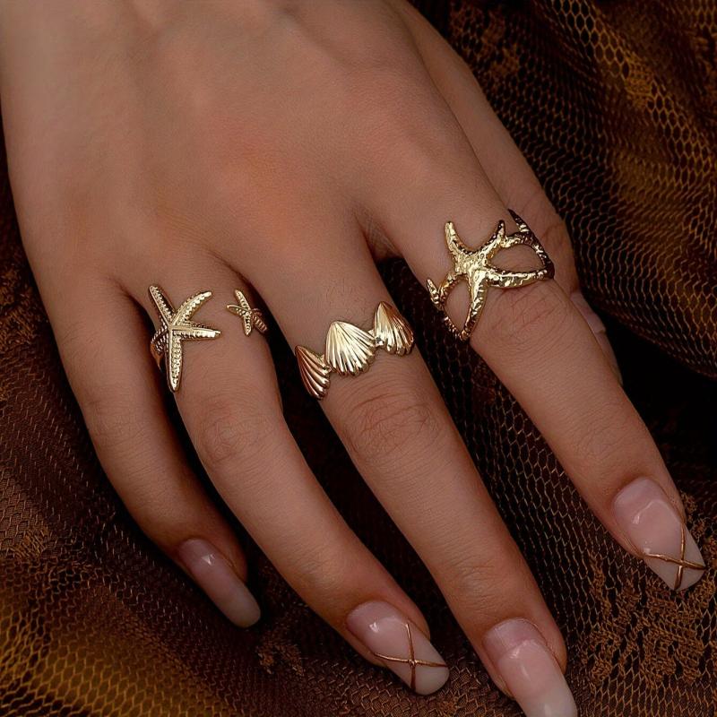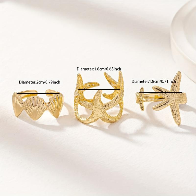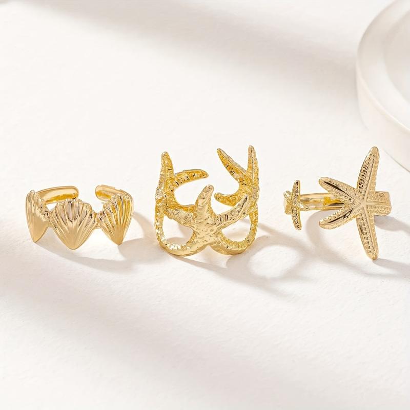 This set of three metal rings features an ocean series design with starfish and shell accents. Perfect for parties or vacation wear, it makes a great gift for your girlfriend.