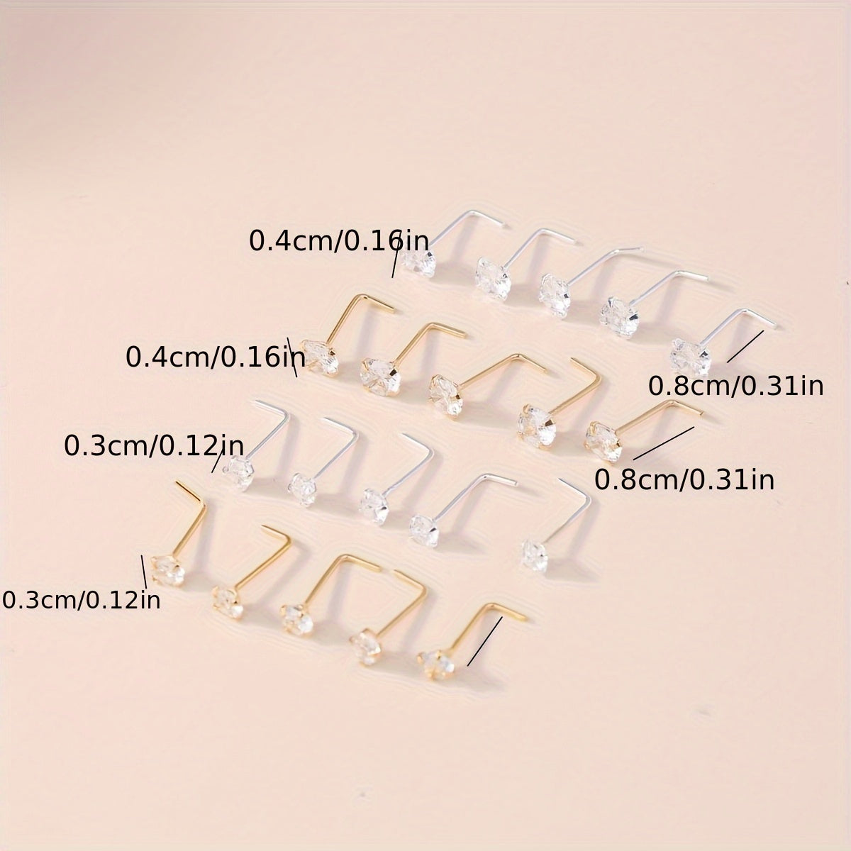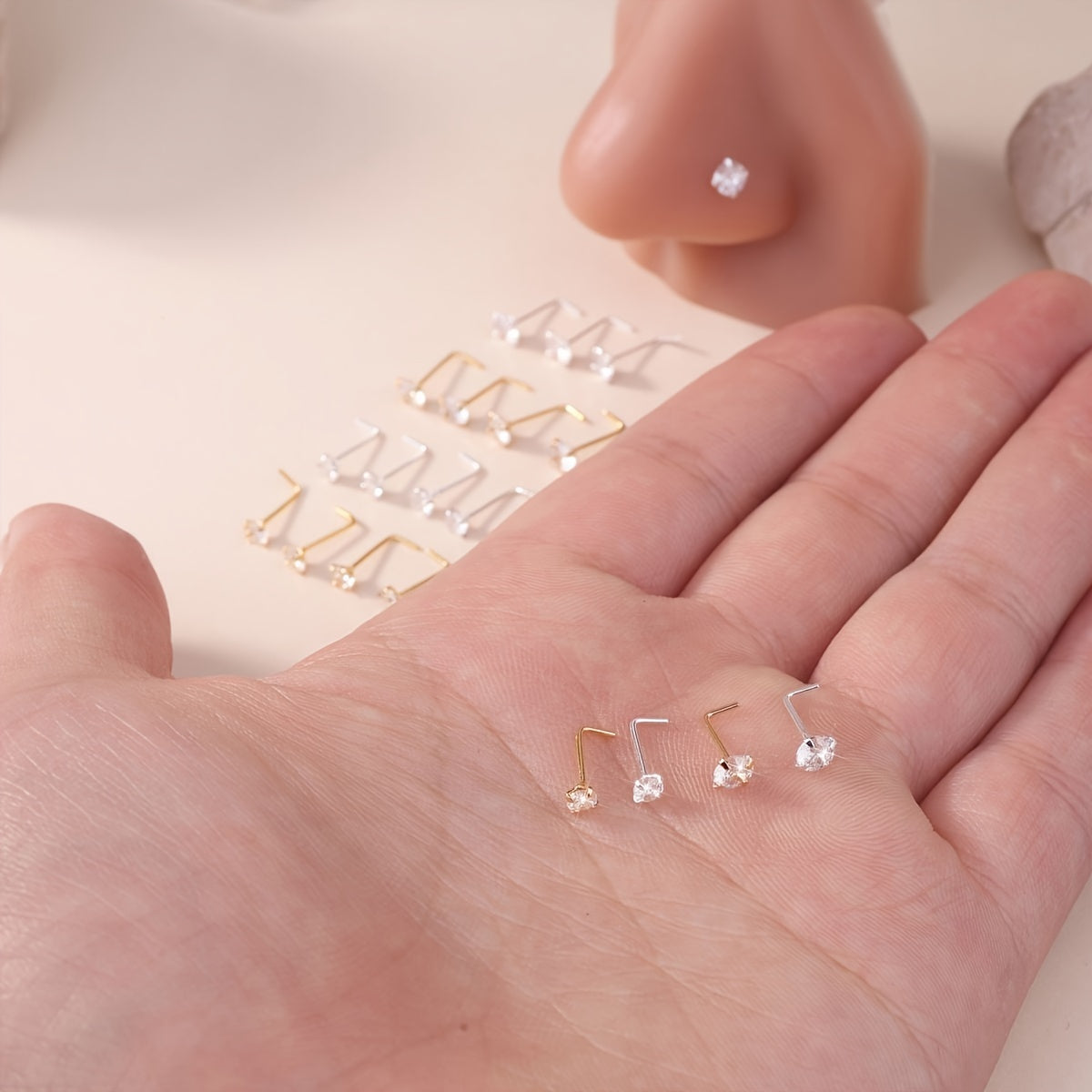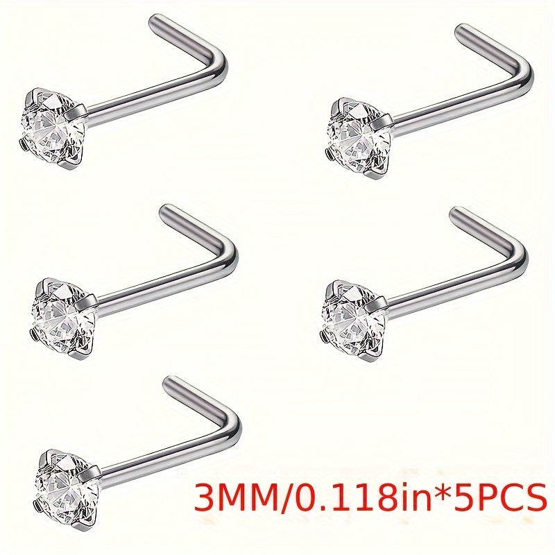 This set includes 5 nose rings and ear studs. The L shaped nose nostril piercing body jewelry features 3mm CZ stones. Perfect for women and mothers!