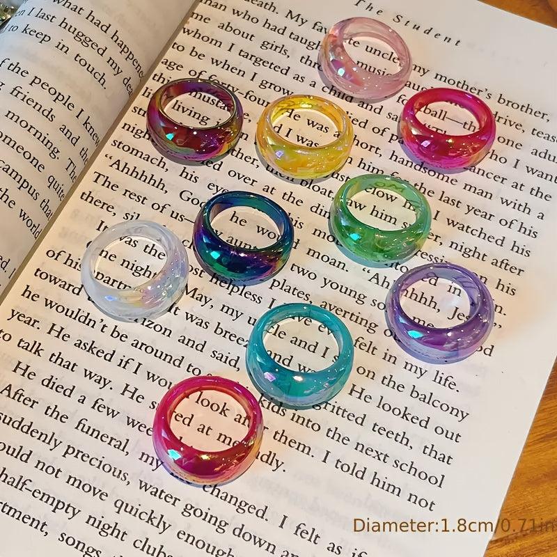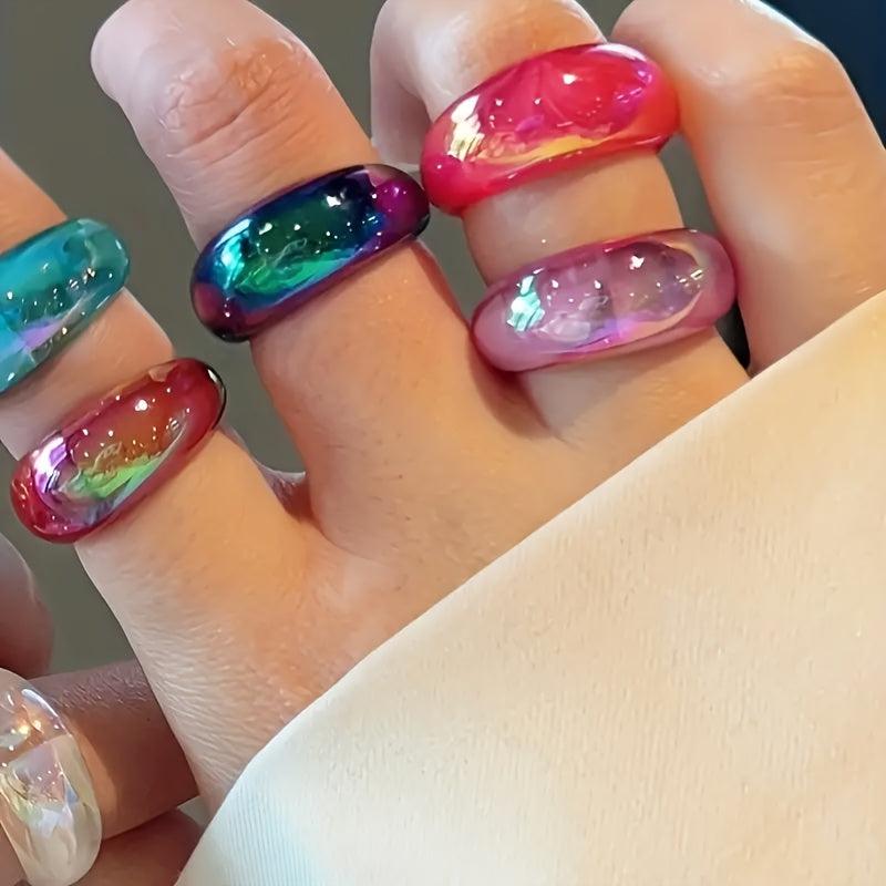Elevate your style with this 6pcs pack of trendy mixed resin rings. Each ring features a unique design with sparkling accents, perfect for parties or daily wear.