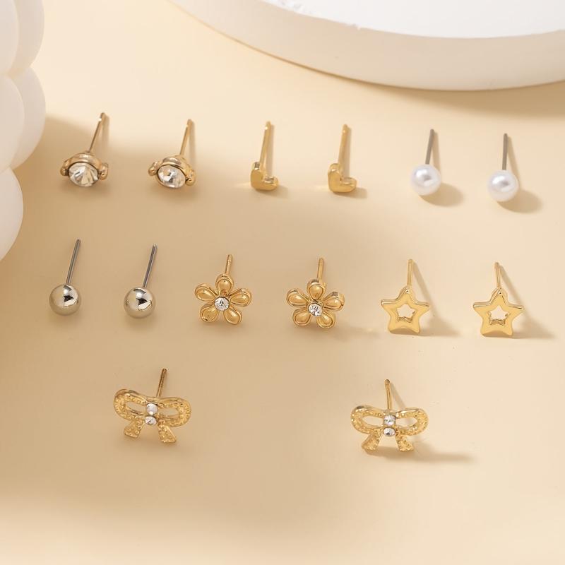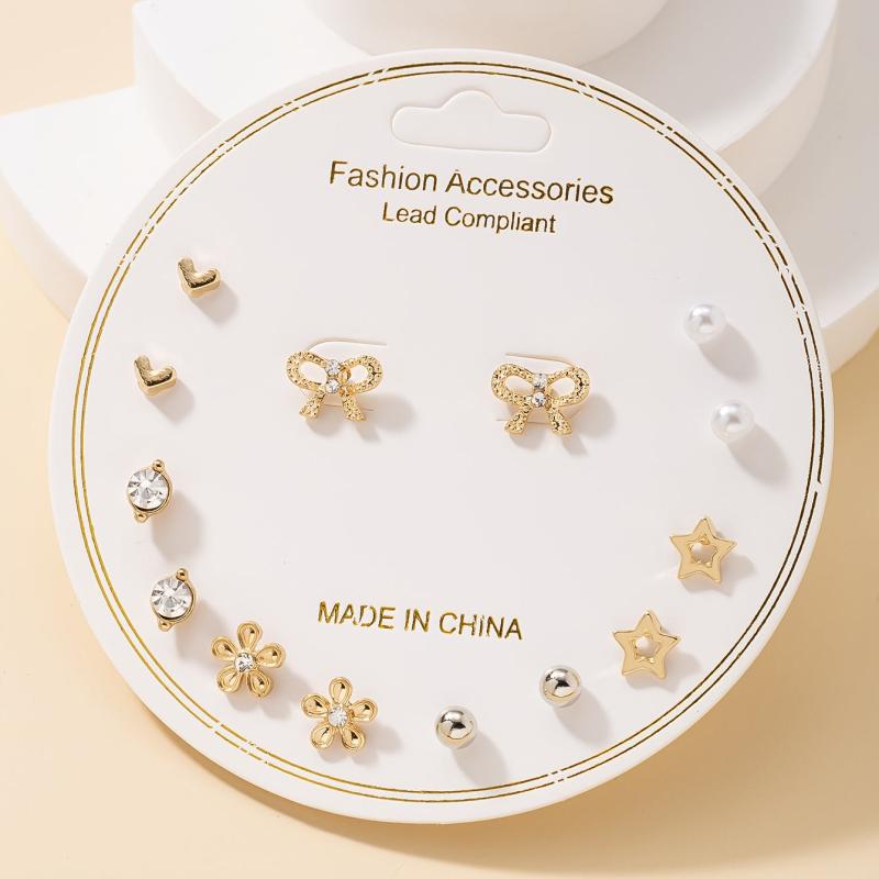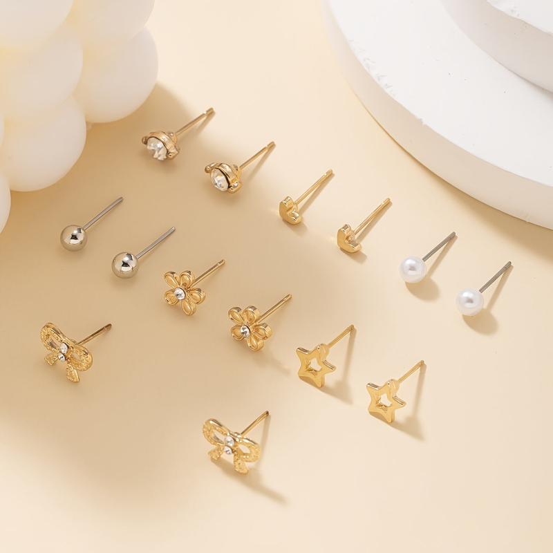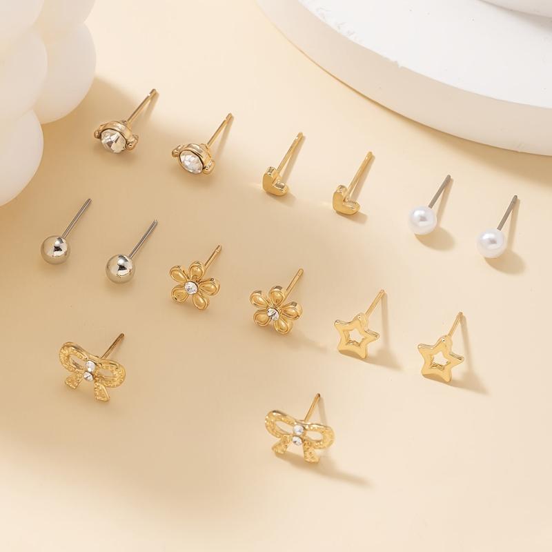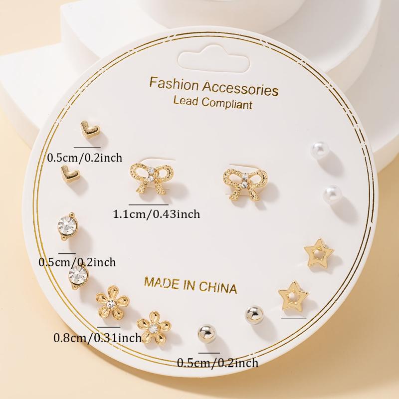 Stylish set featuring 7 pairs of fashionable metal earrings with bow, flower, star, and rhinestone designs. Perfect for daily wear or as a holiday gift.