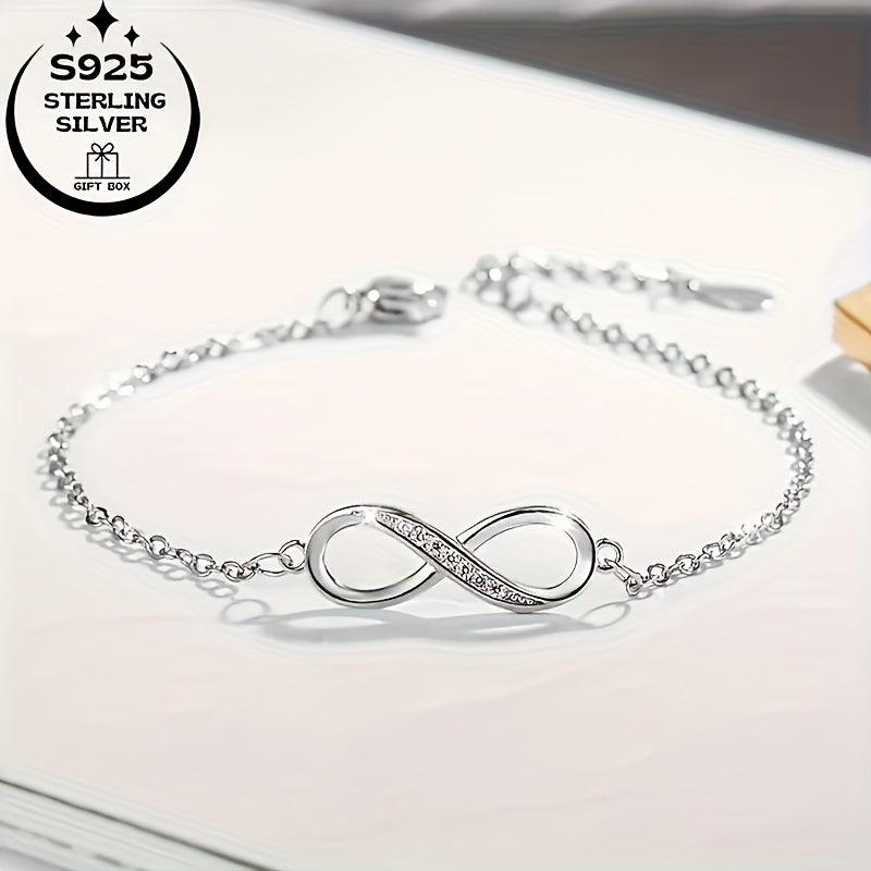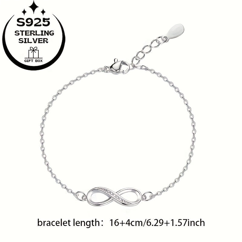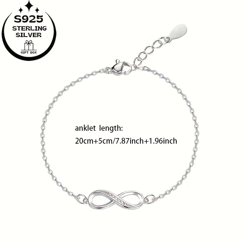 This 2pcs silver jewelry set features an infinity loop design with synthetic zirconia for a fashionable look. Set includes one bracelet and one anklet, perfect for updating your wardrobe.