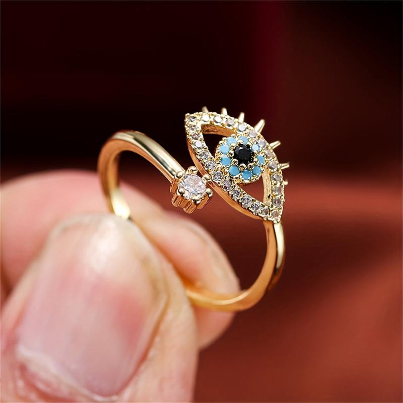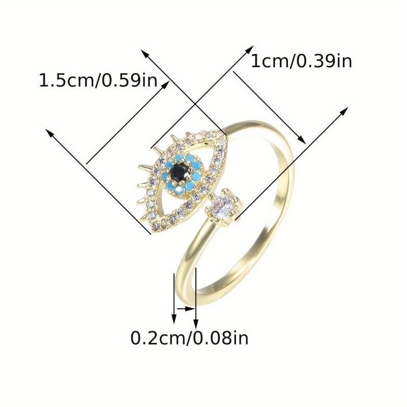 This stylish golden toned ring features a sparkling Evil Eye design with cubic zirconia, making it perfect for both daily wear and special occasions.