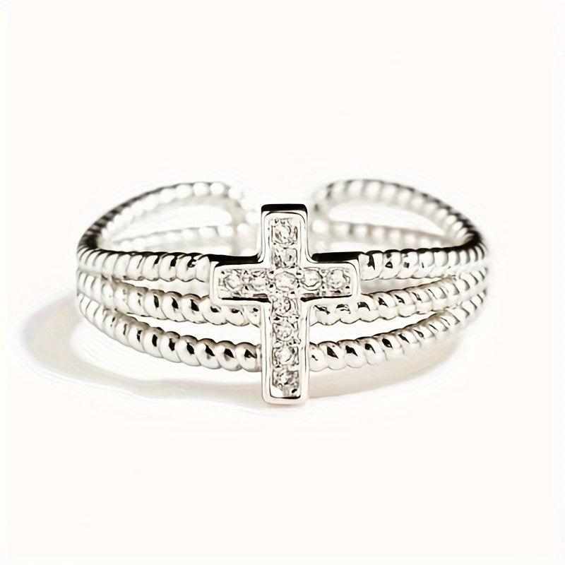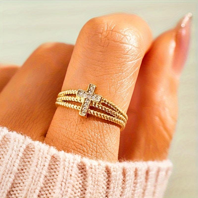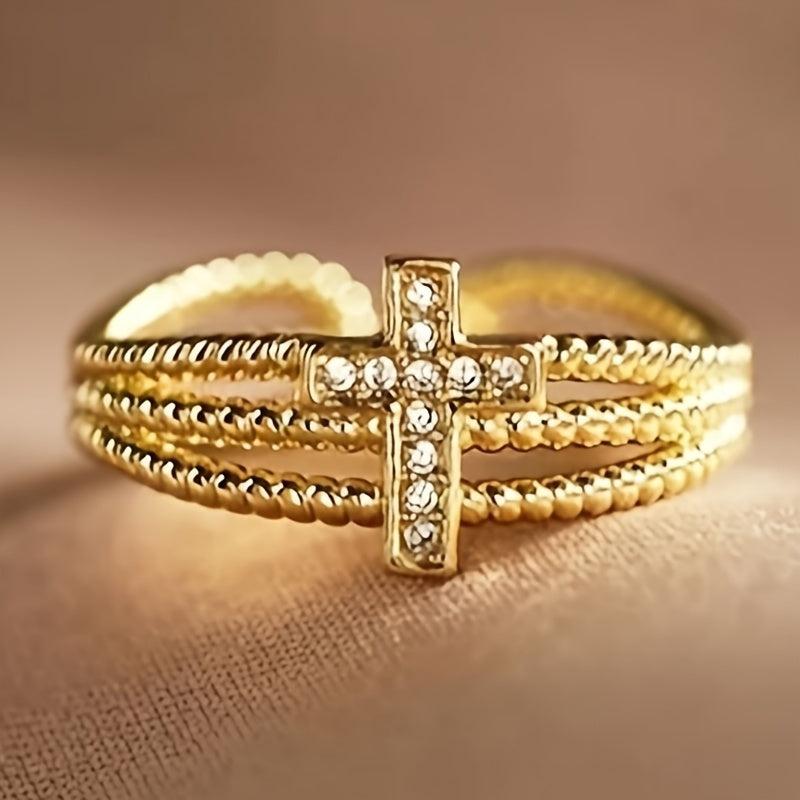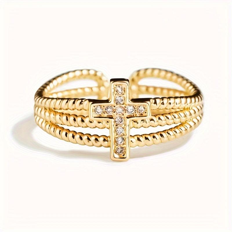 This minimalist ring features three layers with a cross design, made with KC golden plating and a synthetic stone.
