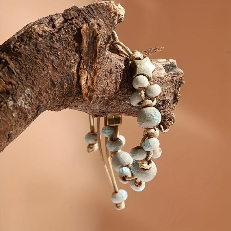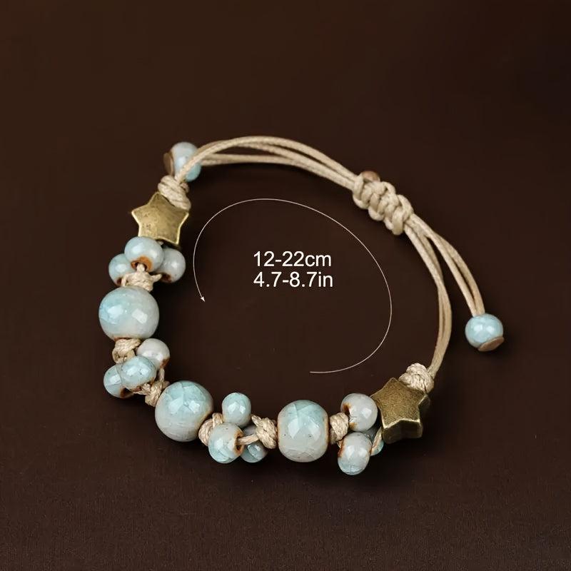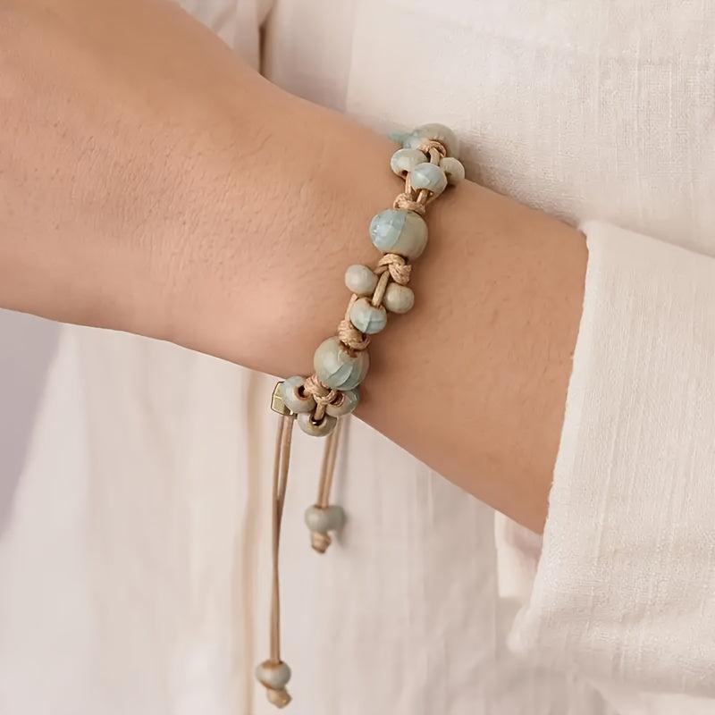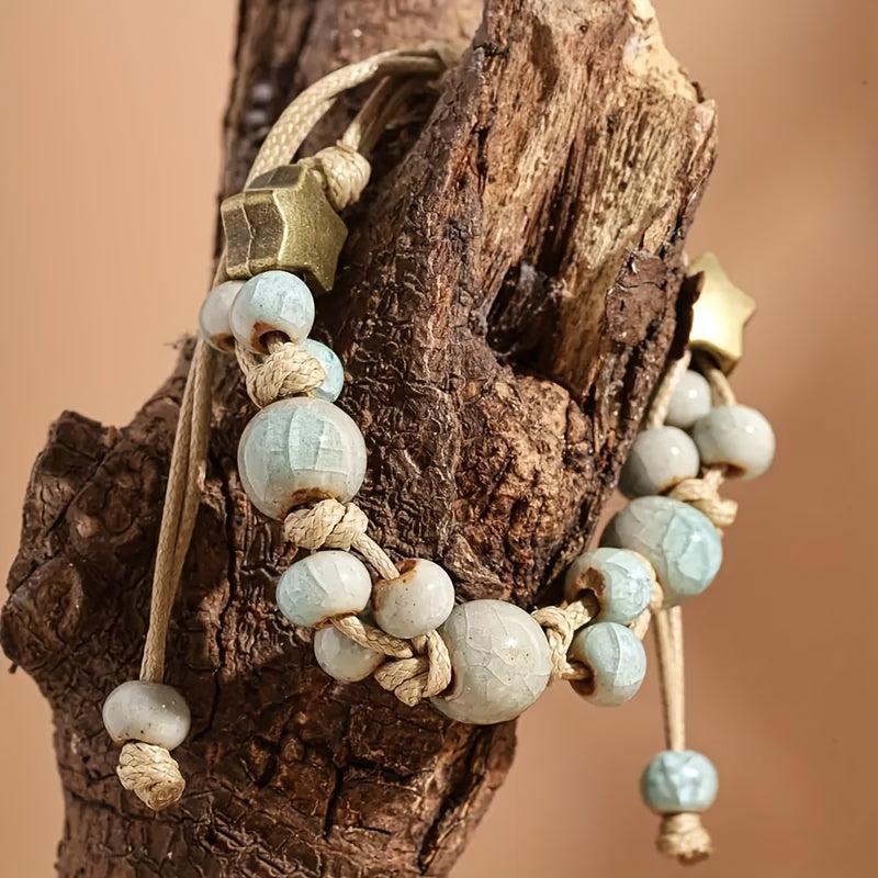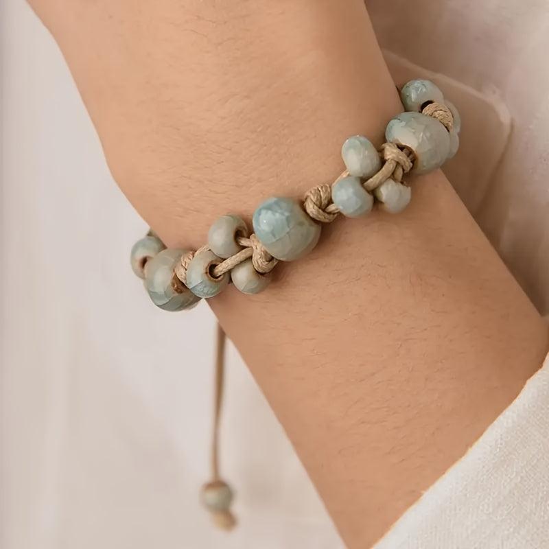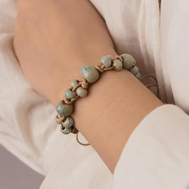 This Bohemian style bracelet features green beads and ceramic accents. It has an adjustable rope for a comfortable fit, making it perfect for daily wear or as a gift for women. This accessory is versatile and can be worn all year round.