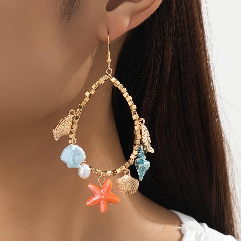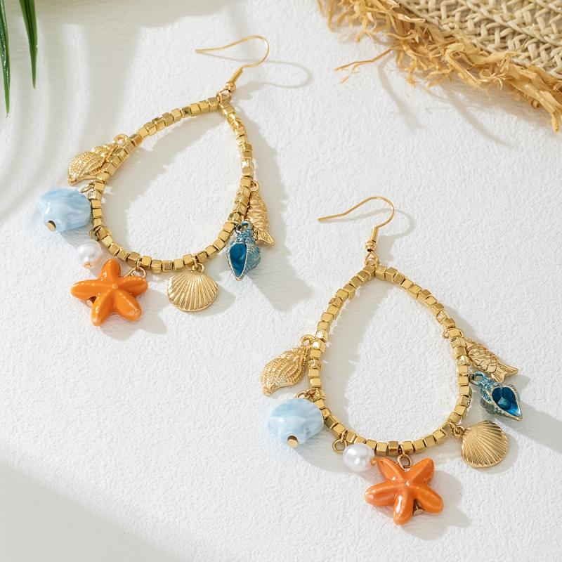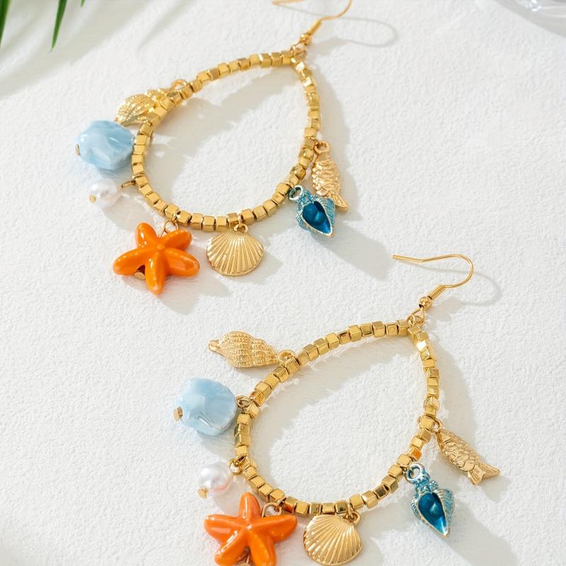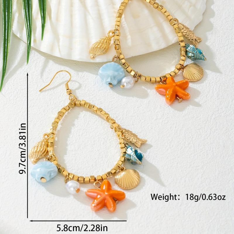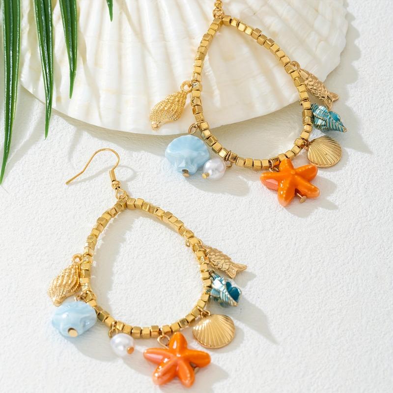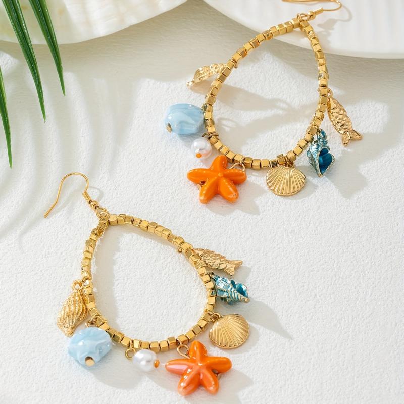 Enhance your vacation look with these 2 beautiful golden-toned necklaces featuring ceramic starfish and fish charms. Adorned with turquoise, orange, and gold accents, this boho jewelry set is perfect for beach outings.