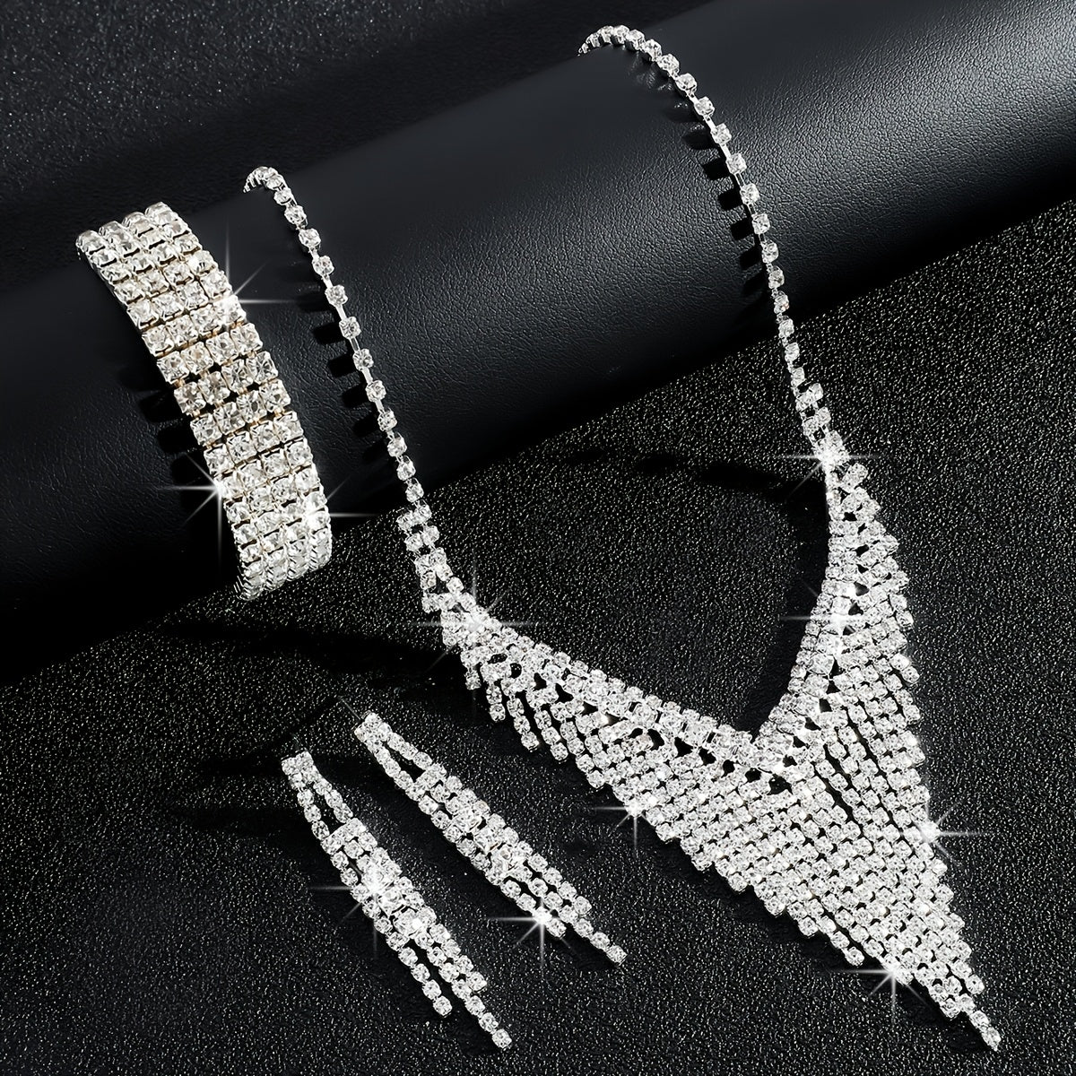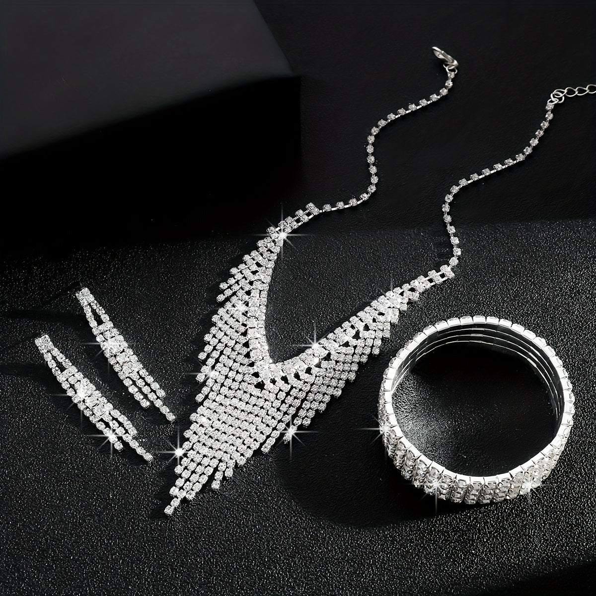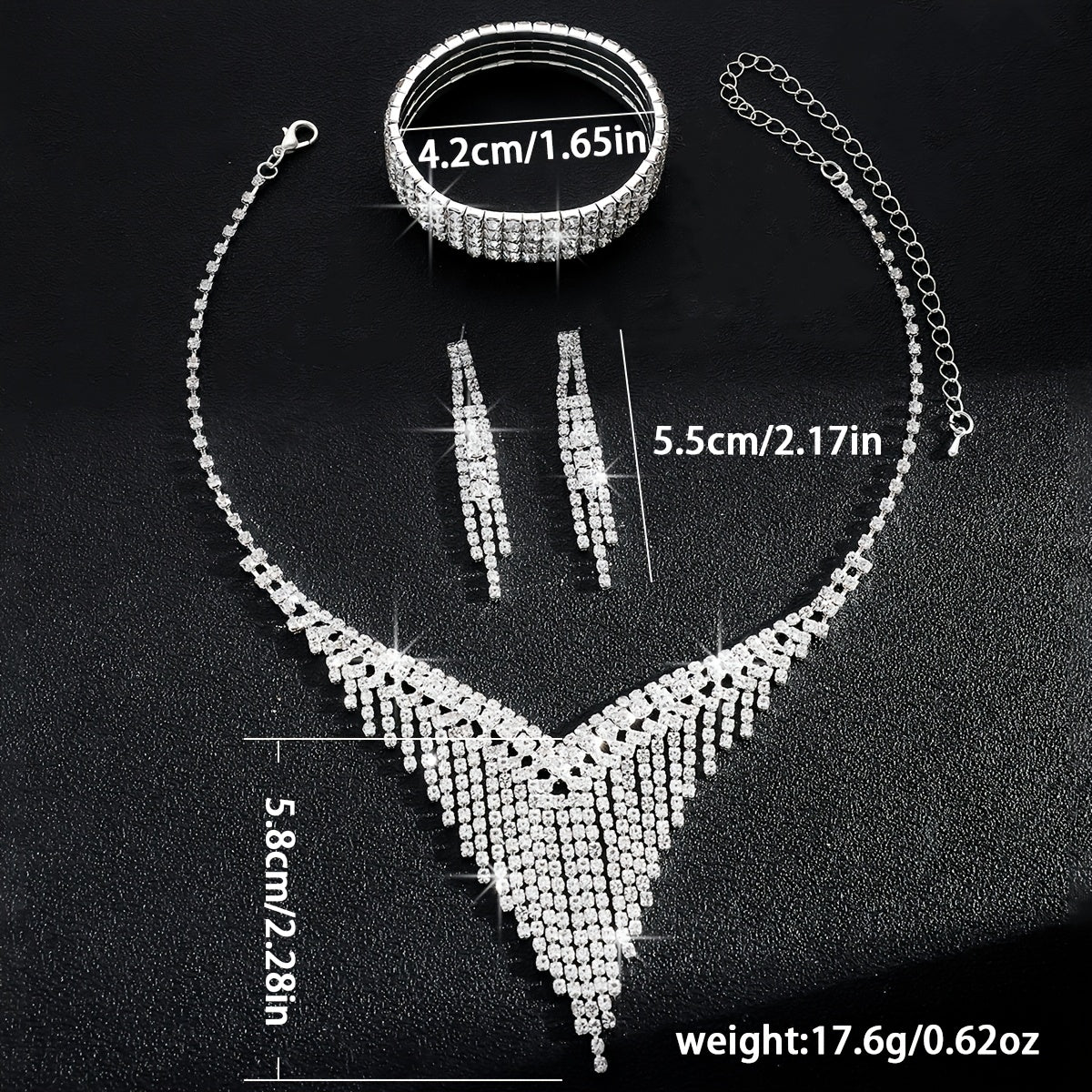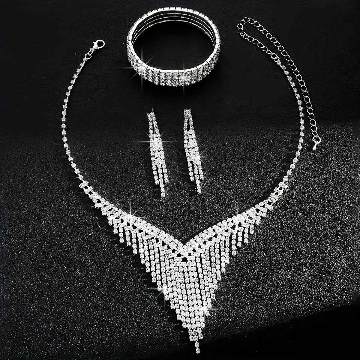 Complete your bridal look with this stunning jewelry set featuring a tassel necklace, bracelet, and earrings. Perfect for brides!