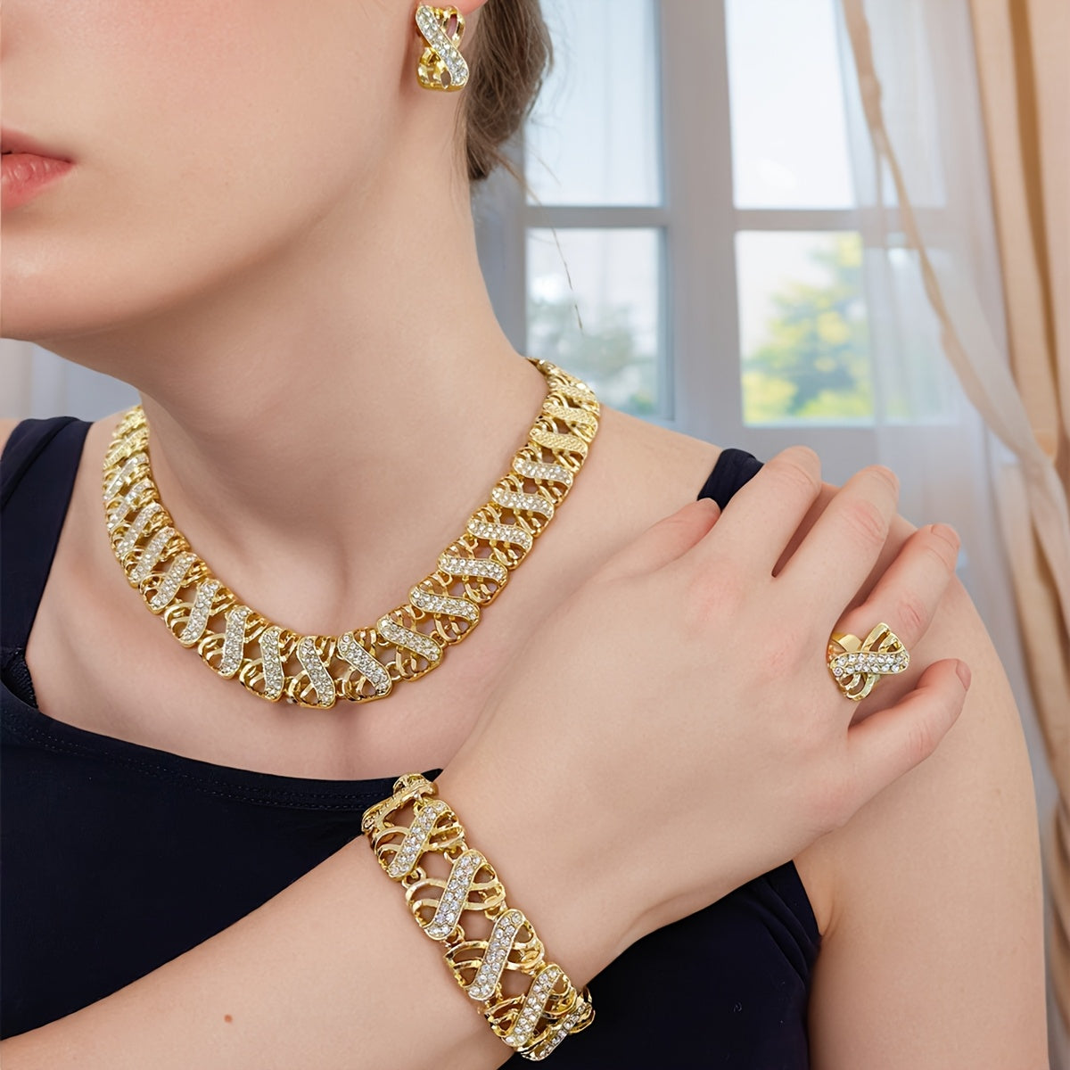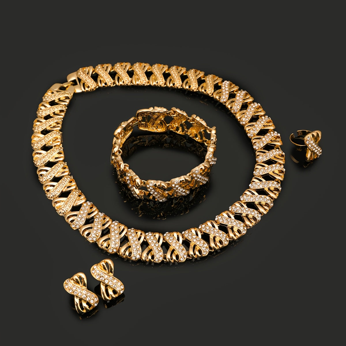 Complete your wedding look with this stylish women's jewelry set including a necklace, earrings, ring, and bracelet. Perfect for adding a touch of elegance to your ensemble.