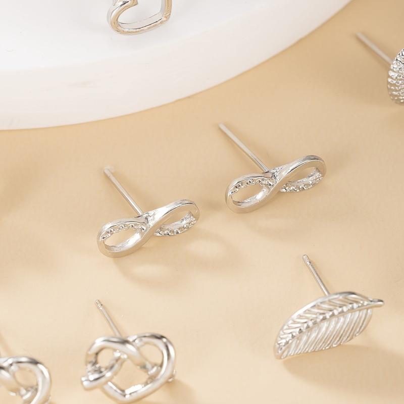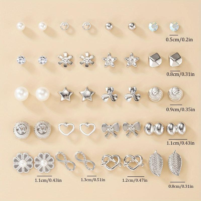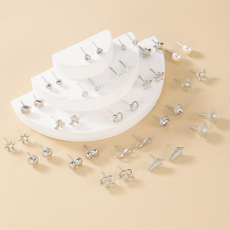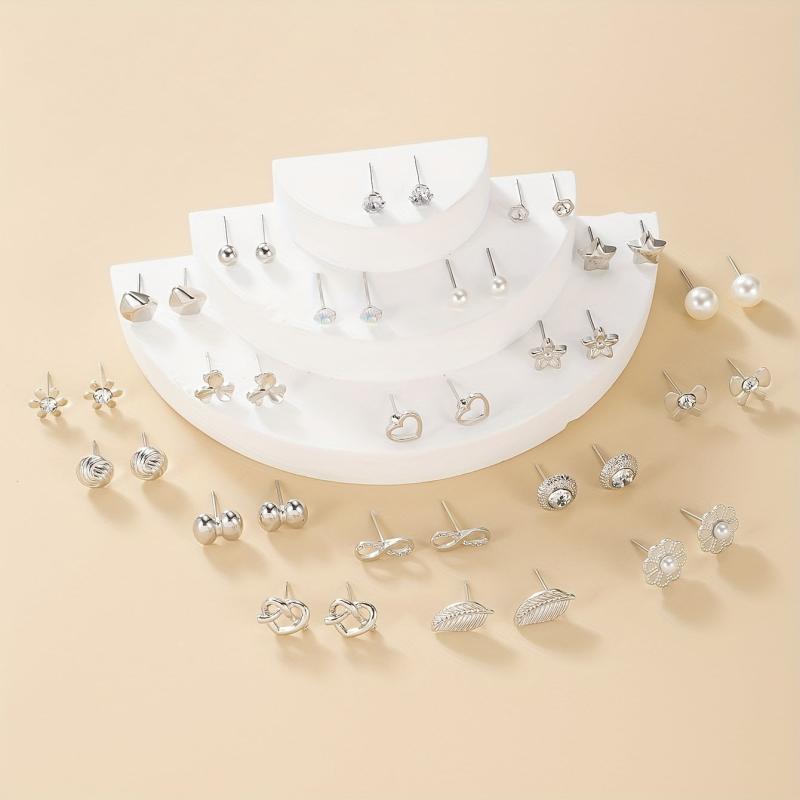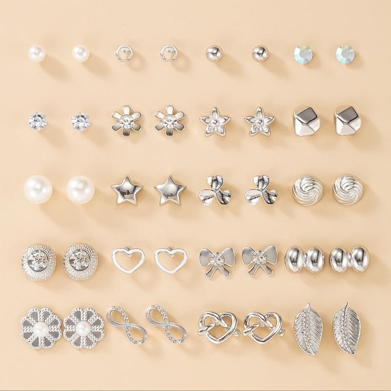 Stylish set of 20 pairs of earrings for ladies. Golden pearl heart-shaped pieces with water drill and leaf geometric designs. Ideal holiday gift jewelry.