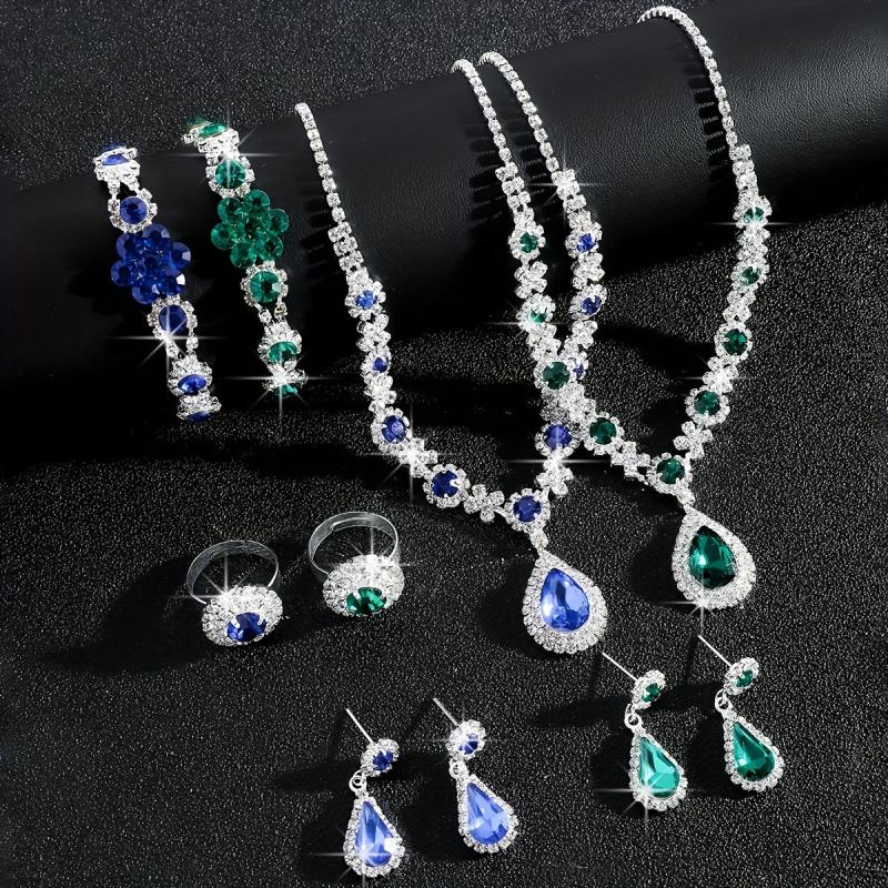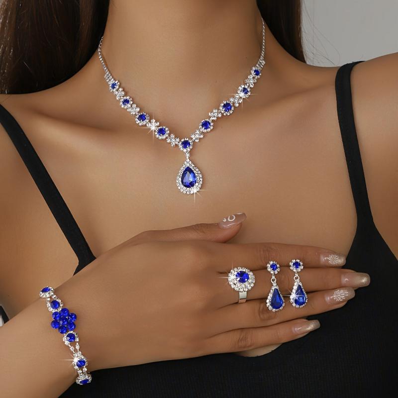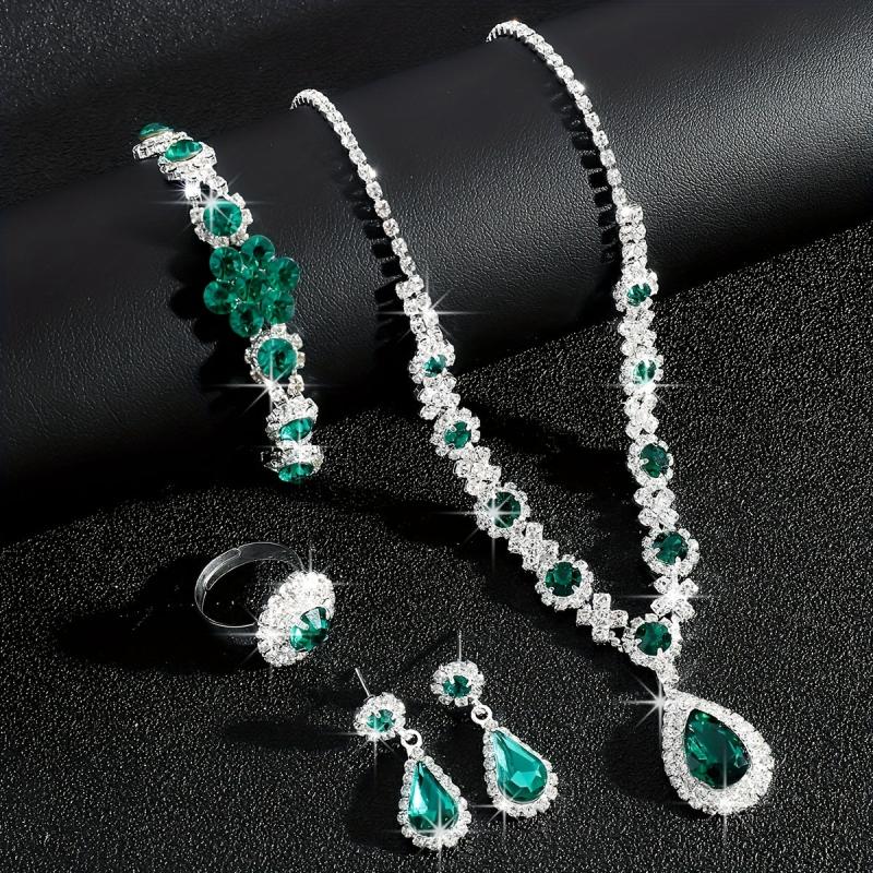 Complete your elegant look with this stunning set featuring a necklace, bracelet, earrings, and ring. Made with copper base and intricate floral teardrop design, accented with sparkling rhinestones. Perfect for weddings, photography sessions, and formal events.