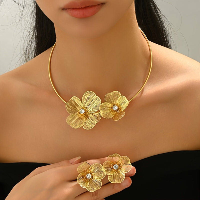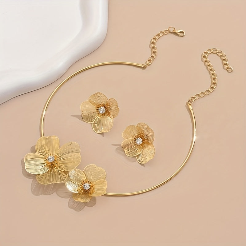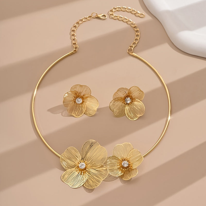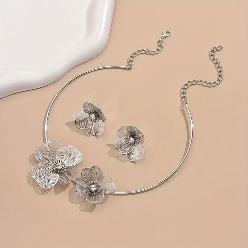 Geometric 3D Flower Earrings & Choker Necklace Set for Women