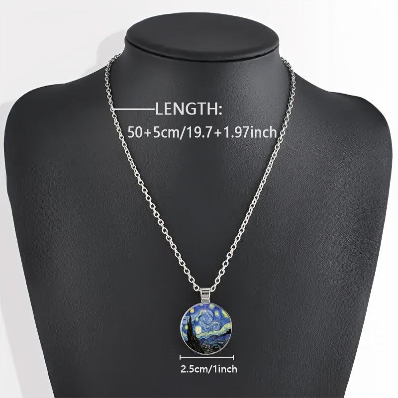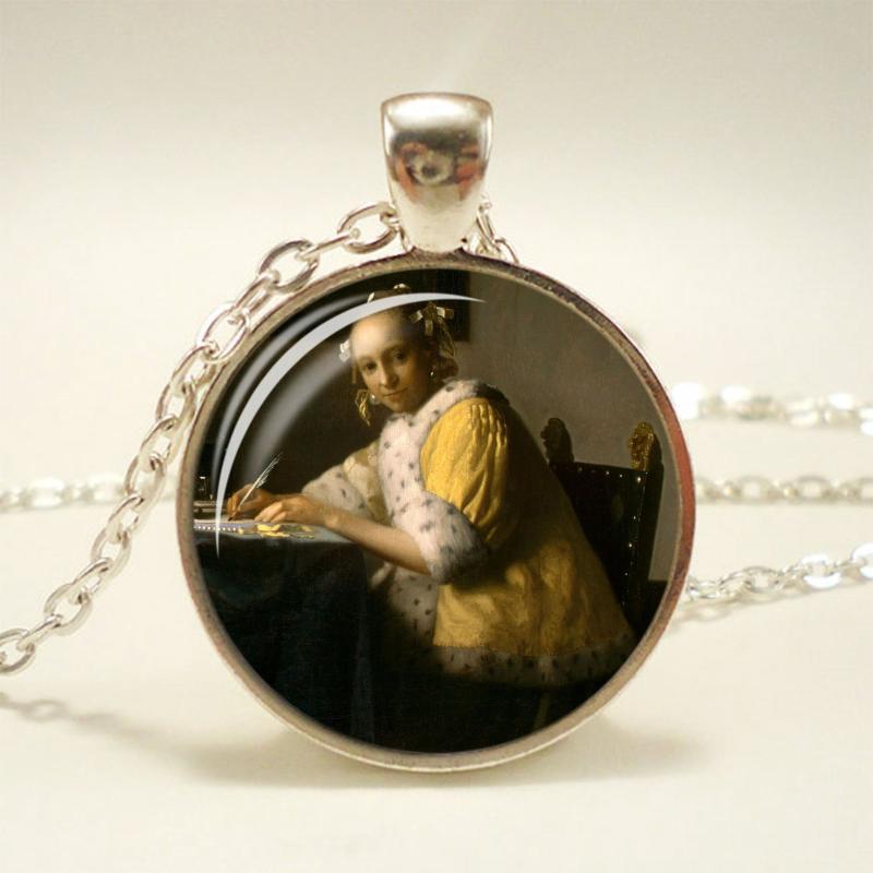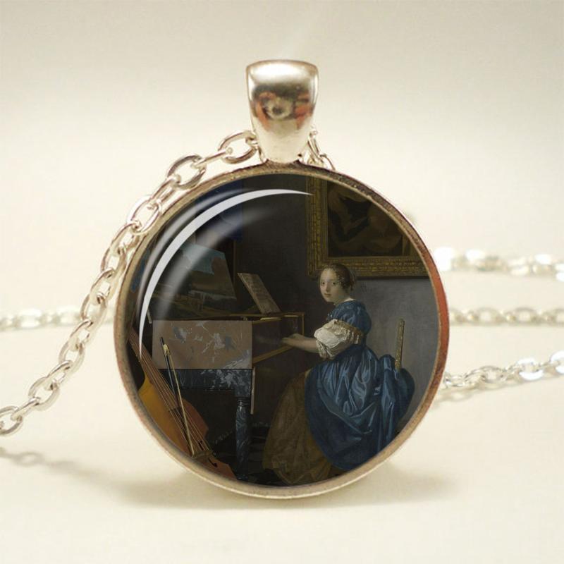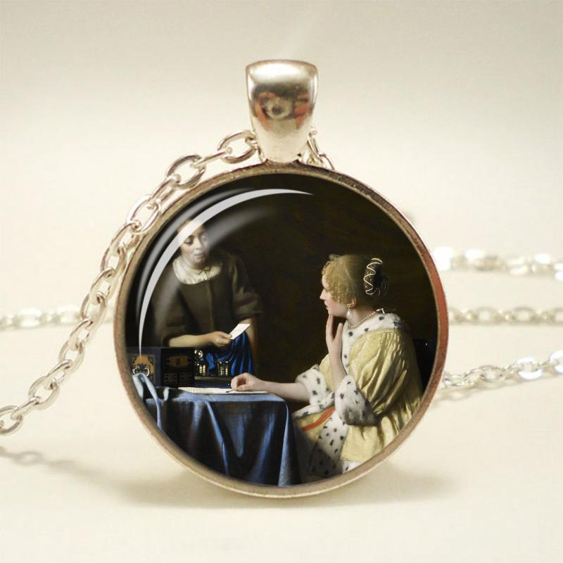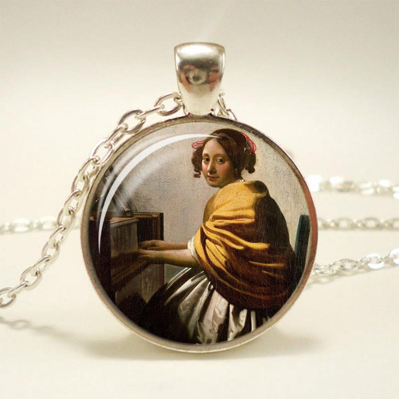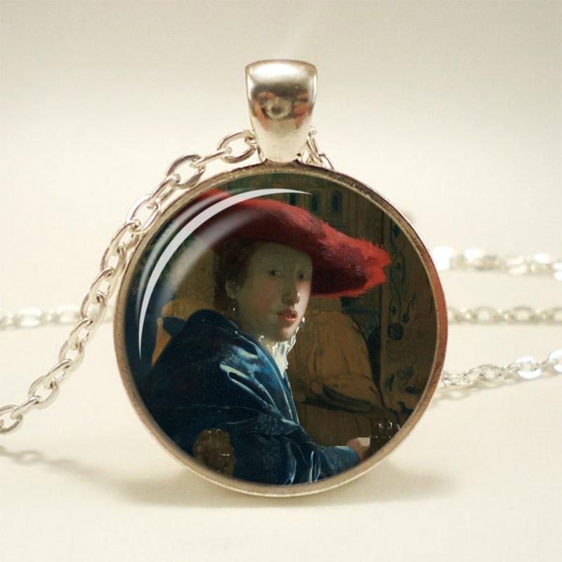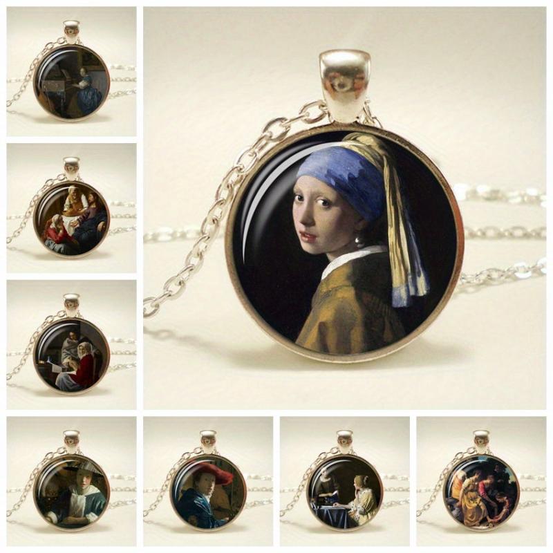 Add a touch of artistic beauty to your outfit with this exquisite pendant necklace featuring a Johannes Vermeer art picture design. The silvery chain necklace is perfect for art enthusiasts and makes a stylish accessory.