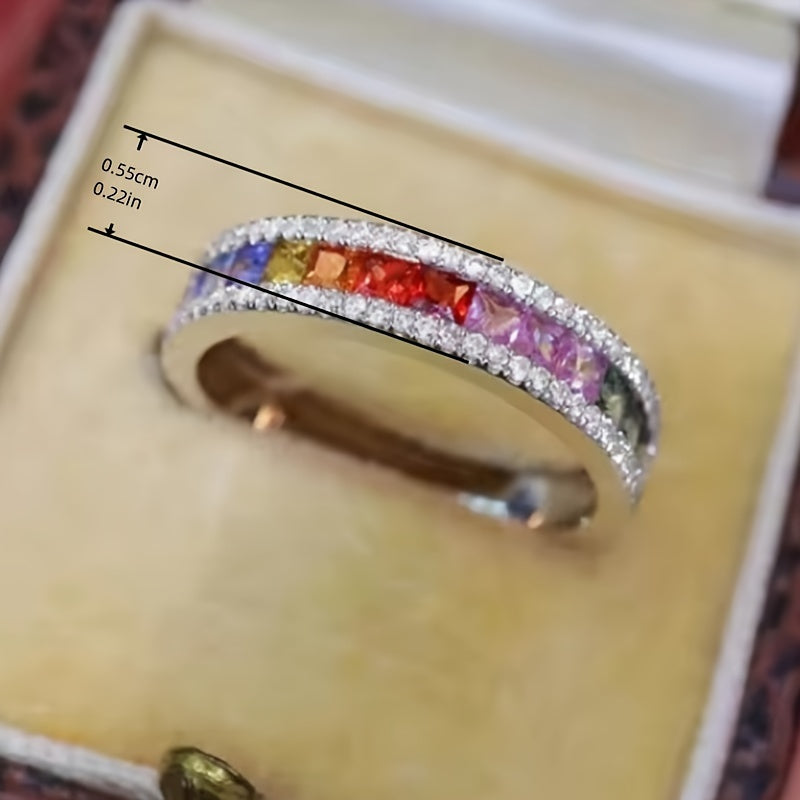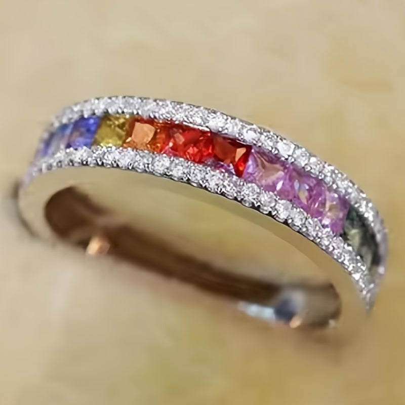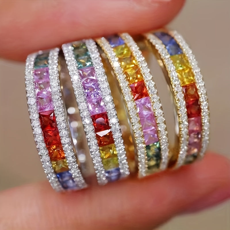 Elevate your style with this stunning rainbow-colored zirconia three stone ring. The classic design and golden plating make it perfect for everyday wear or special occasions. An ideal gift for anyone who loves minimalist and versatile jewelry.