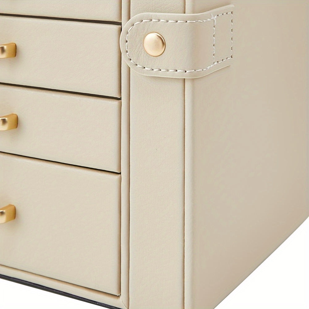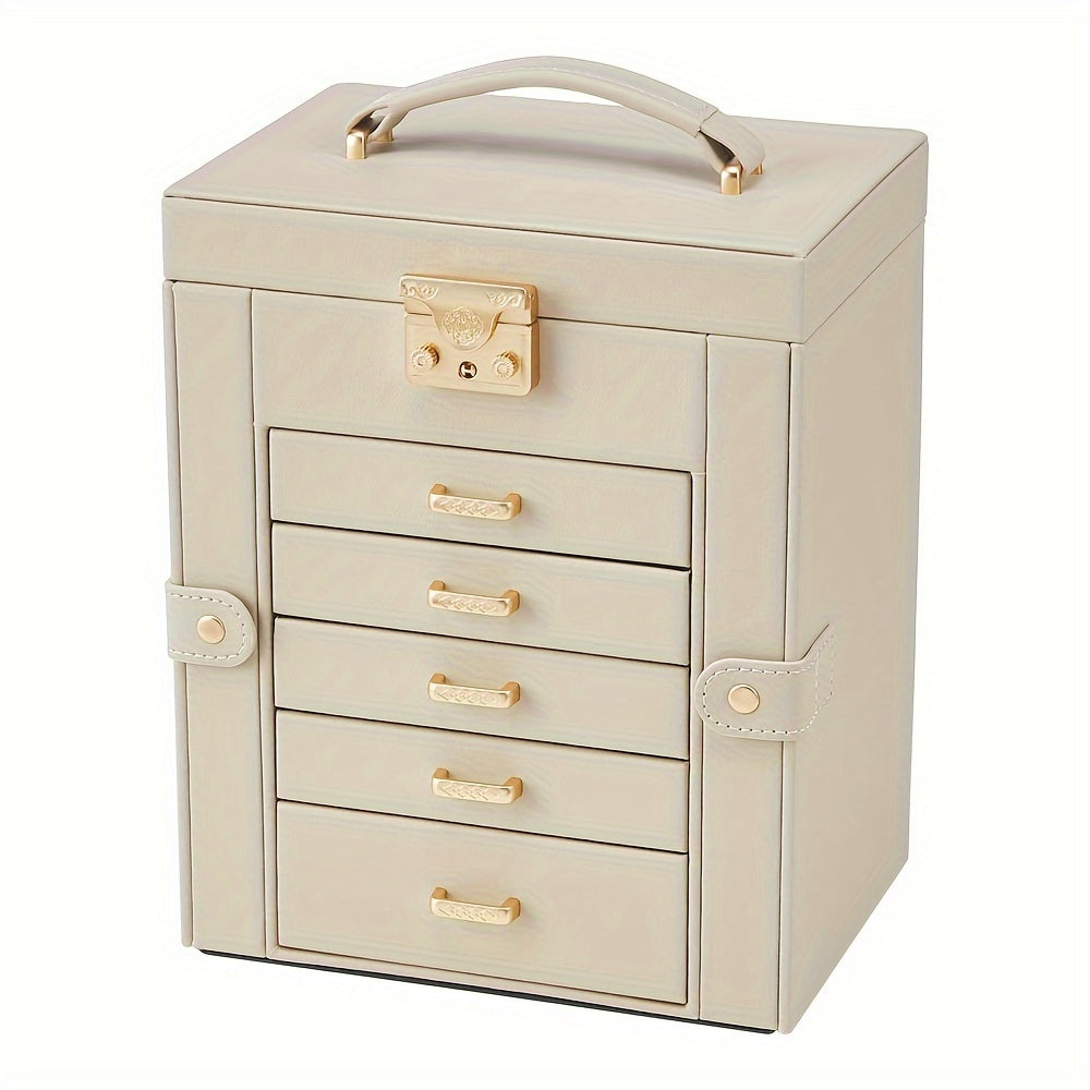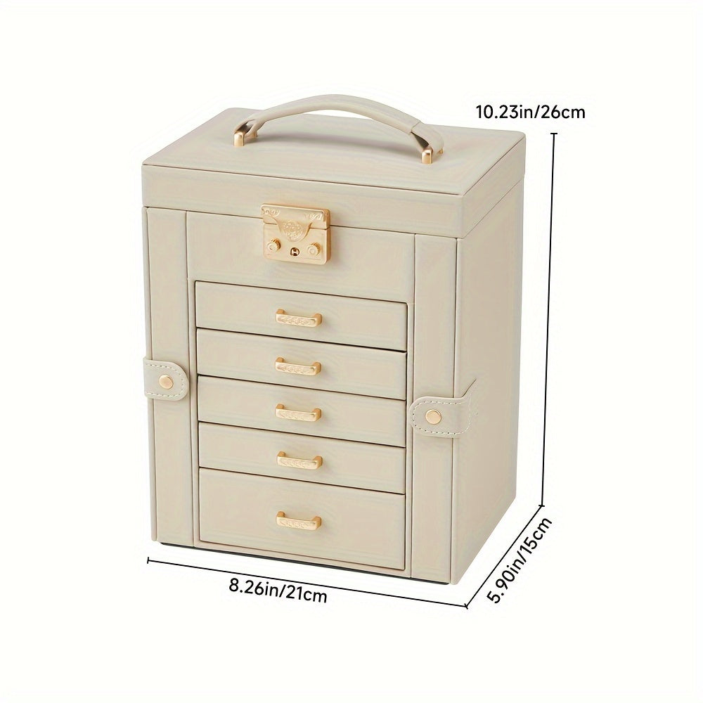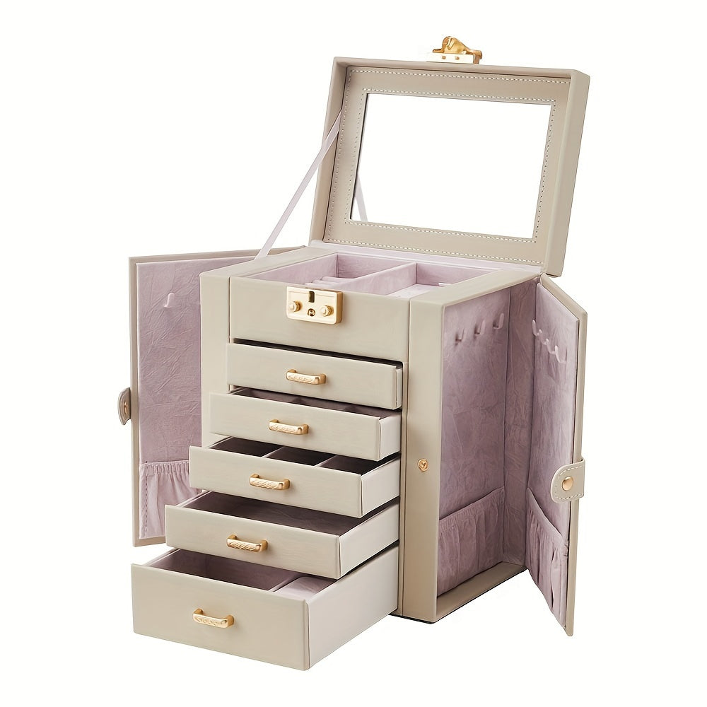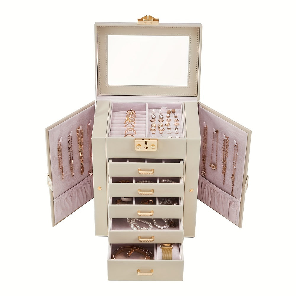 This large jewellery storage case features multiple layers and drawers to keep your earrings, necklaces, and other accessories organized. Perfect for storing and organizing your jewelry collection.