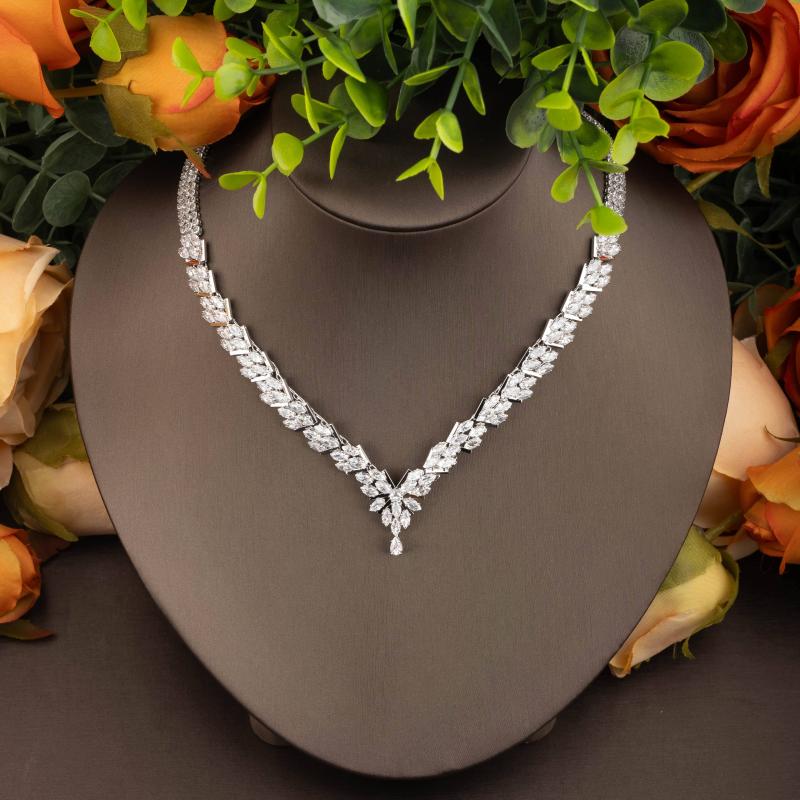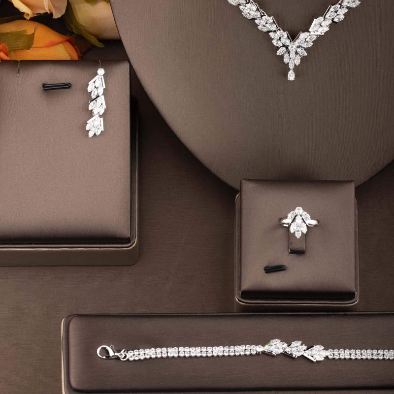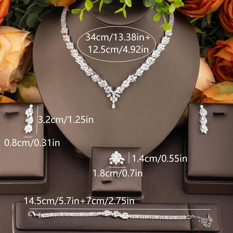 Complete your wedding look with this elegant cubic zirconia leaf shaped jewelry set. Perfect for weddings and formal events.
