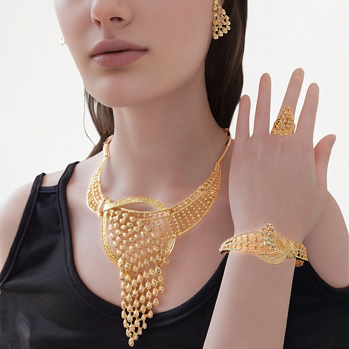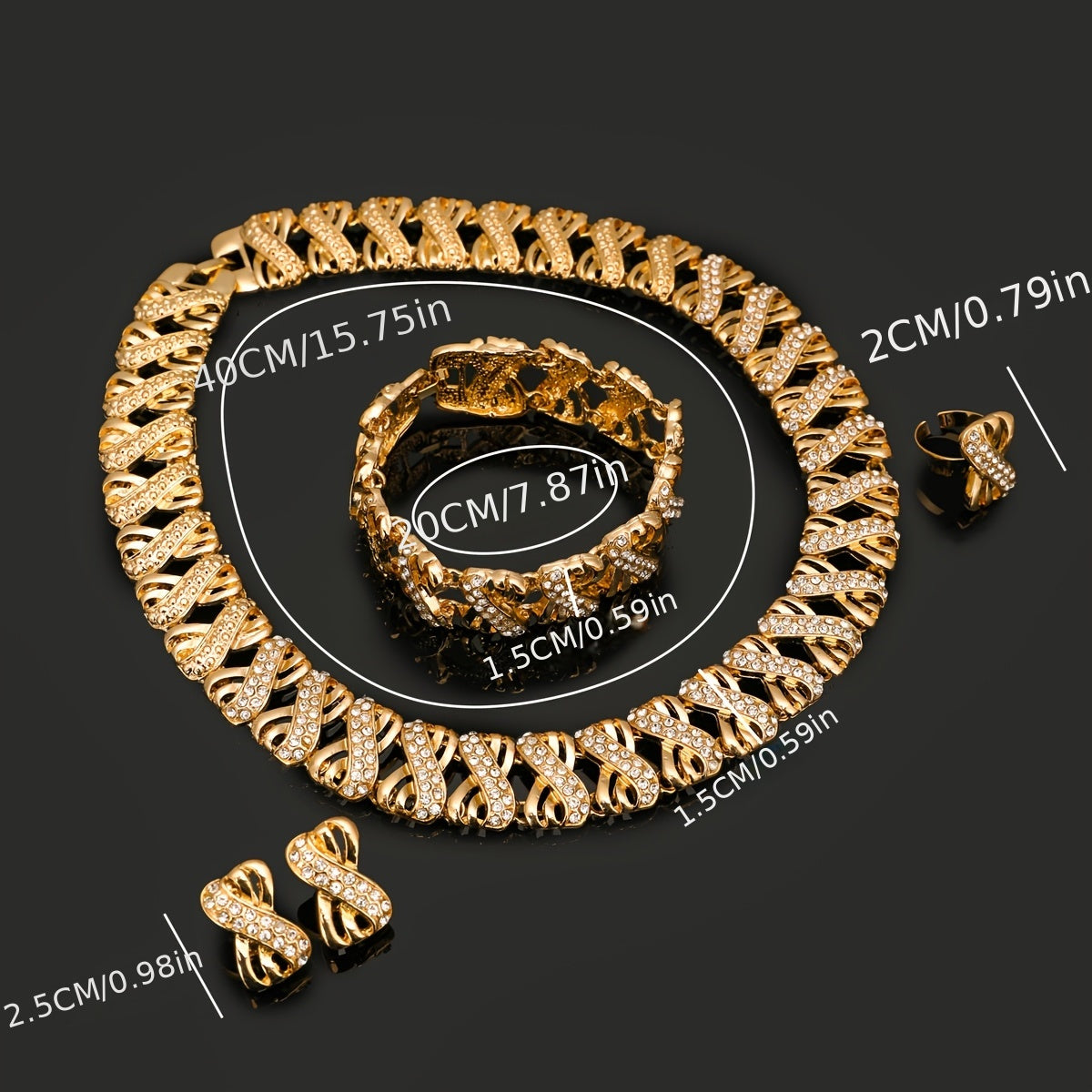 Elevate your style with this stunning rhinestone jewelry set that includes a necklace, earrings, bracelet, and ring. Perfect for parties, weddings, or everyday wear.
