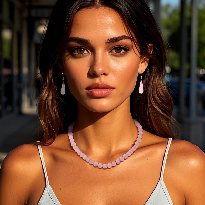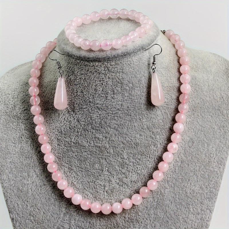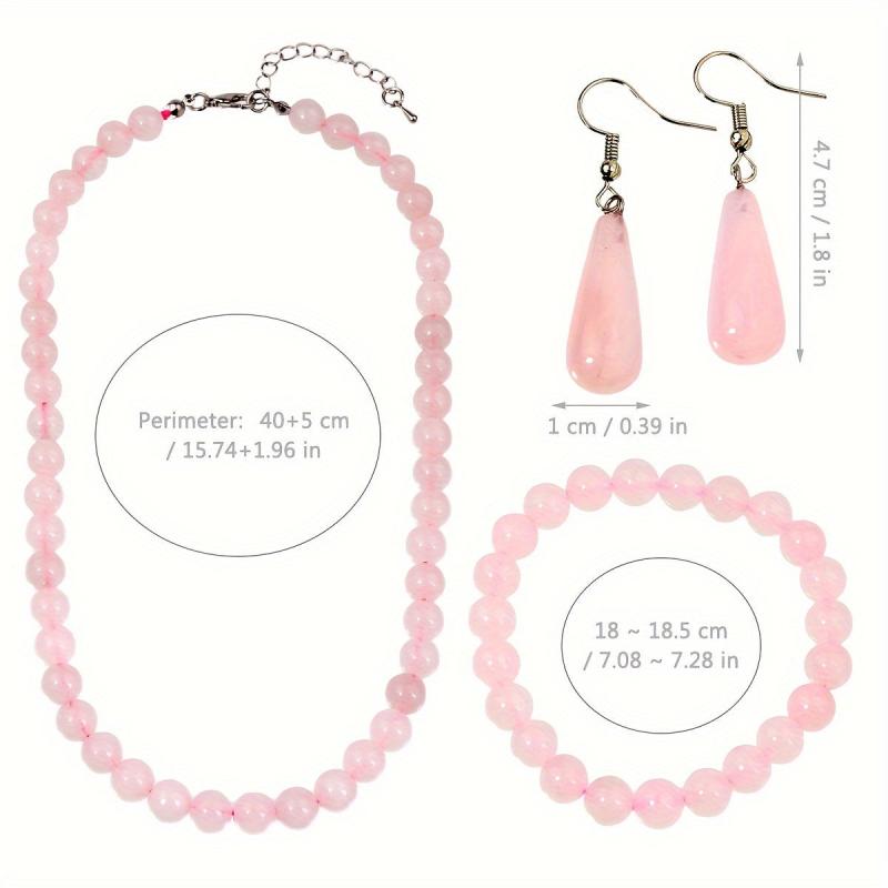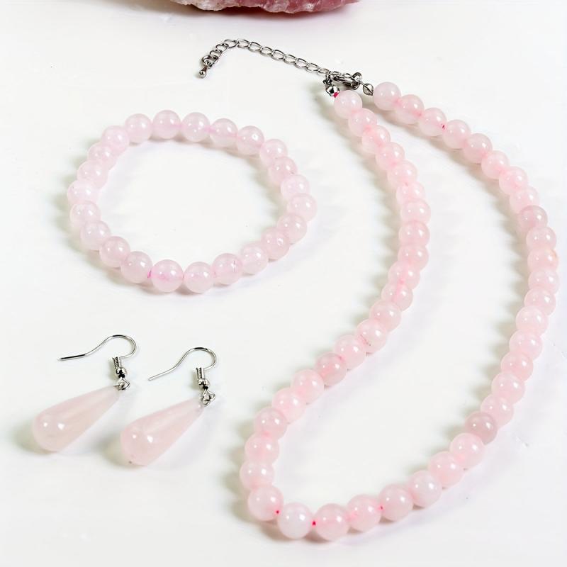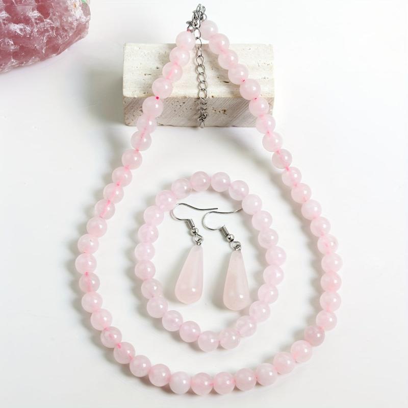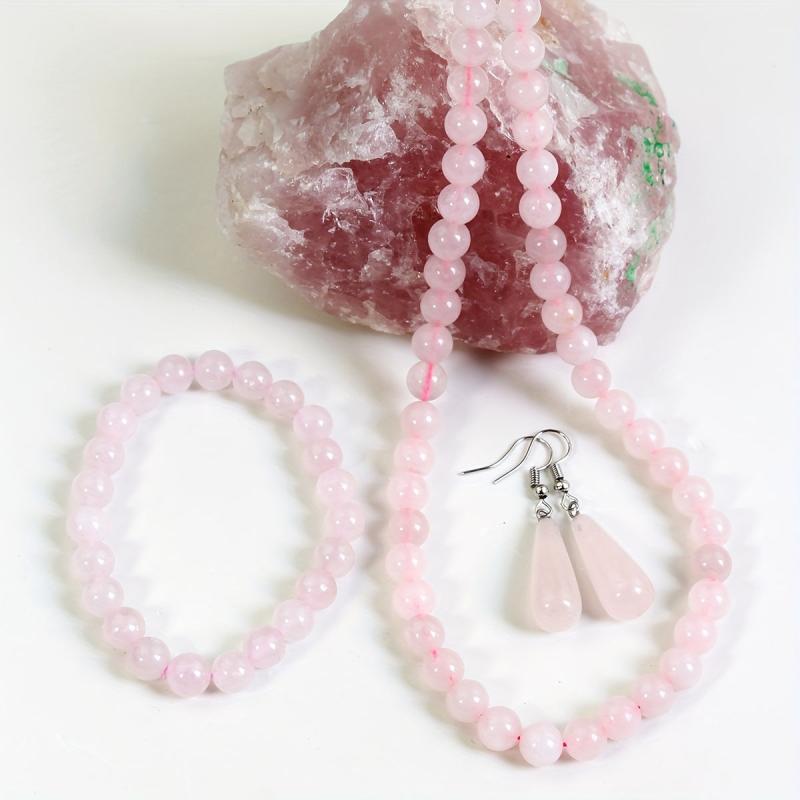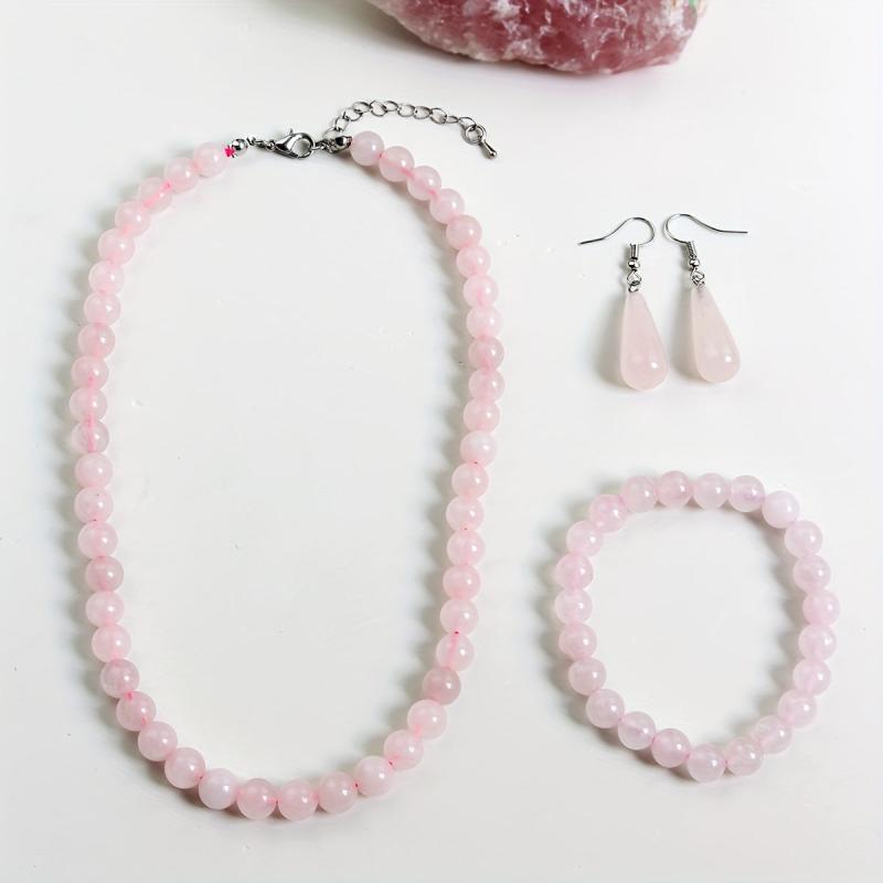 This jewelry set includes a necklace, bracelet, and earrings made of natural rose quartz beads in a bohemian style. Perfect for parties, travel, and everyday wear.