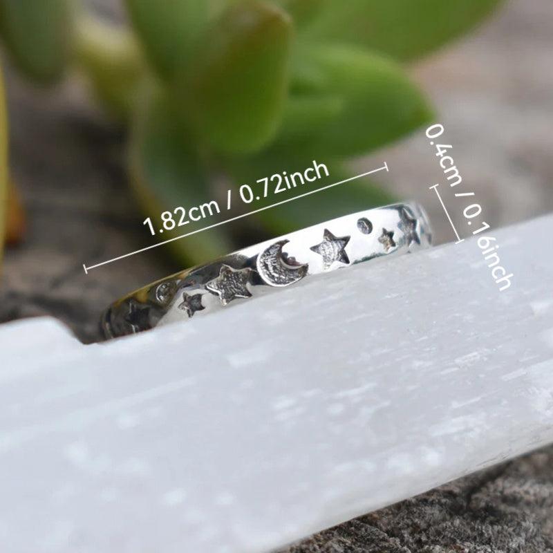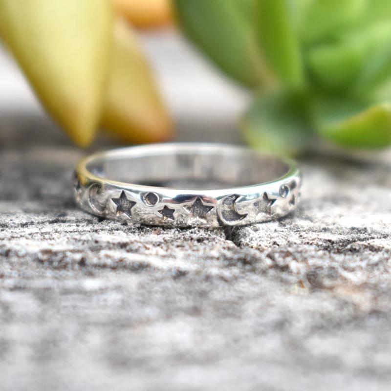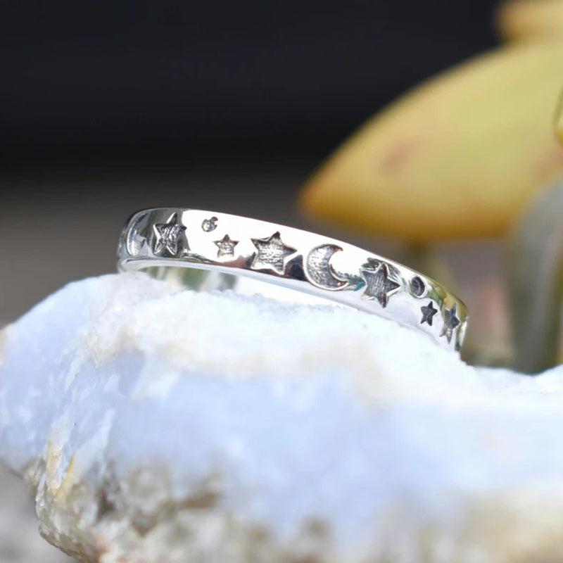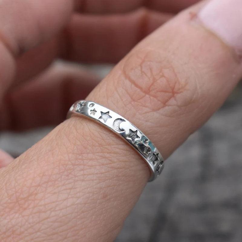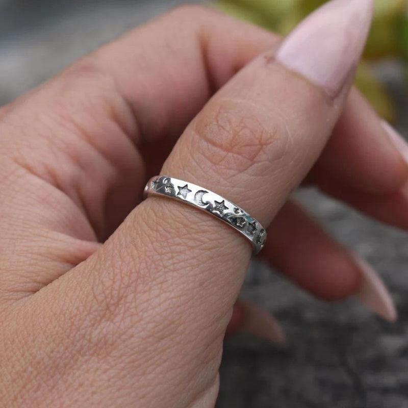This stainless steel ring features a beautiful design of moons and stars, perfect for stacking or wearing alone. It makes a great gift for any occasion.