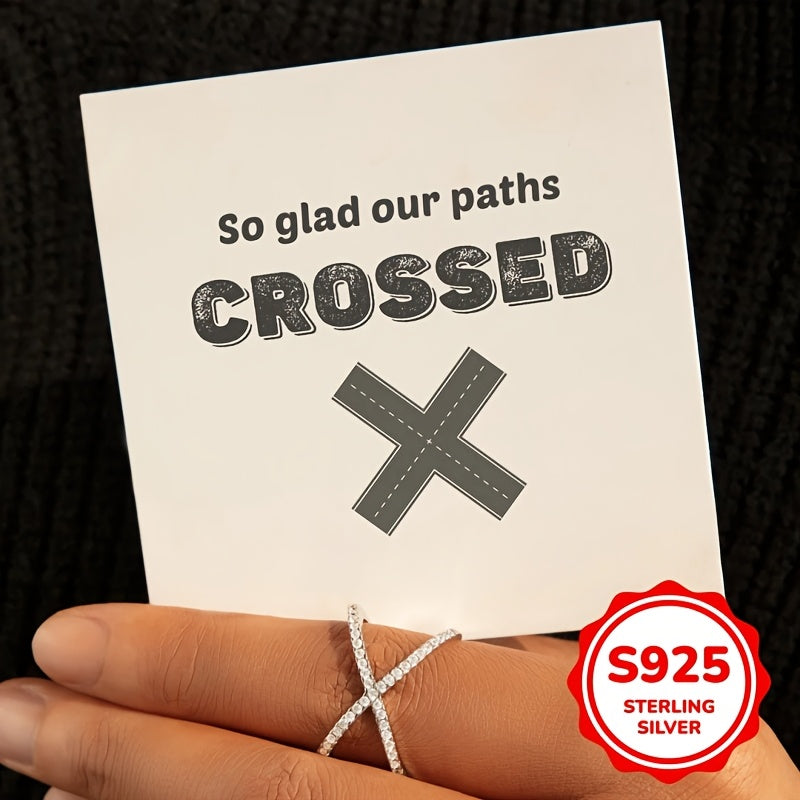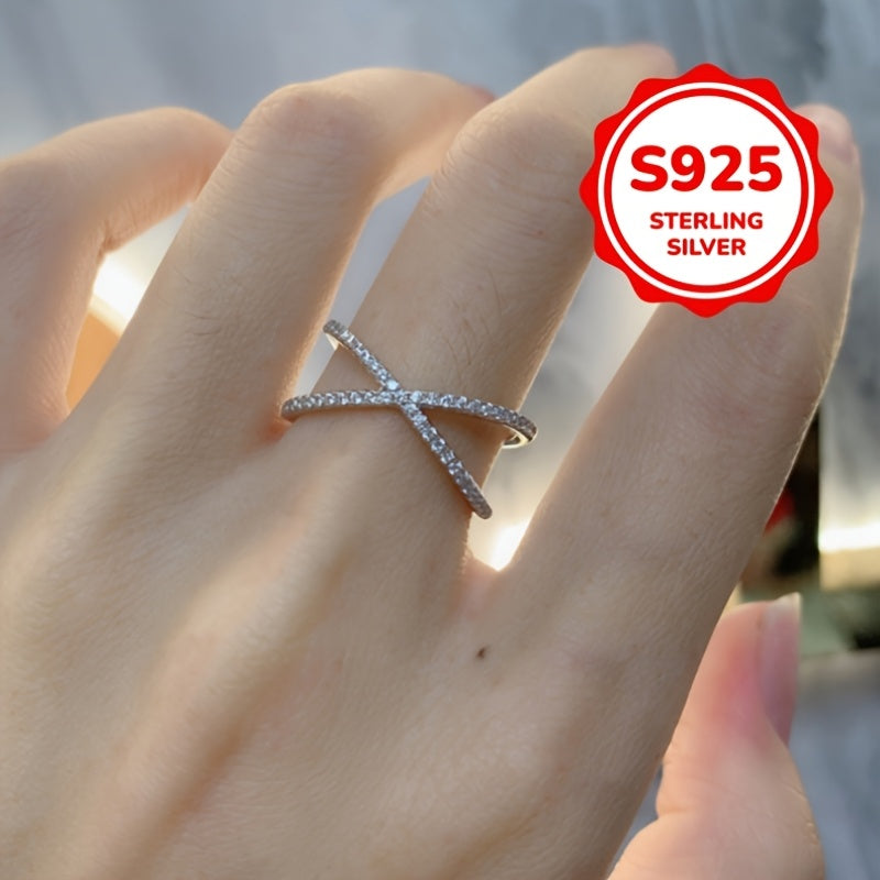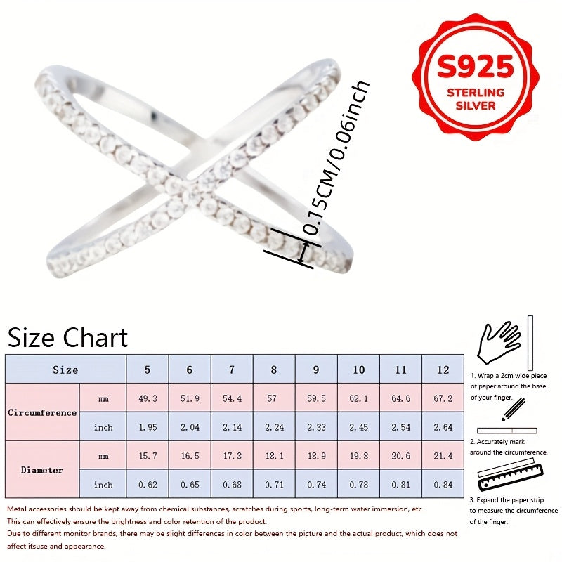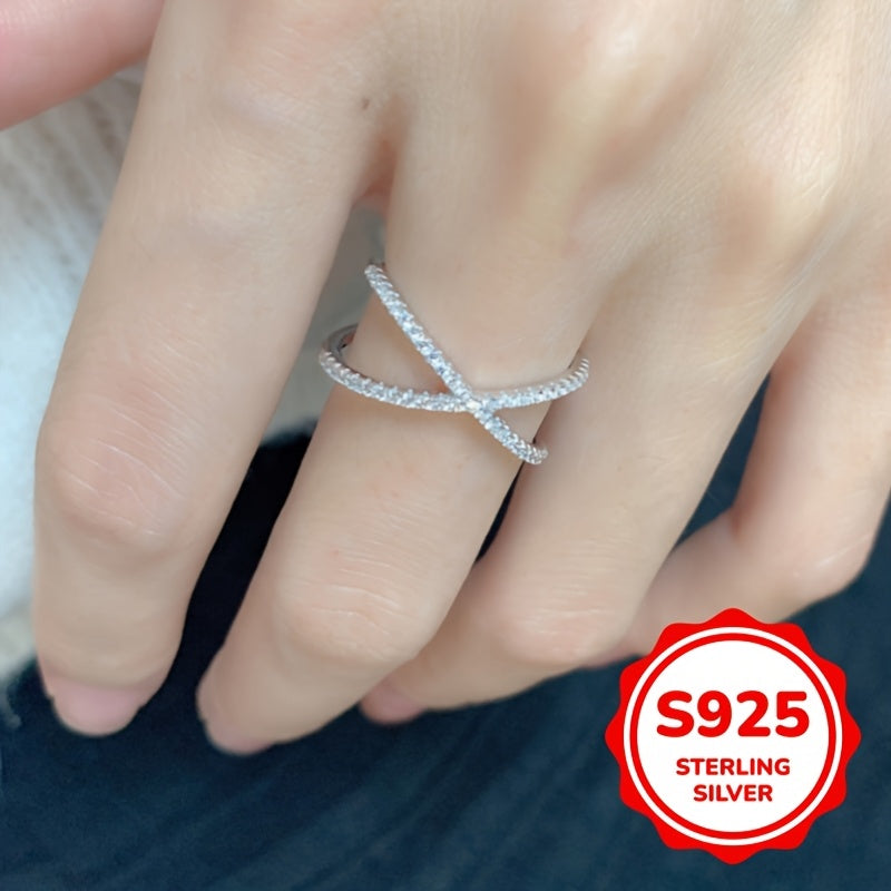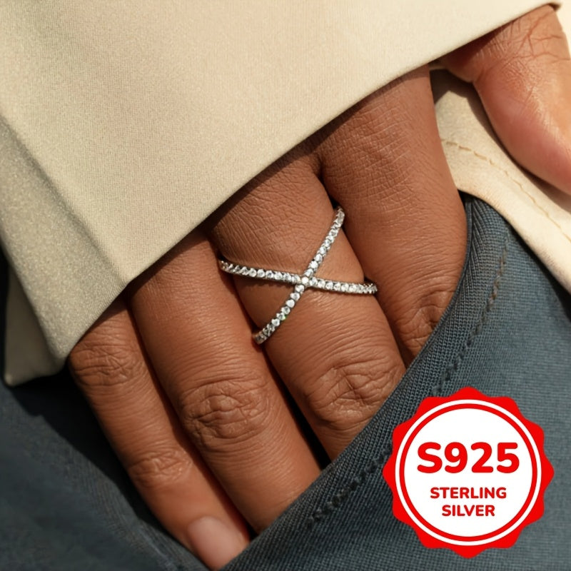 Elegant X-shaped ring made of 925 silver with synthetic zirconia. Perfect for all-season wear, weddings, and parties.