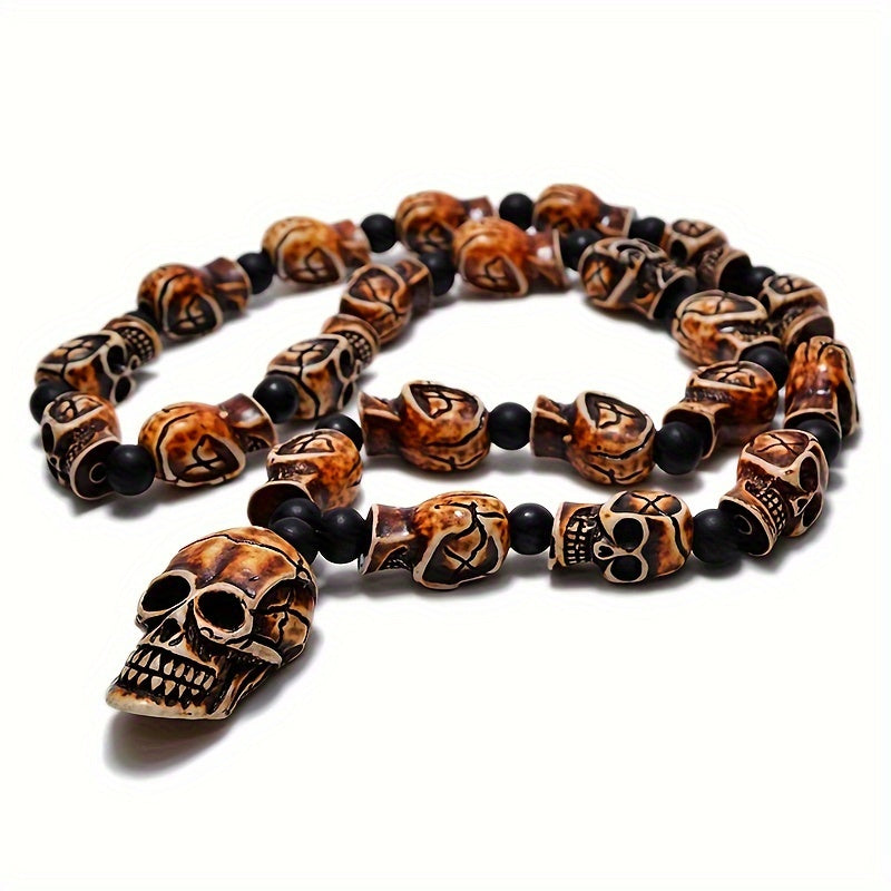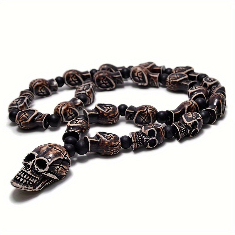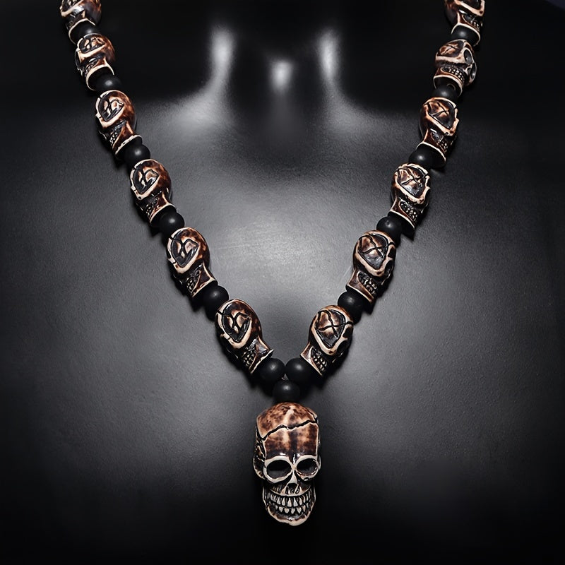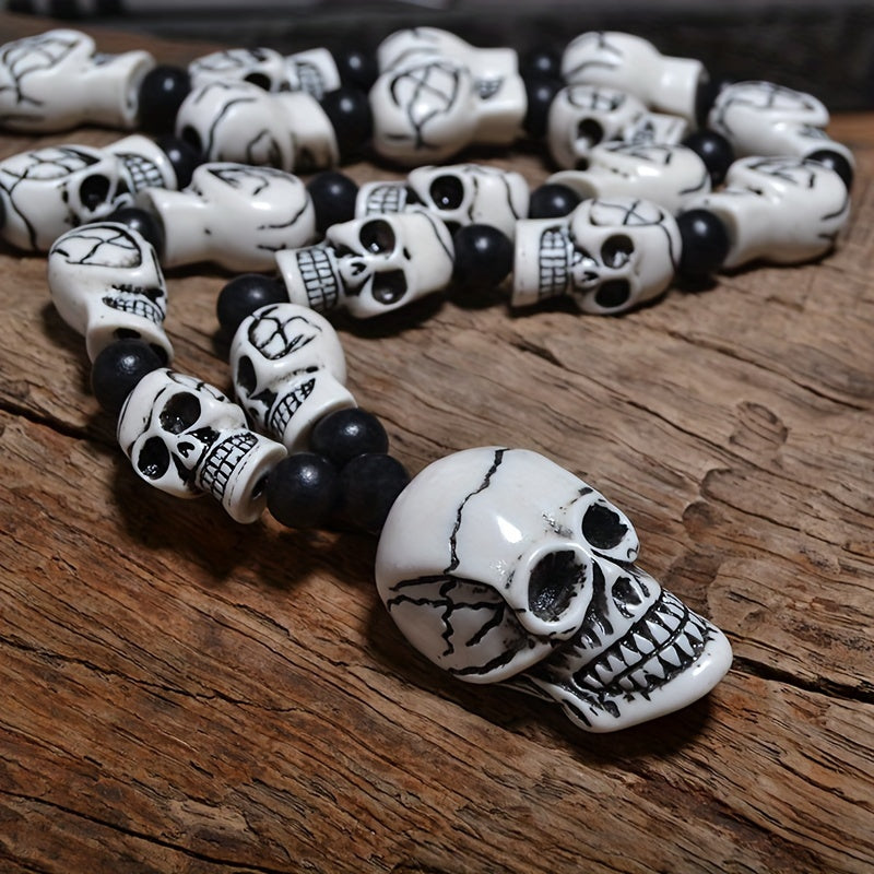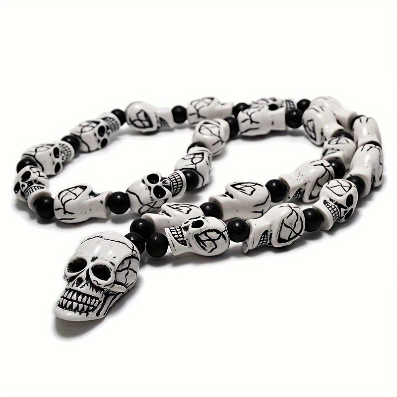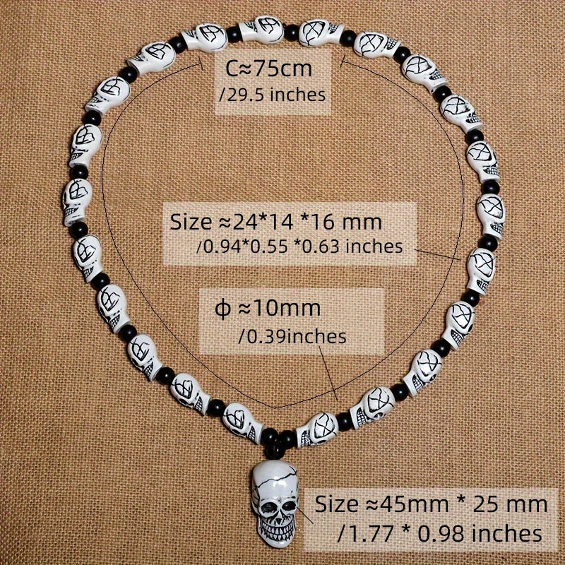 This Punk Rock Skull Bead Necklace is a perfect Halloween decor piece. The necklace features 10mm beads and a 45mmx25mm skull pendant made of resin material. It does not have a magnetic clasp. By Qianzhiyun.
