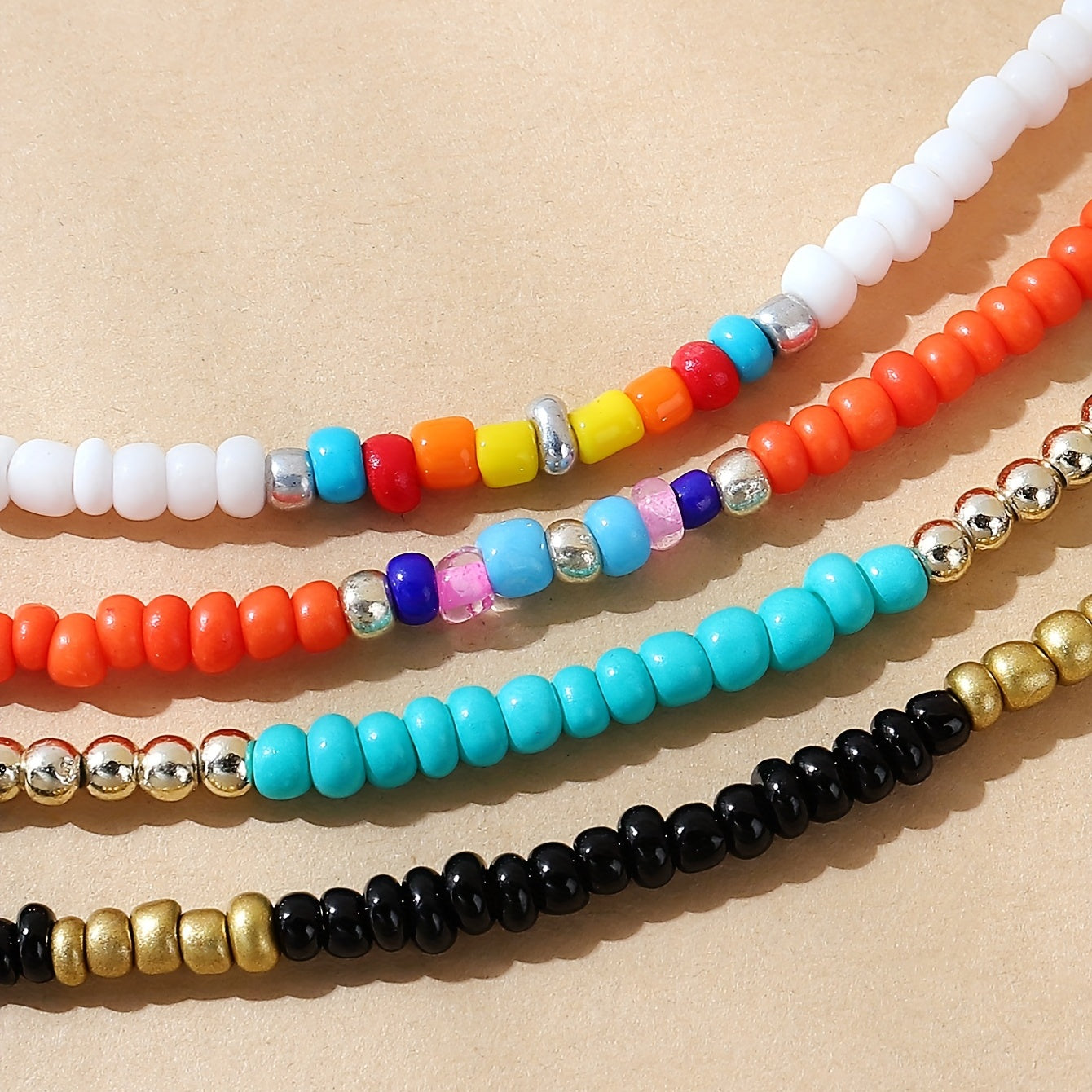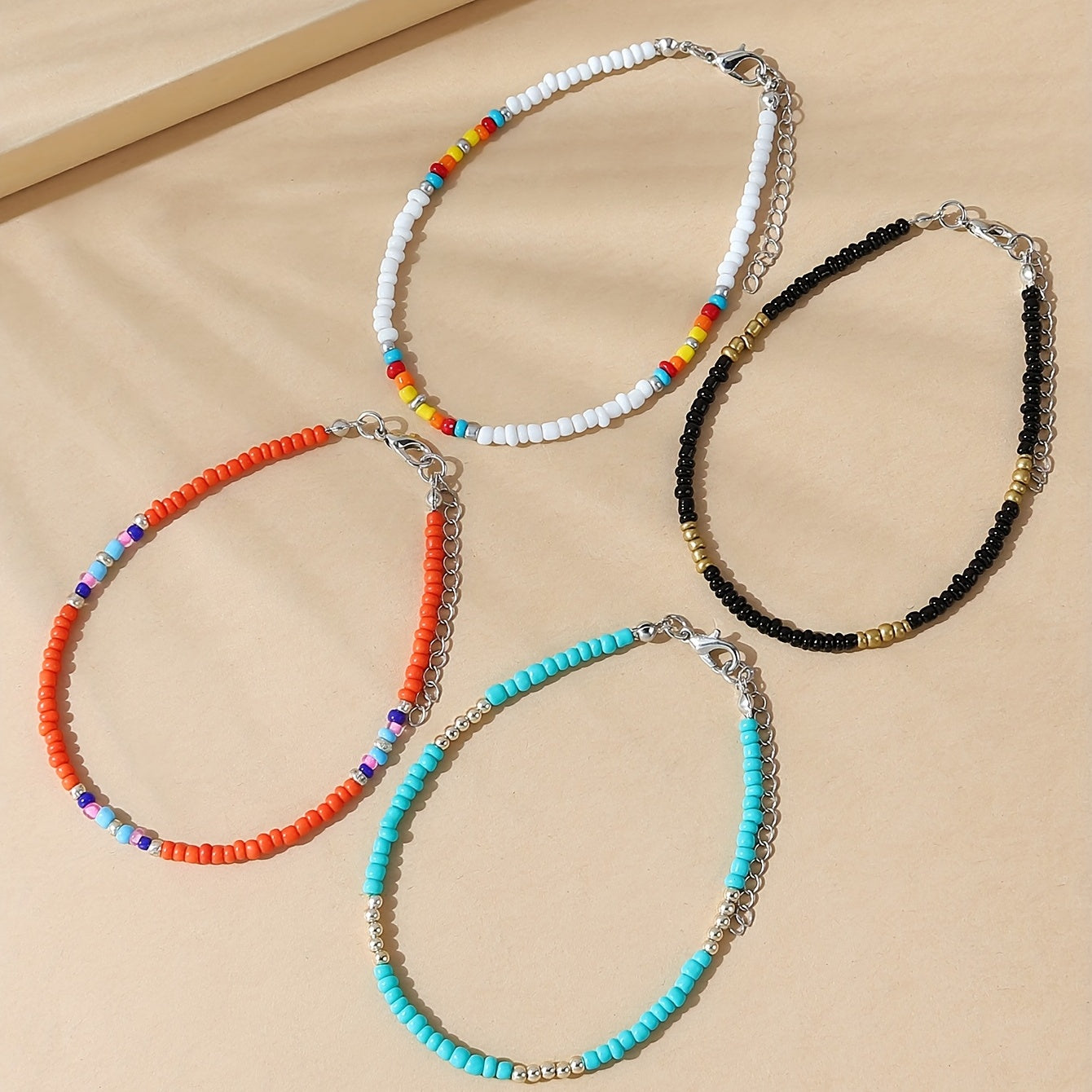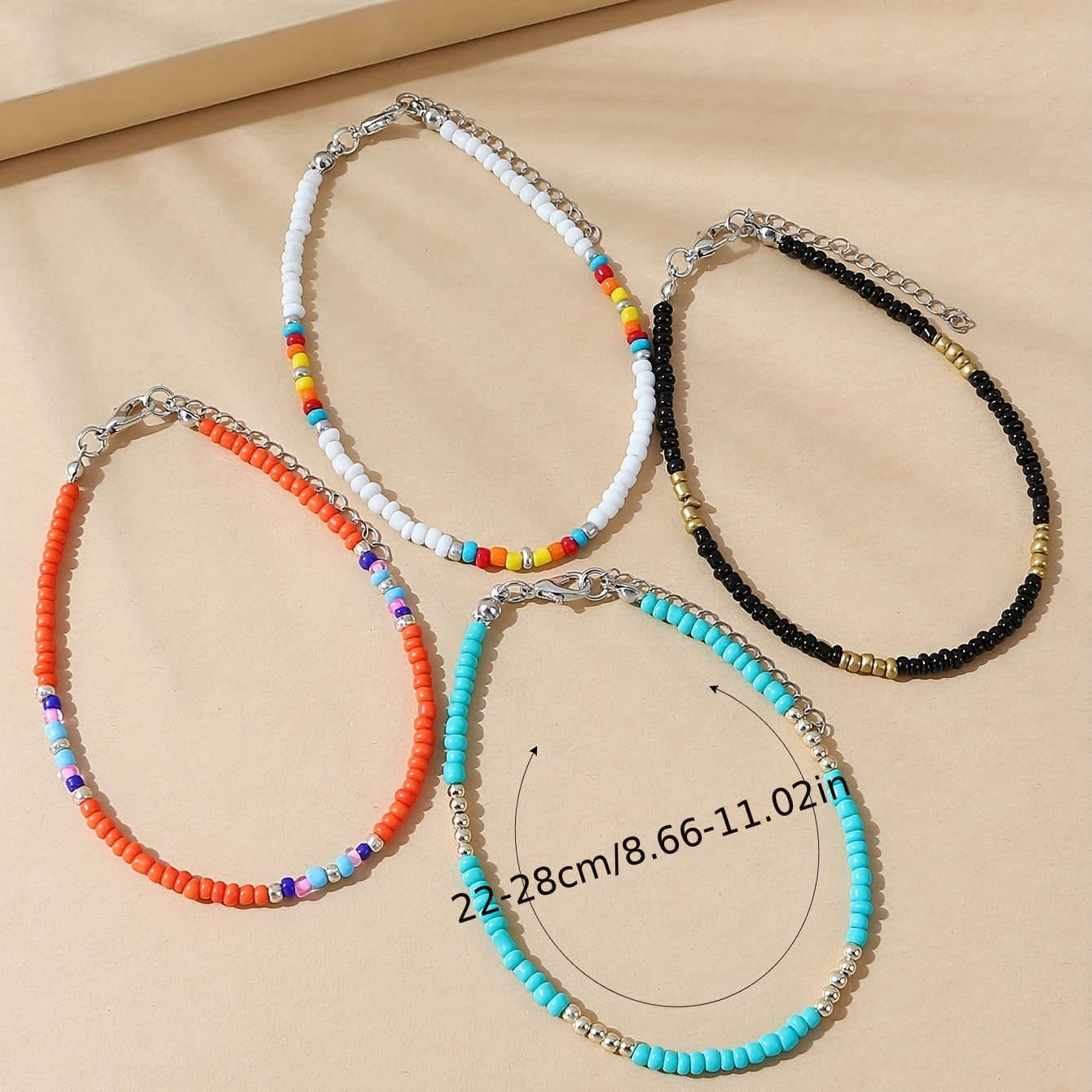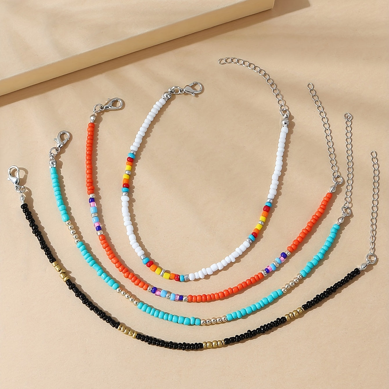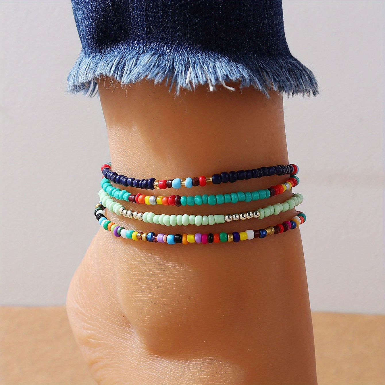 Add a pop of color to your ankles with this set of 4 boho style anklets featuring colorful rice beads. Perfect for adding a touch of style to your summer outfits.