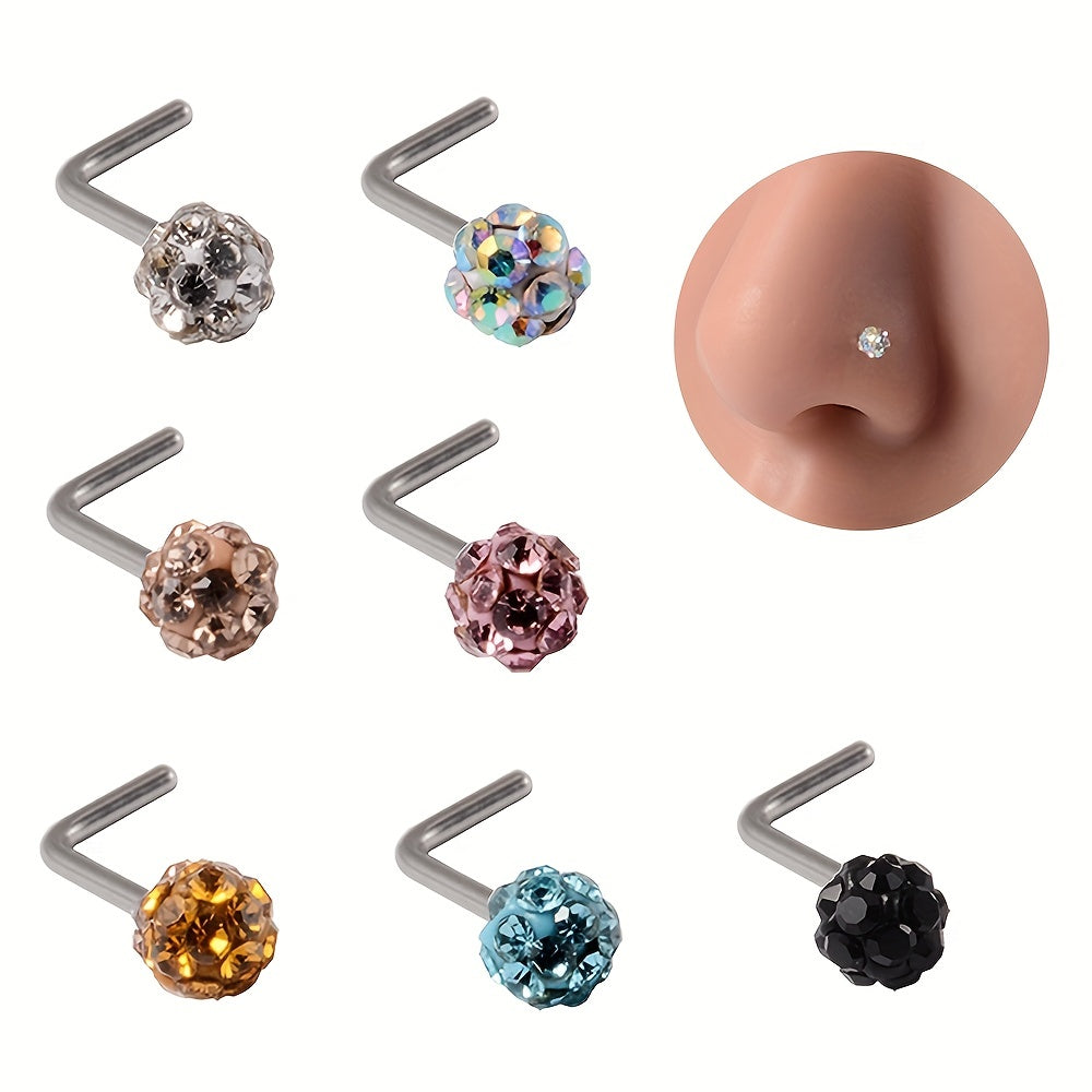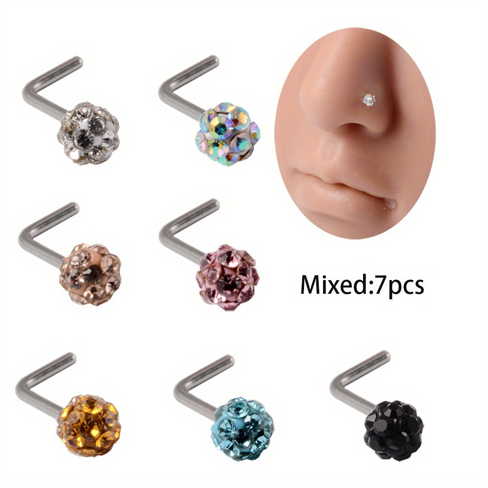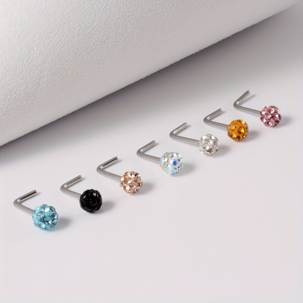 Sparkle with these 7 rhinestone ball nose studs made of stainless steel. The curved rod design adds uniqueness to your body piercing jewelry collection.