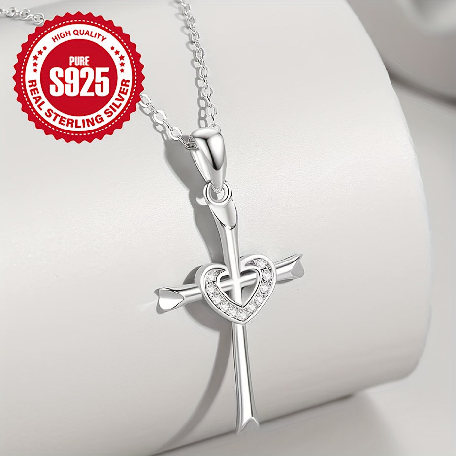 Eleganter Cross Heart Pendell Halskette aus 925 Sterlingsilber mit synthetischen Zirkoniasteinen. Ideales Geschenk für festliche Feierlichkeiten. Hypoallergen und luxuriös.