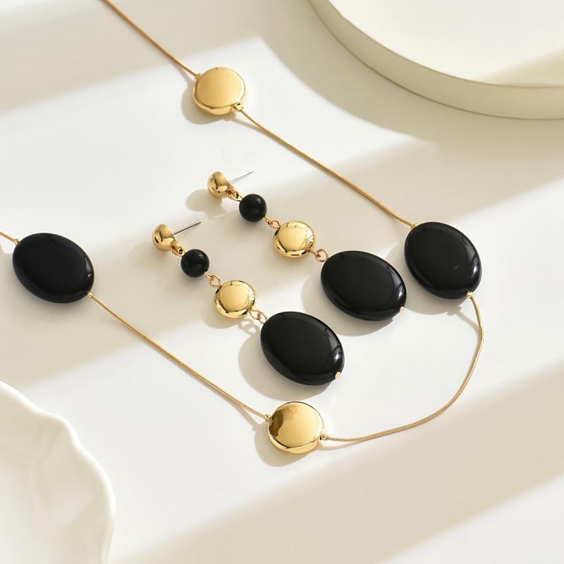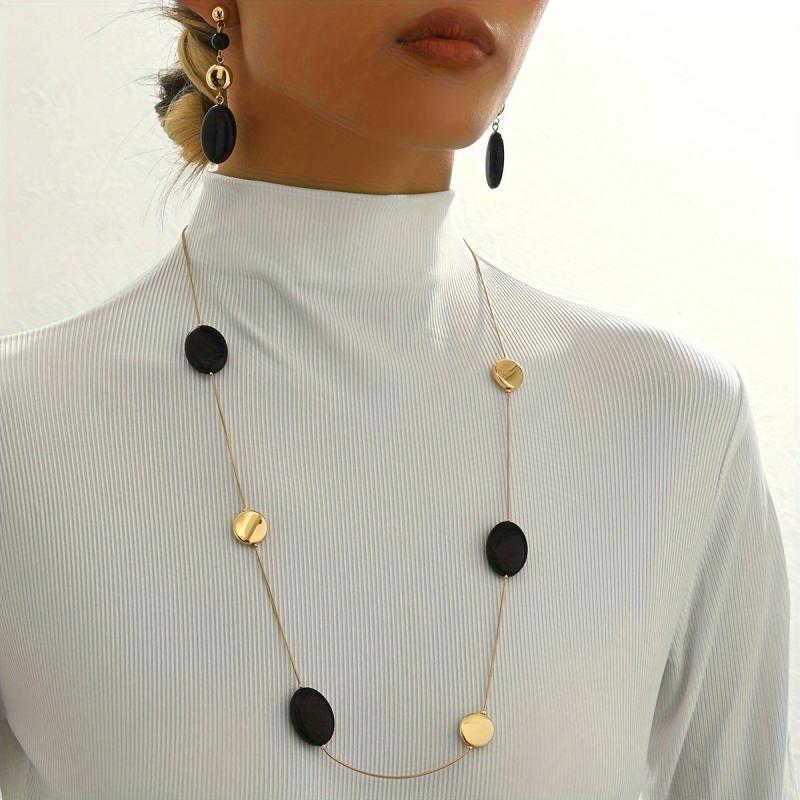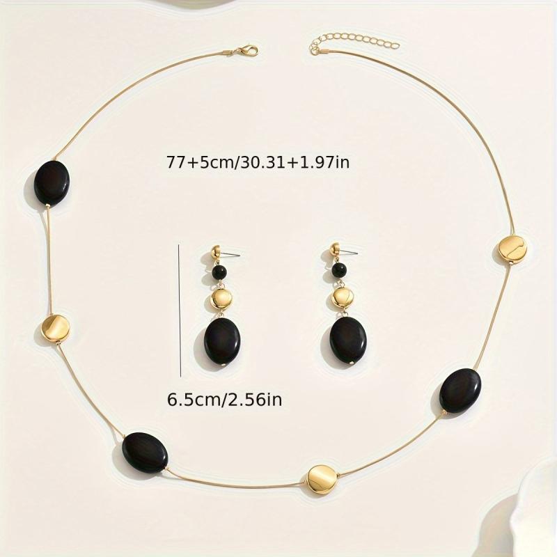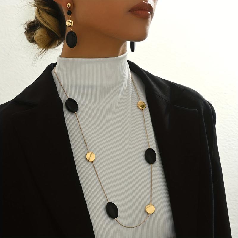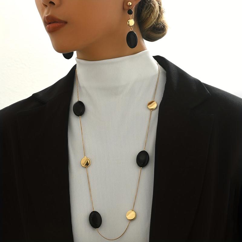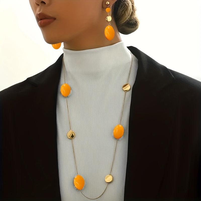 Complete your outfit with this matching set of long sweater chain and earrings. Features oval acrylic beads for a stylish and retro look.