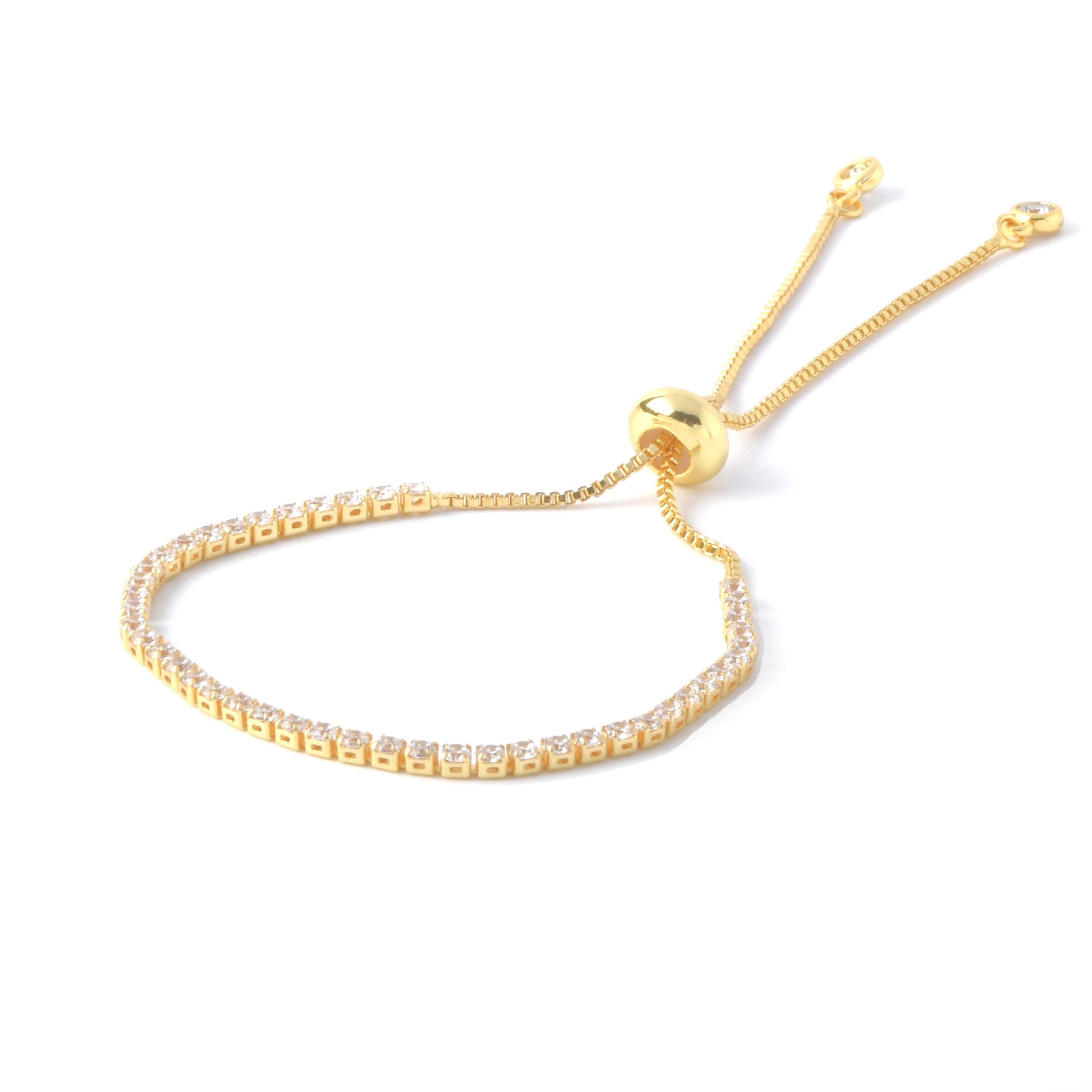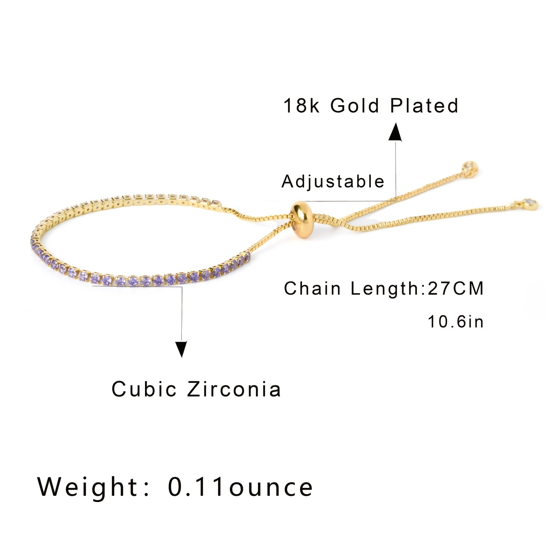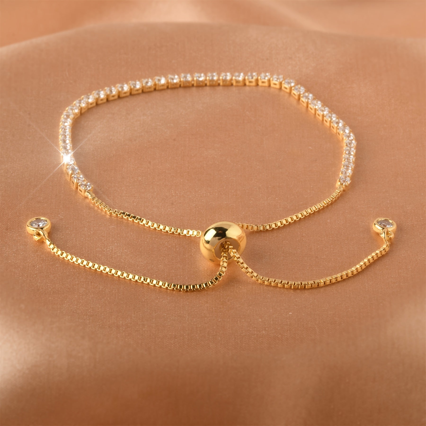 Elevate your style with this stunning adjustable tennis bracelet featuring inlaid cubic zirconia stones. The 18K gold plating adds a touch of elegance, making it the perfect hand jewelry for women and girls.