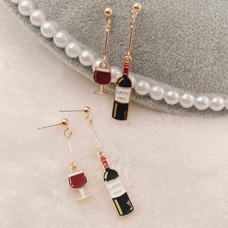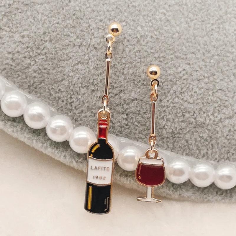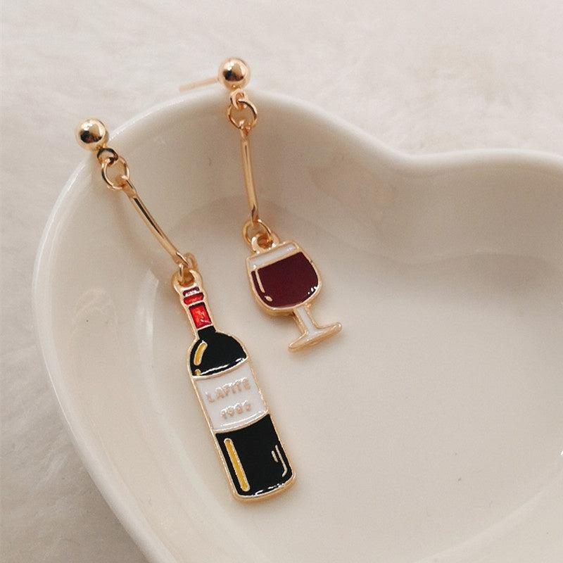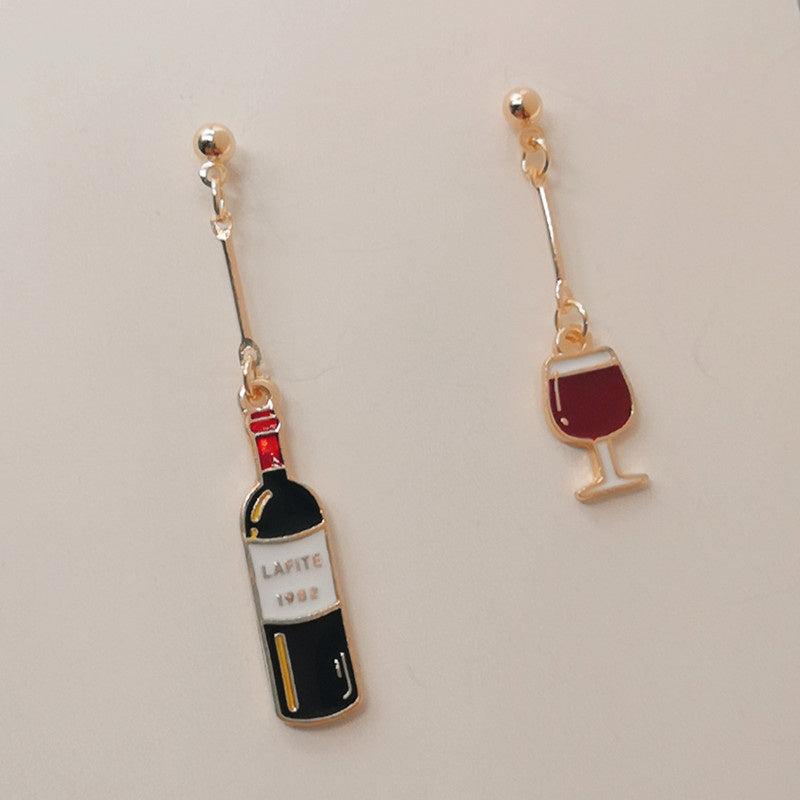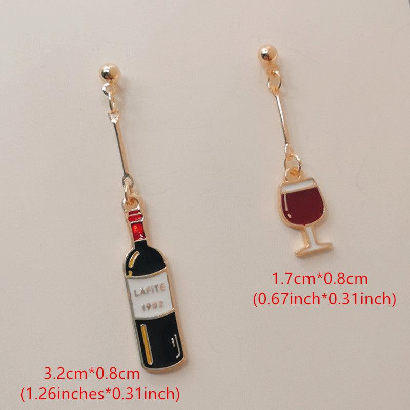 These creative asymmetric earrings are designed in the shape of a wine bottle and glass. Made from zinc alloy, they make a unique and stylish accessory for any outfit.