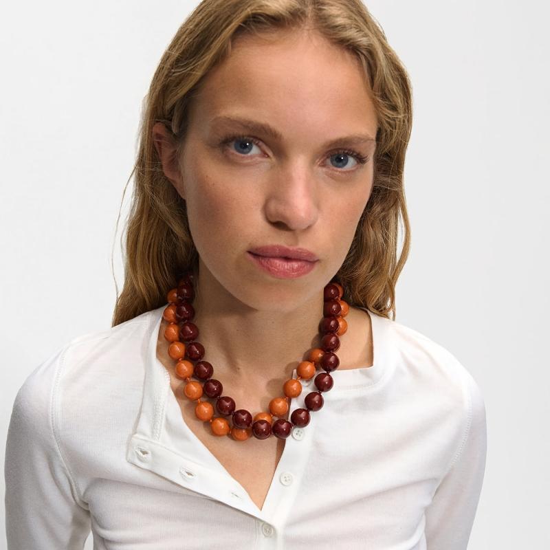 Add a touch of bohemian flair to your outfit with this lightweight and durable bead necklace. The round beads in orange red hues with accent colors create a stylish and casual look.