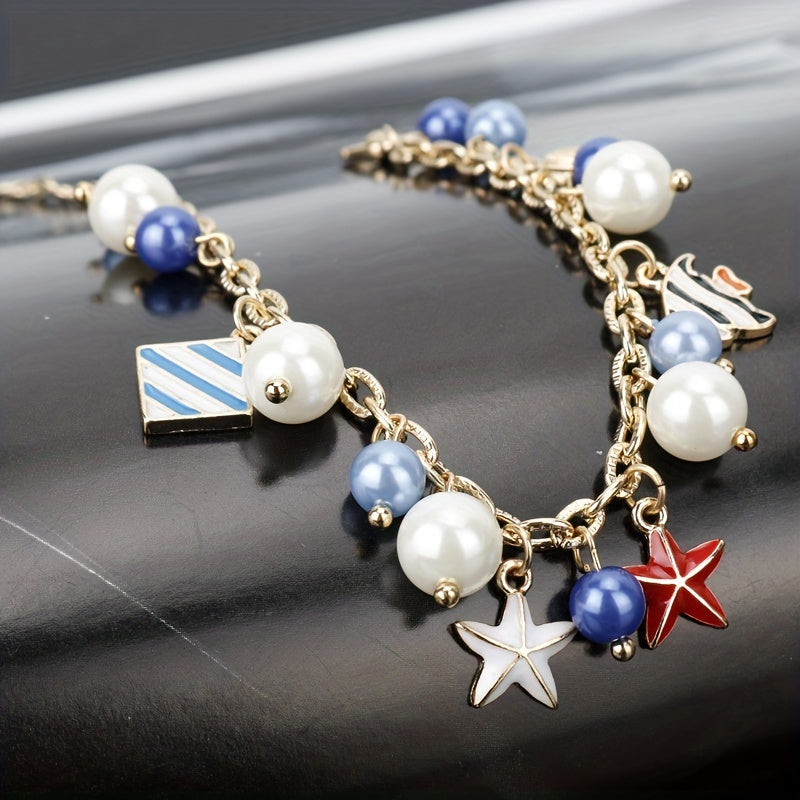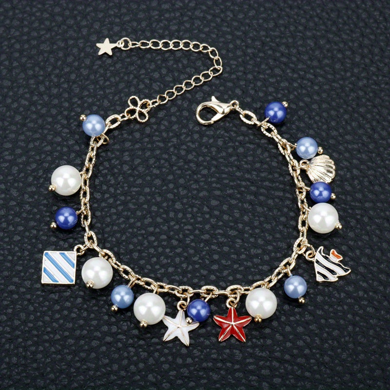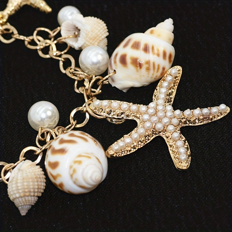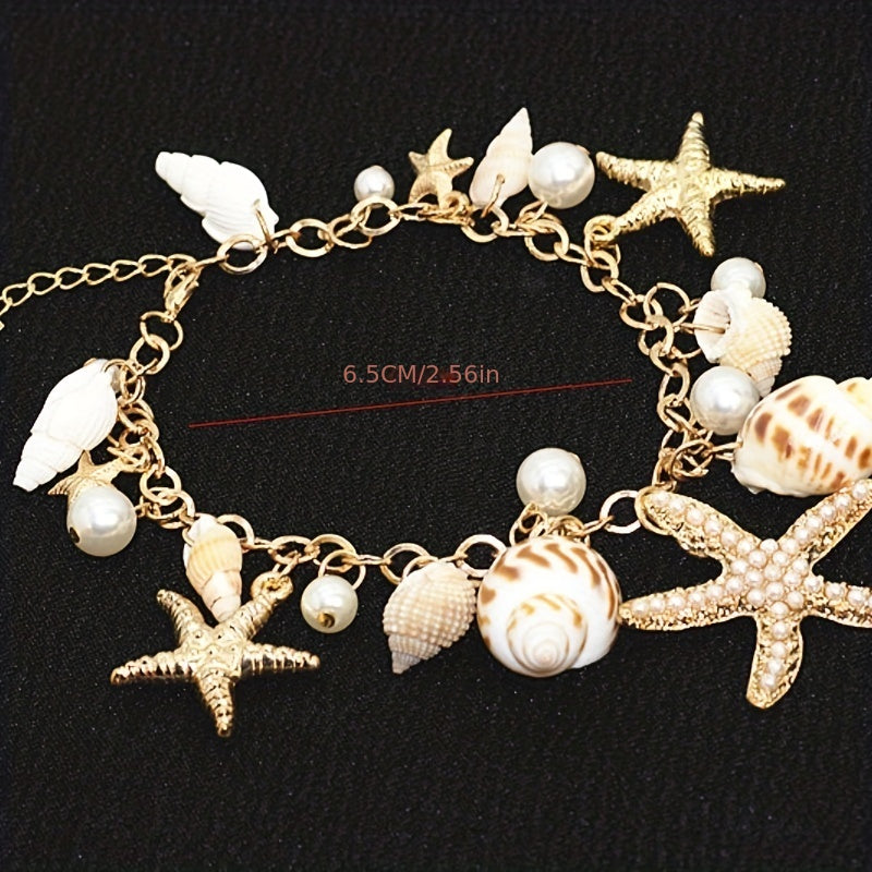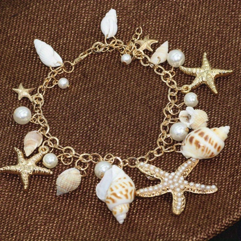 Elevate your summer beach look with this creative bracelet featuring shell, conch, and starfish charms. The bohemian design adds a touch of elegance to any outfit.