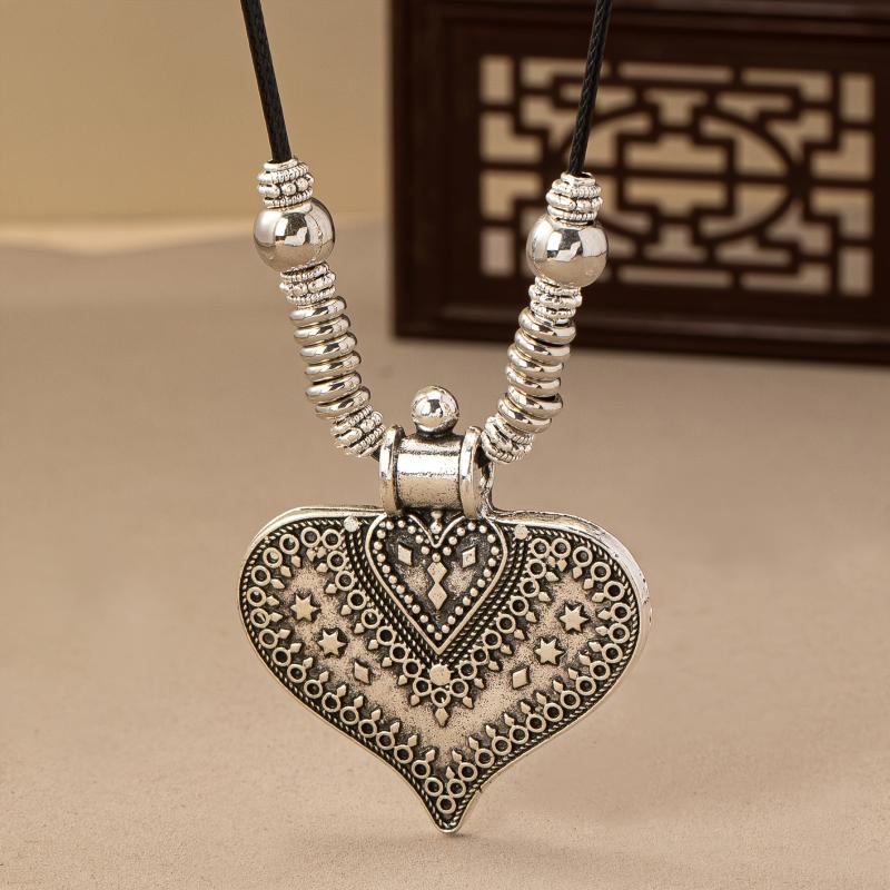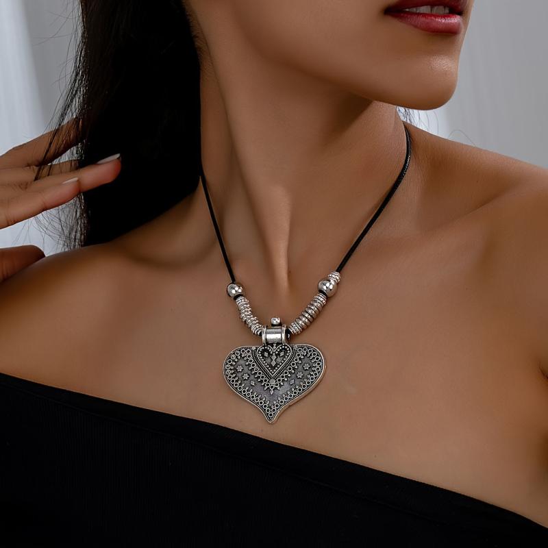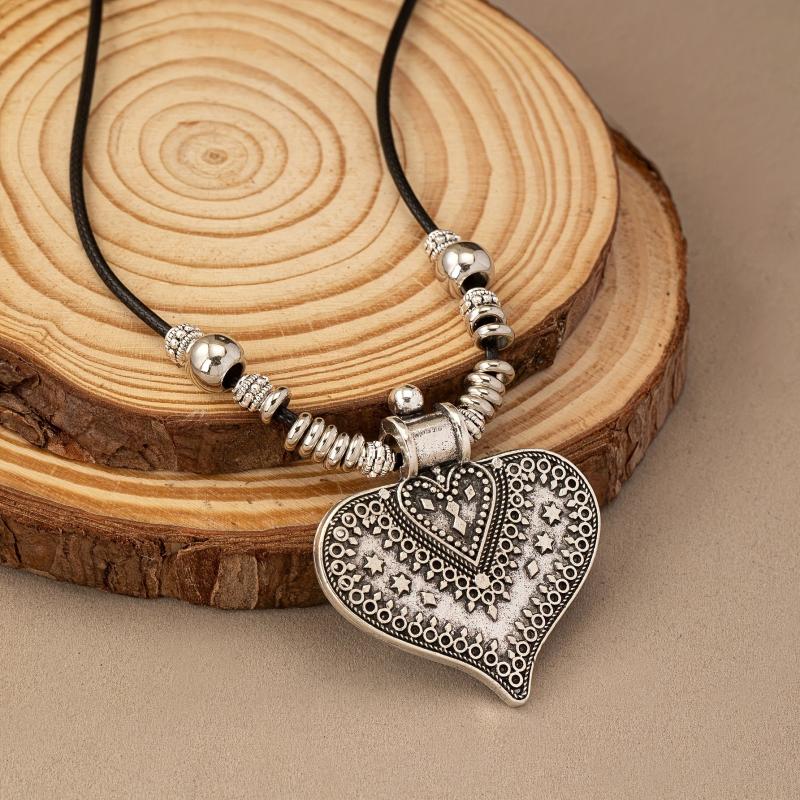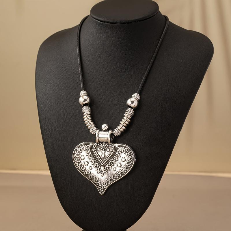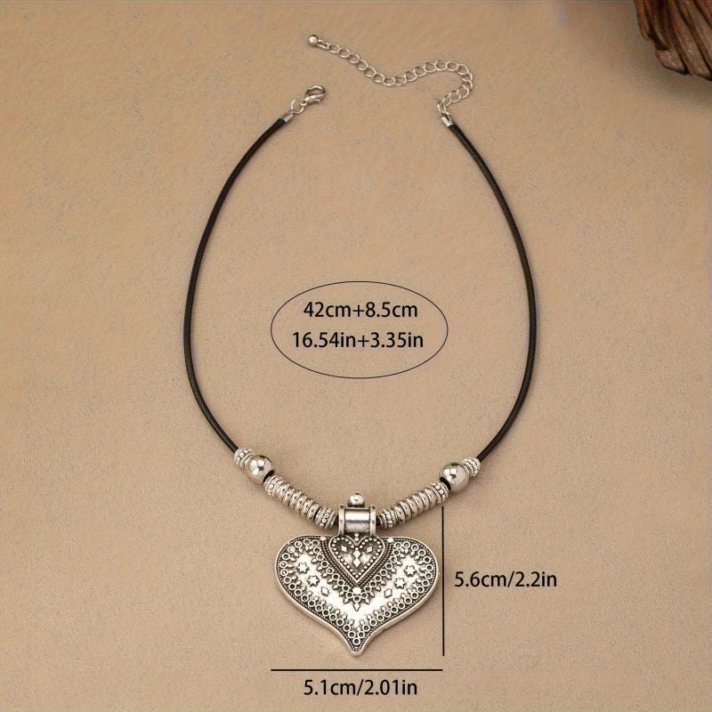 This vintage pendant necklace features an embossed star and heart metal pattern, adding a touch of Bohemian charm to any outfit.