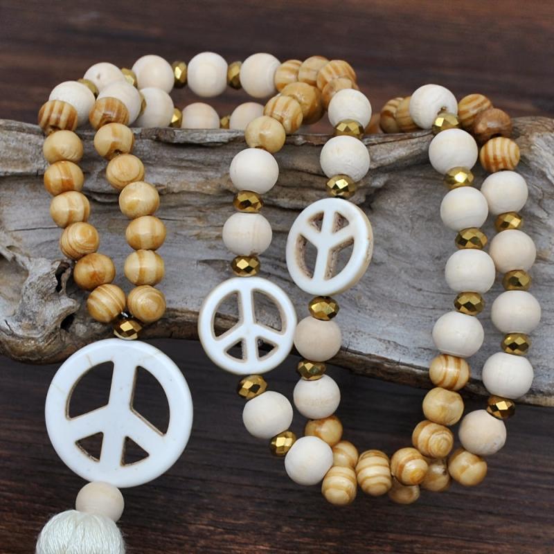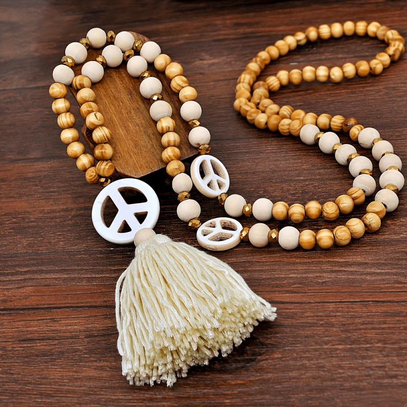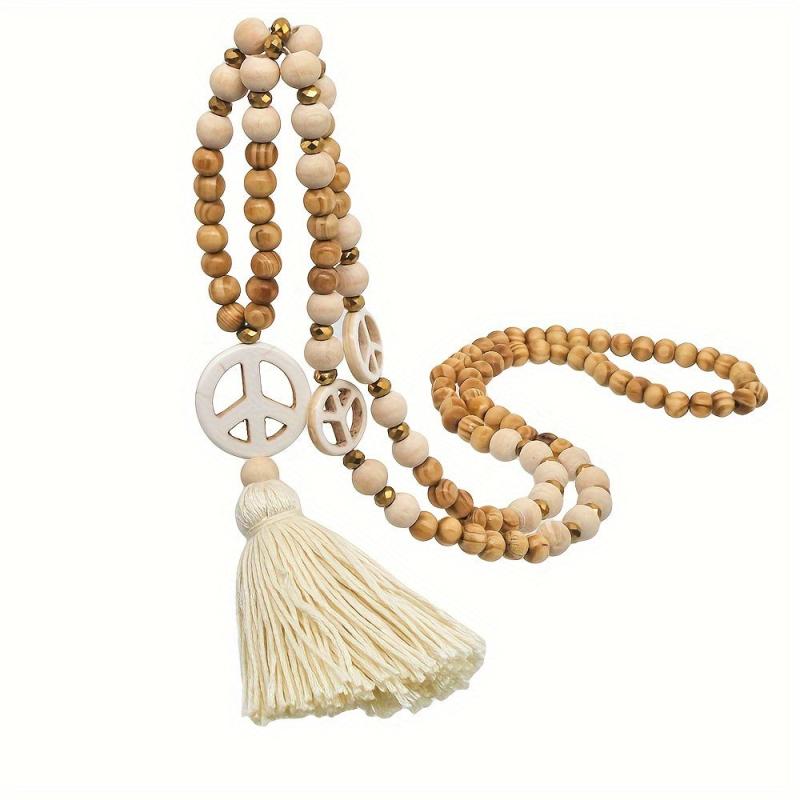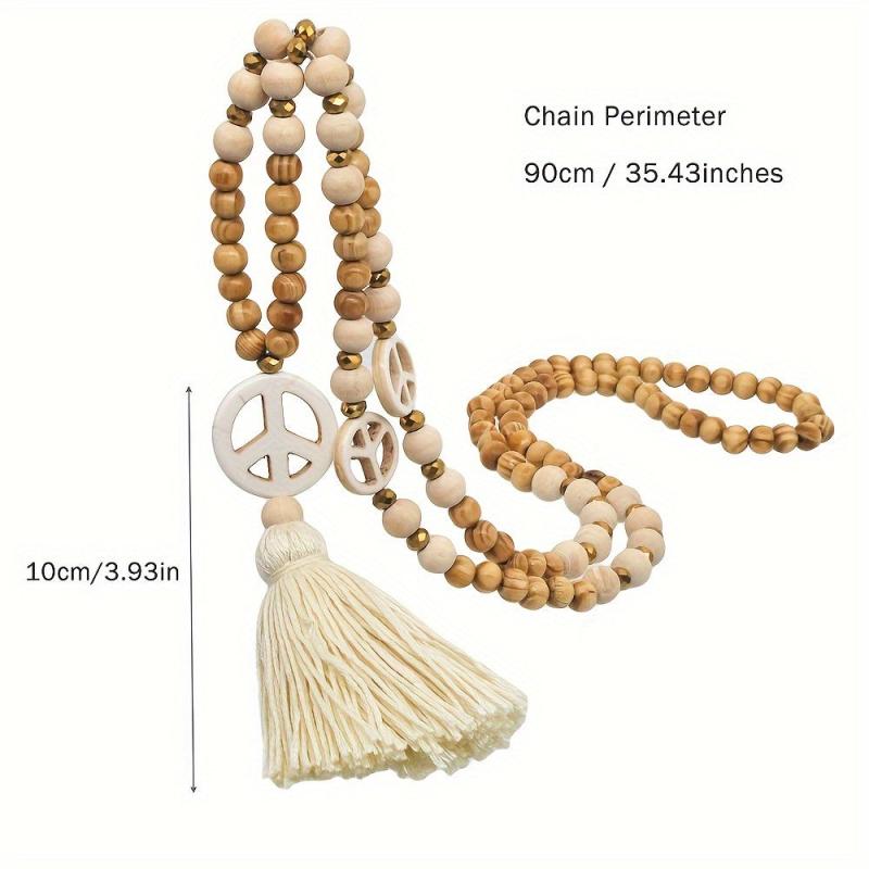 Add a touch of vintage boho charm to your outfit with this beaded necklace featuring tassel and peace sign charms. Made with synthetic turquoise gemstones, this accessory is perfect for daily wear in all seasons.