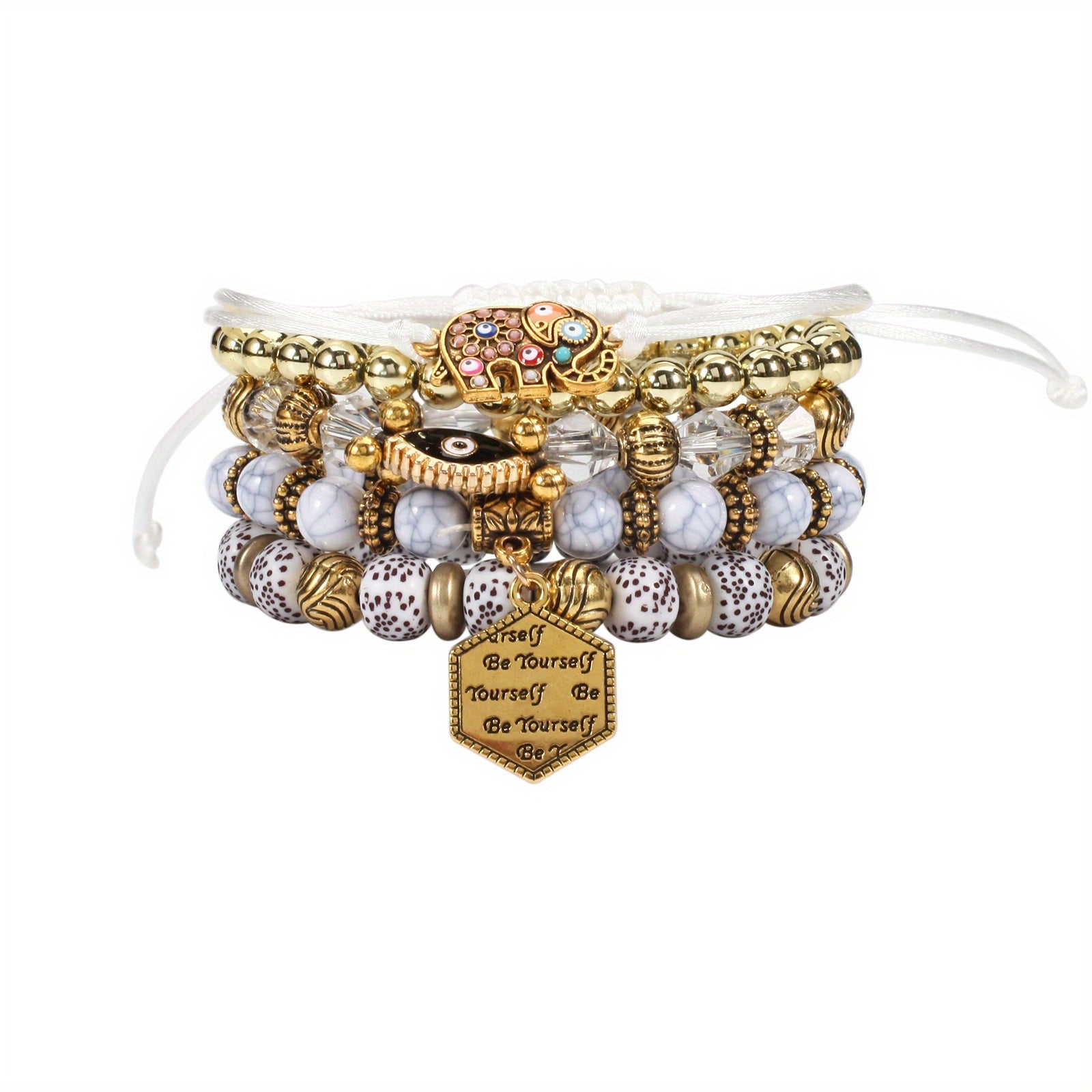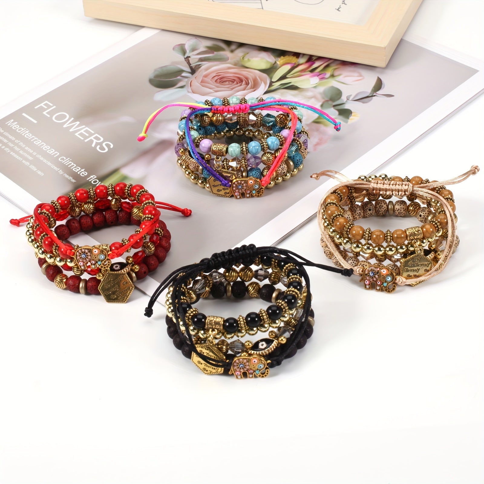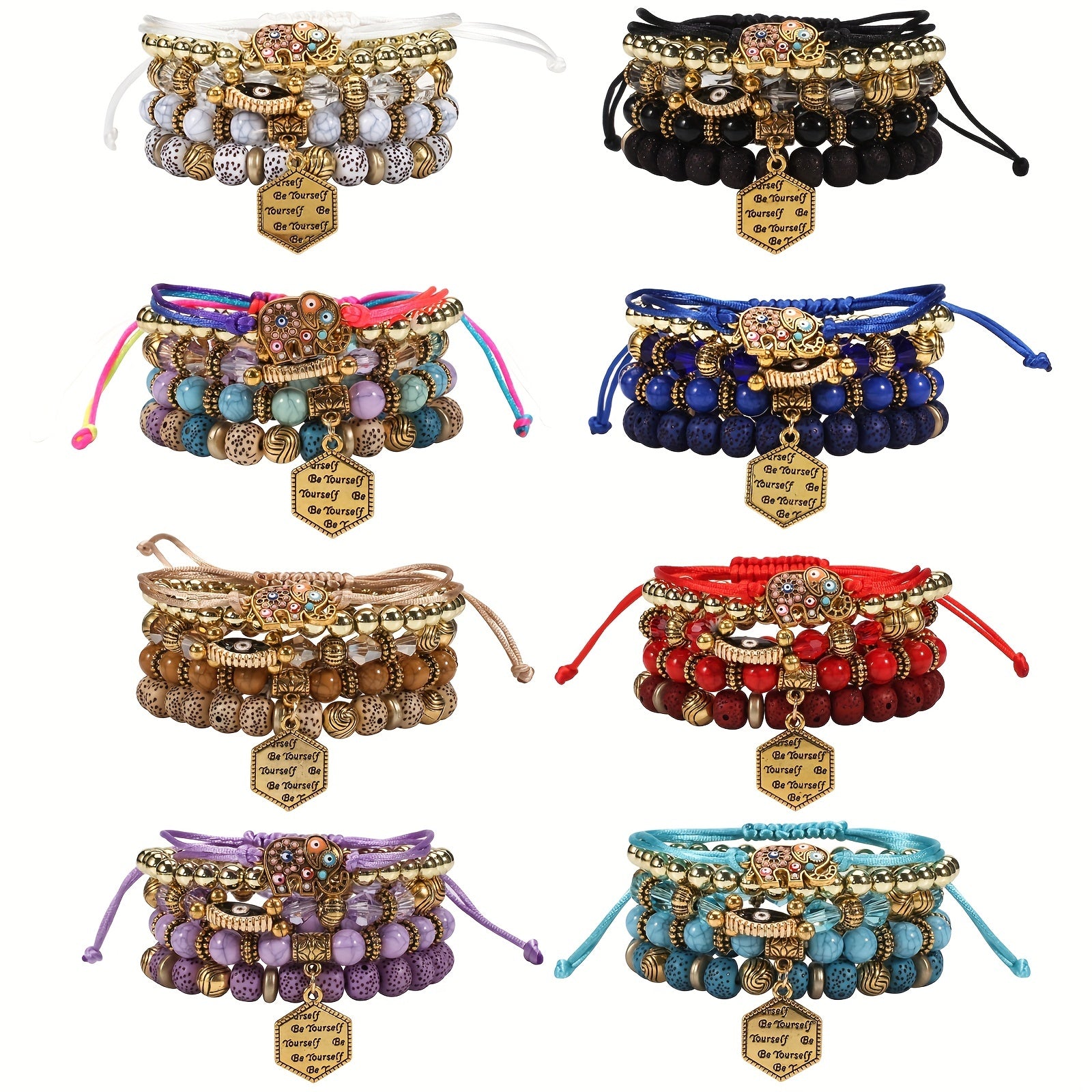 Add a touch of bohemian charm to your outfit with this set of stretch bracelets featuring elephant eye beads and braided designs. These adjustable bracelets can be stacked for a trendy hand jewelry look.