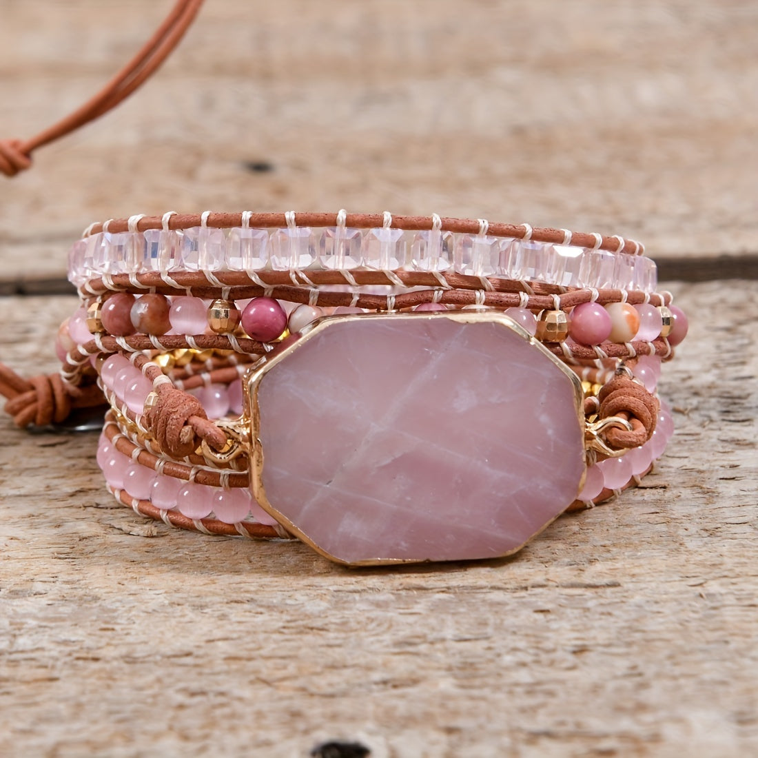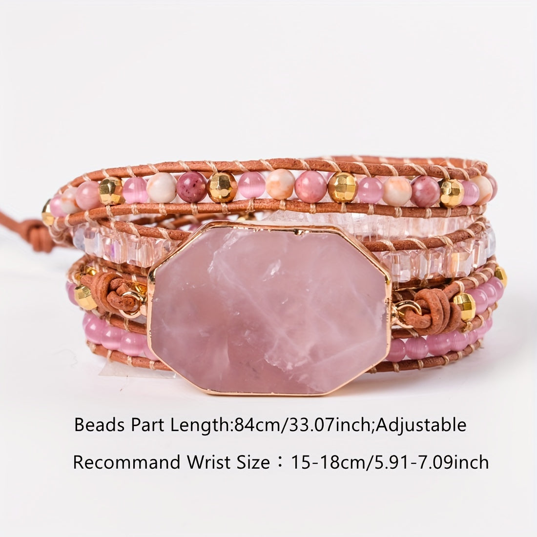 Enhance your style with this boho leather bracelet featuring rose quartz and agate stone beads. Perfect for any occasion!