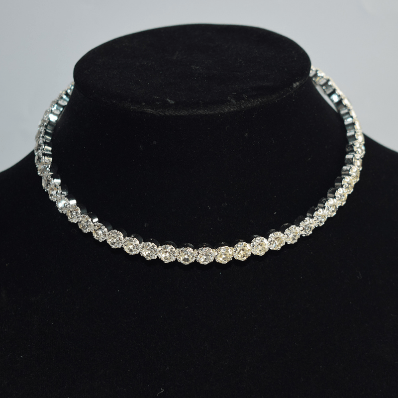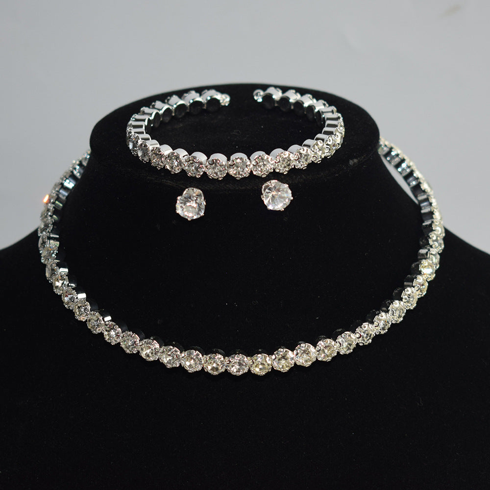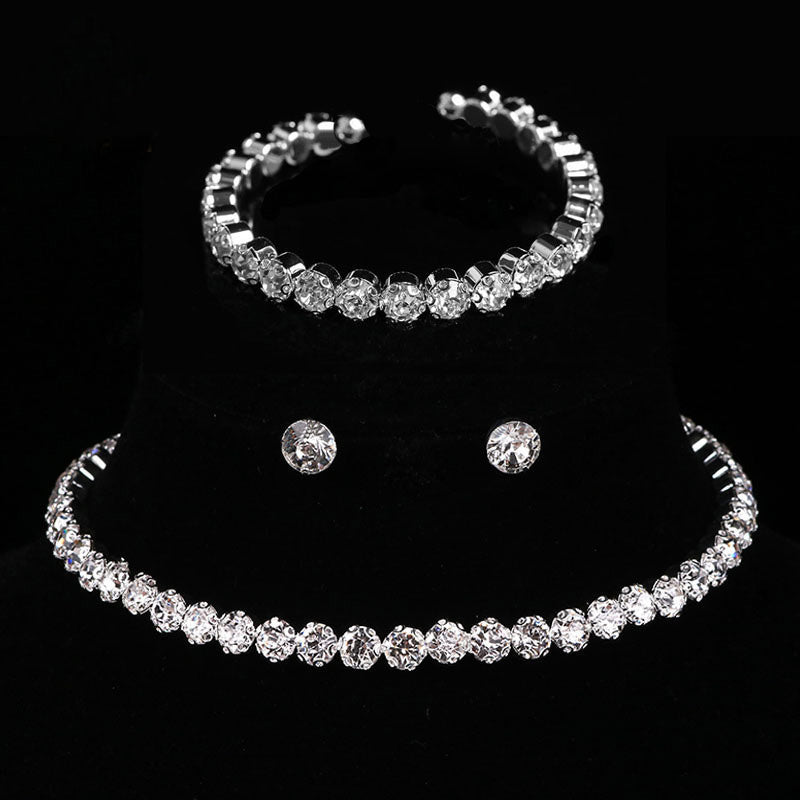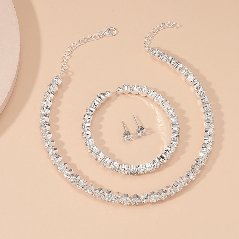 Complete your bridal look with this elegant jewelry set featuring a flashing synthetic zirconia necklace, earrings, and bracelet. Perfect for adding a touch of sparkle and sophistication to your wedding ensemble.