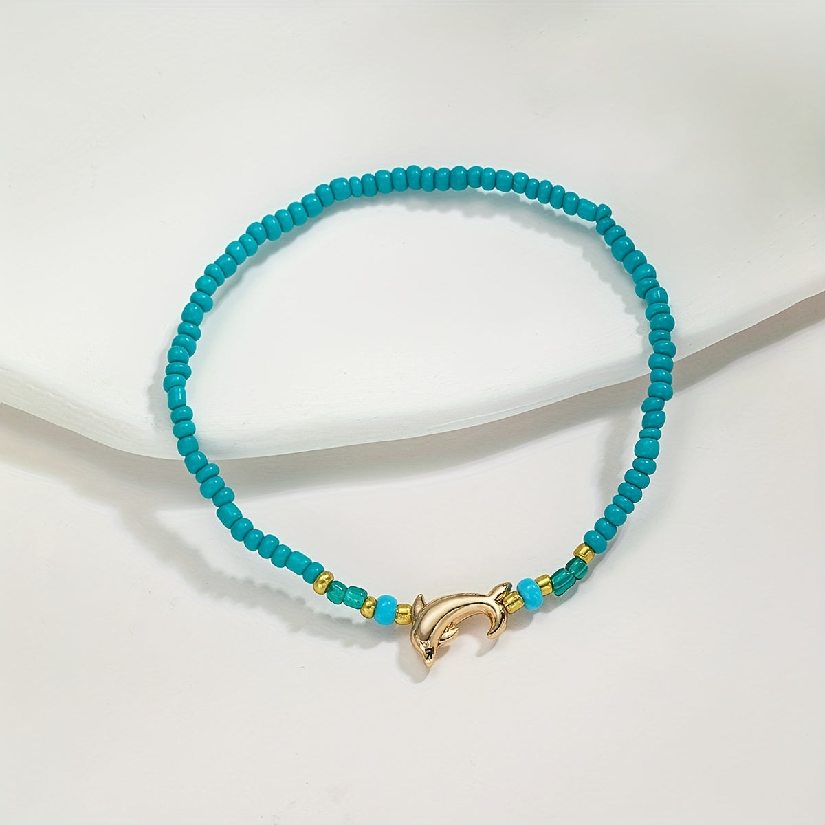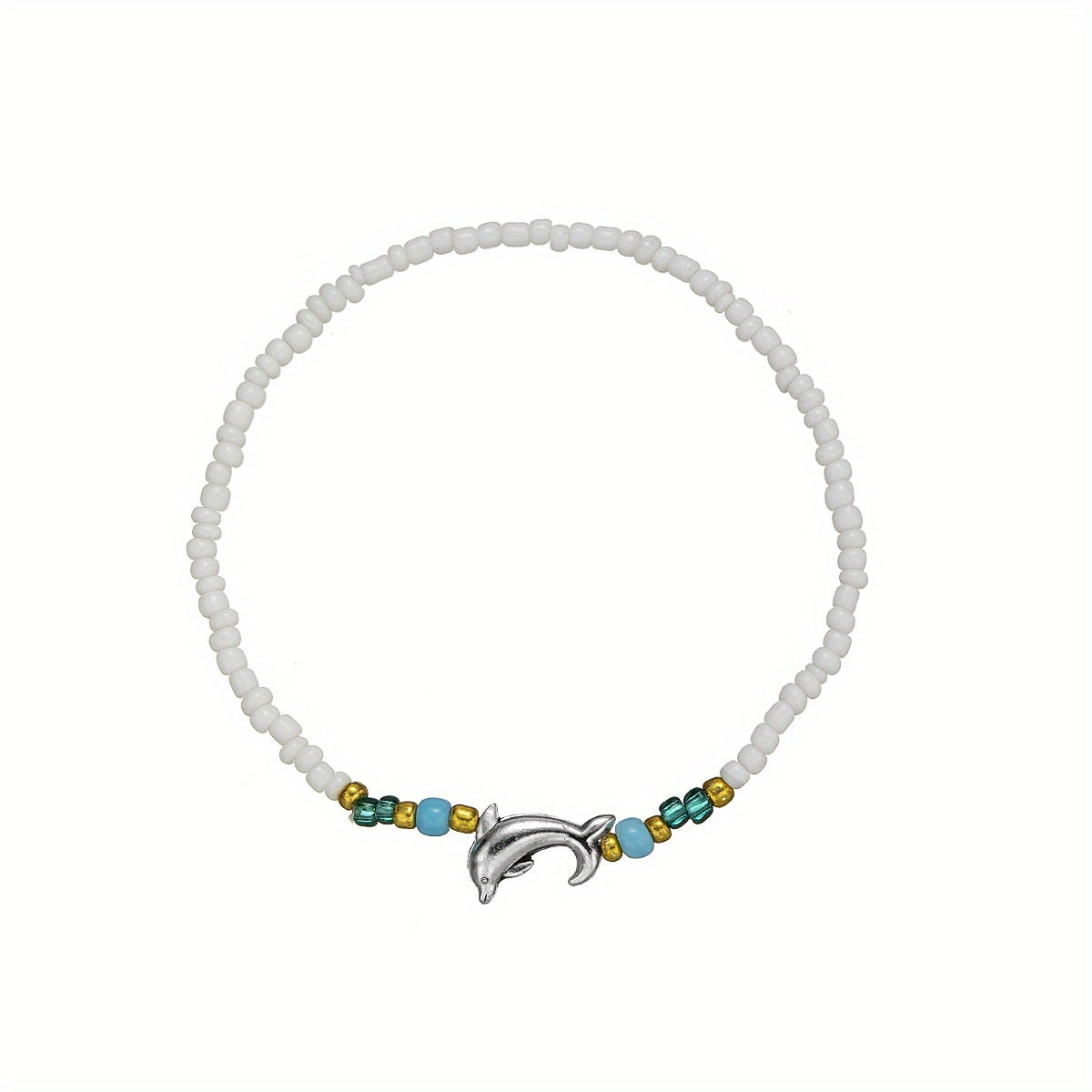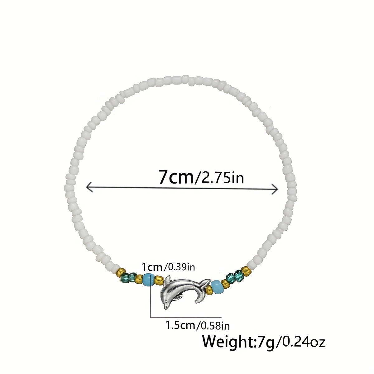 This anklet features dolphin rice beads for a boho beach vibe. Perfect for adding a touch of summer style to your look.