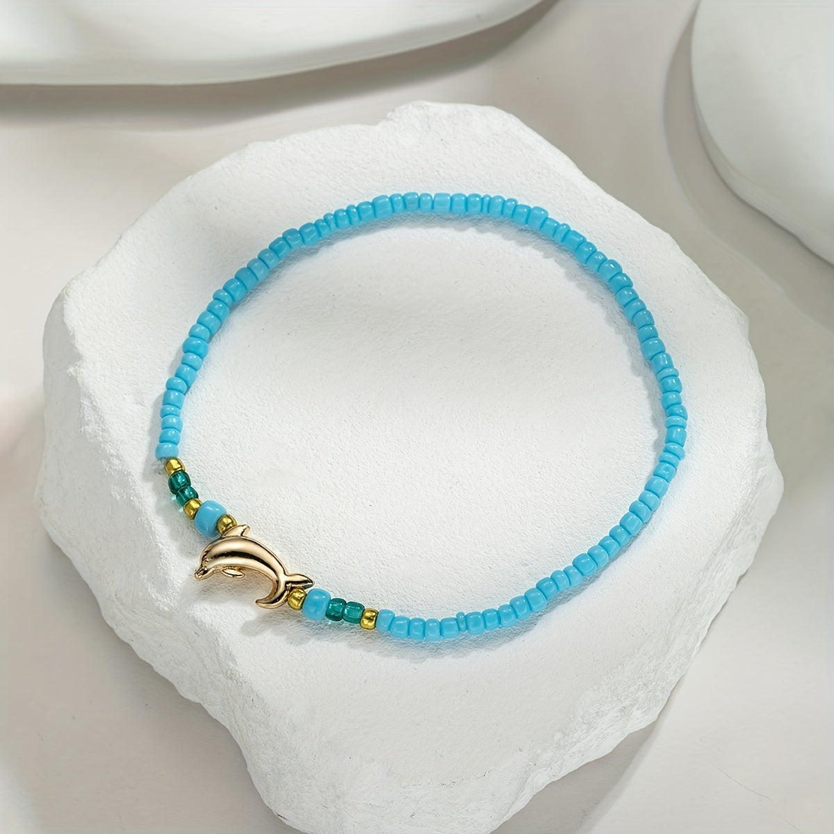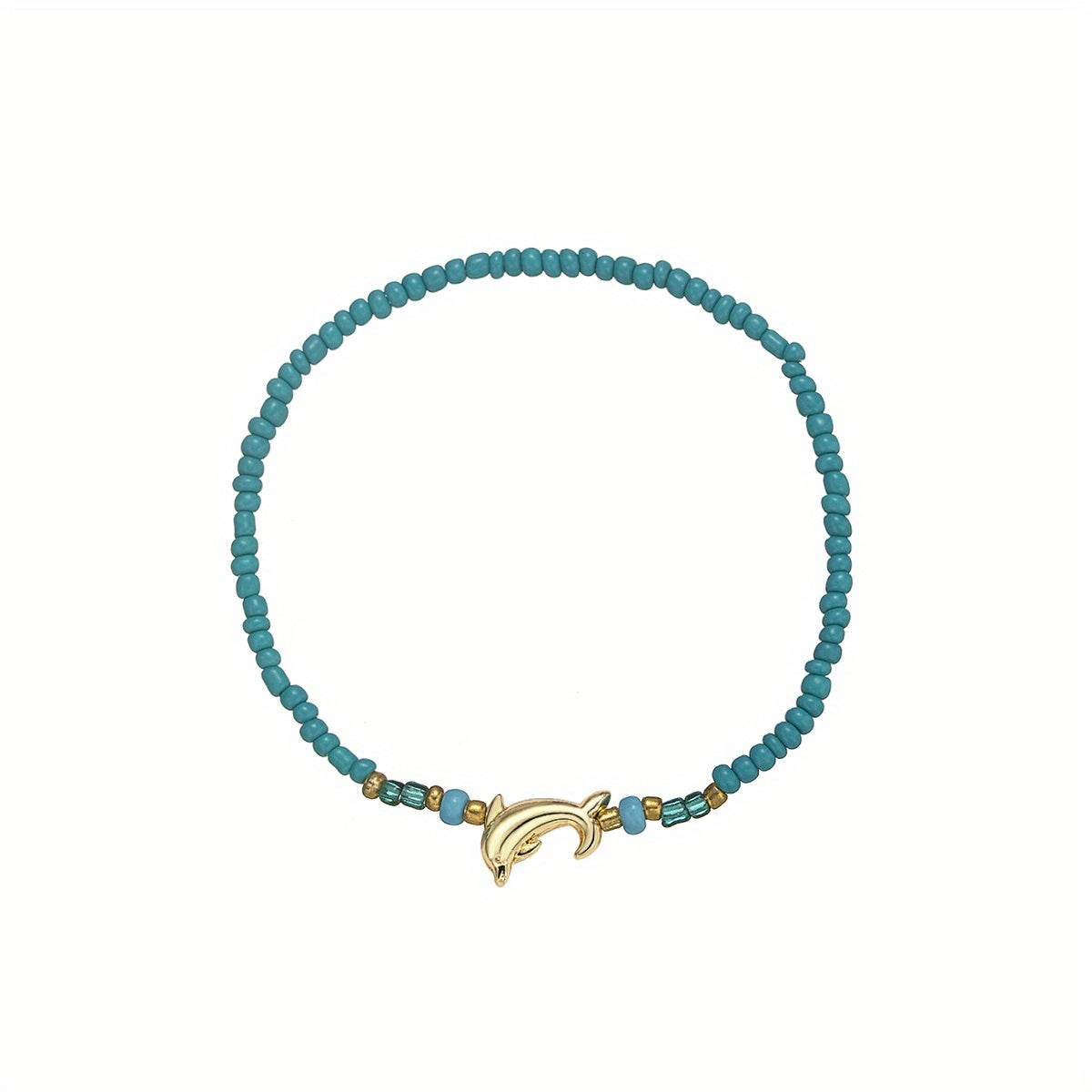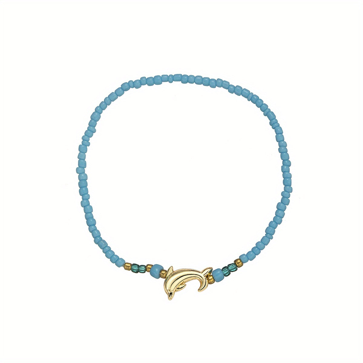 This anklet features dolphin rice beads for a boho beach vibe. Perfect for adding a touch of summer style to your look.