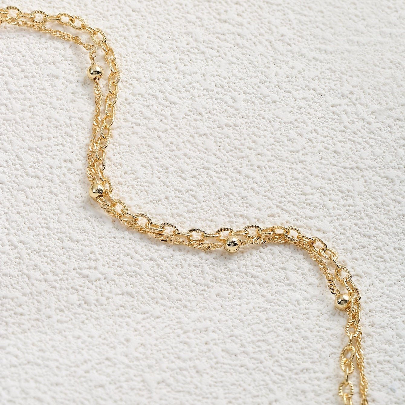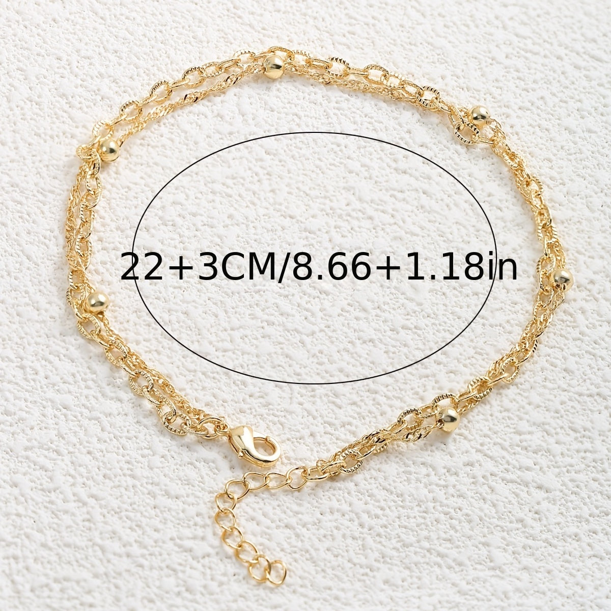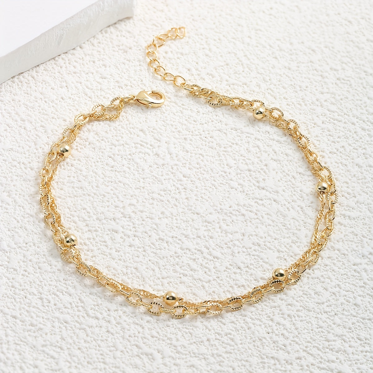 Elegant anklet featuring double layer beaded chain design with 18K gold plated copper. Perfect accessory for a stylish look.
