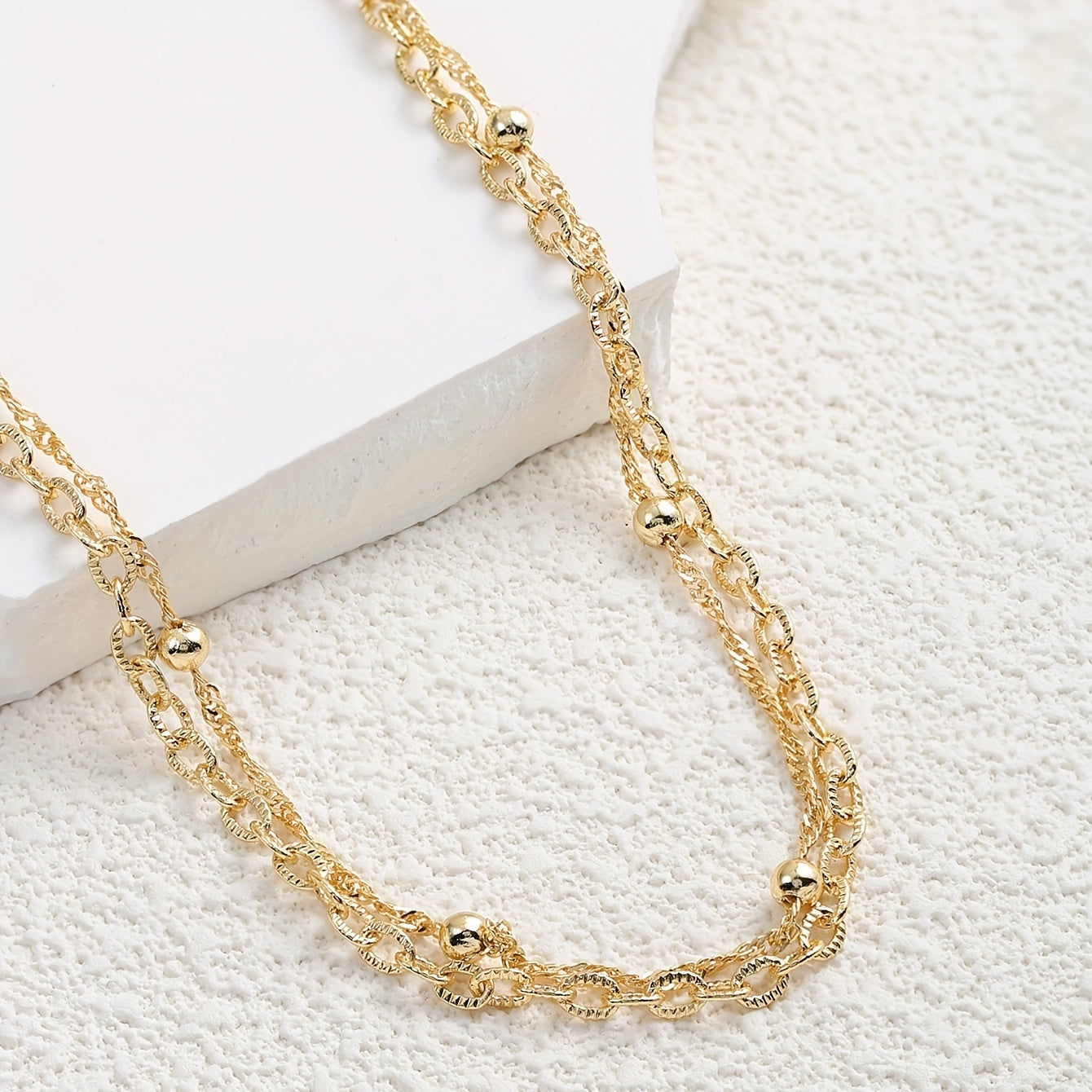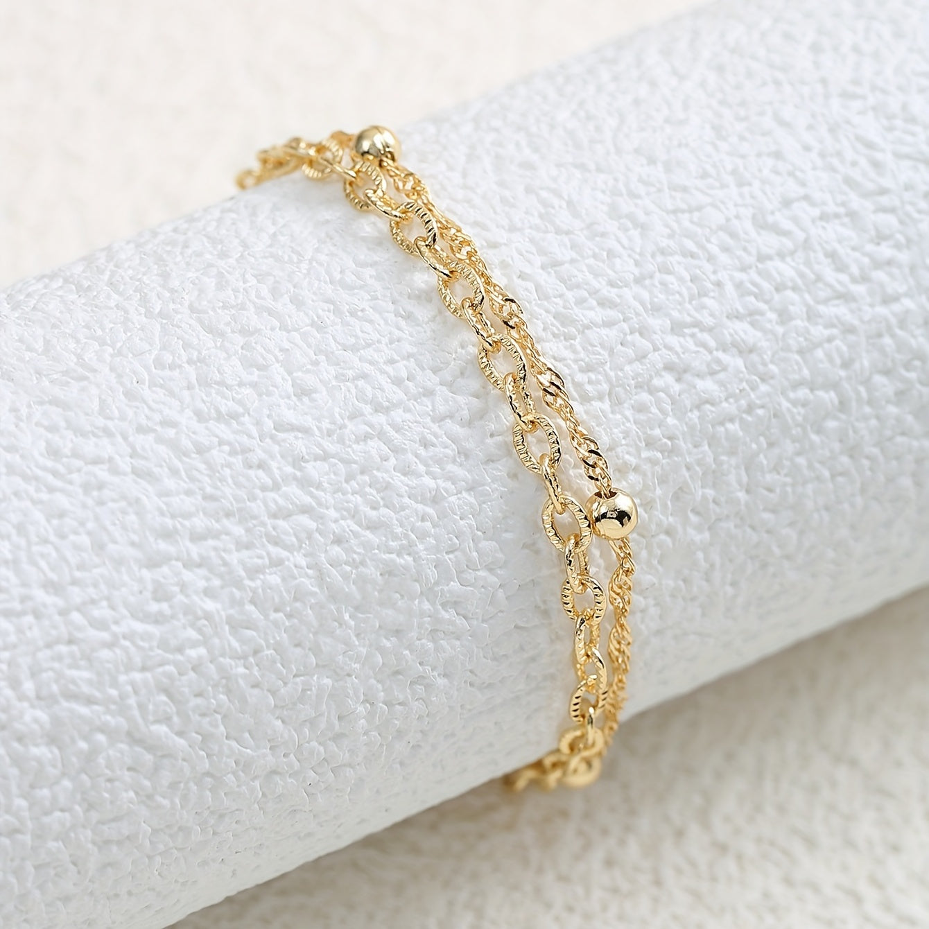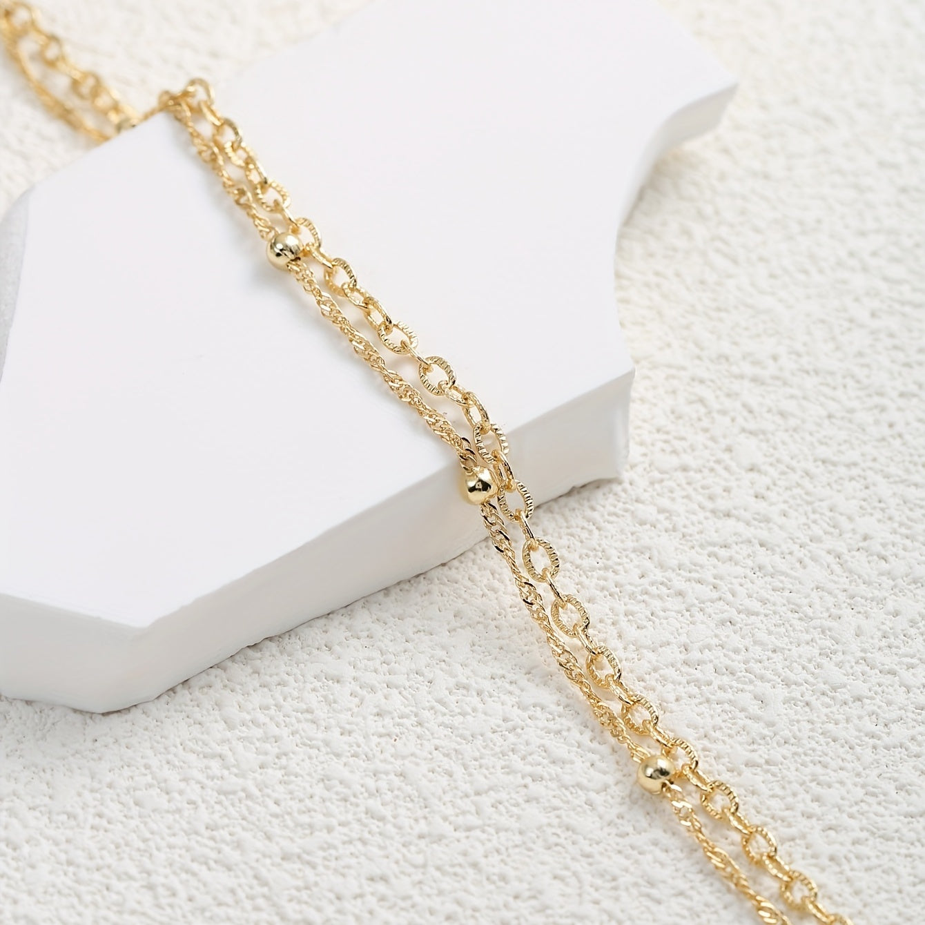 Elegant anklet featuring double layer beaded chain design with 18K gold plated copper. Perfect accessory for a stylish look.