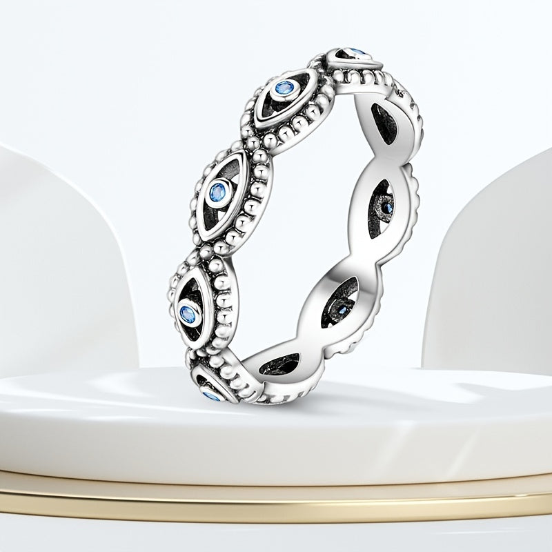 Add a touch of mystique and protection to your style with this Evil Eye Ring. Made of copper with a silvery finish, this statement ring is perfect for any occasion.