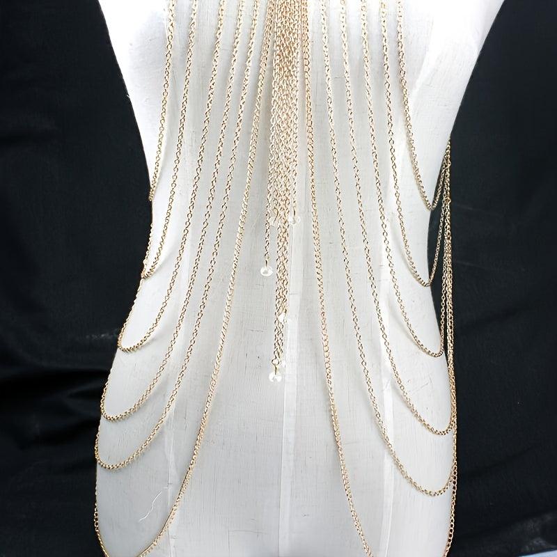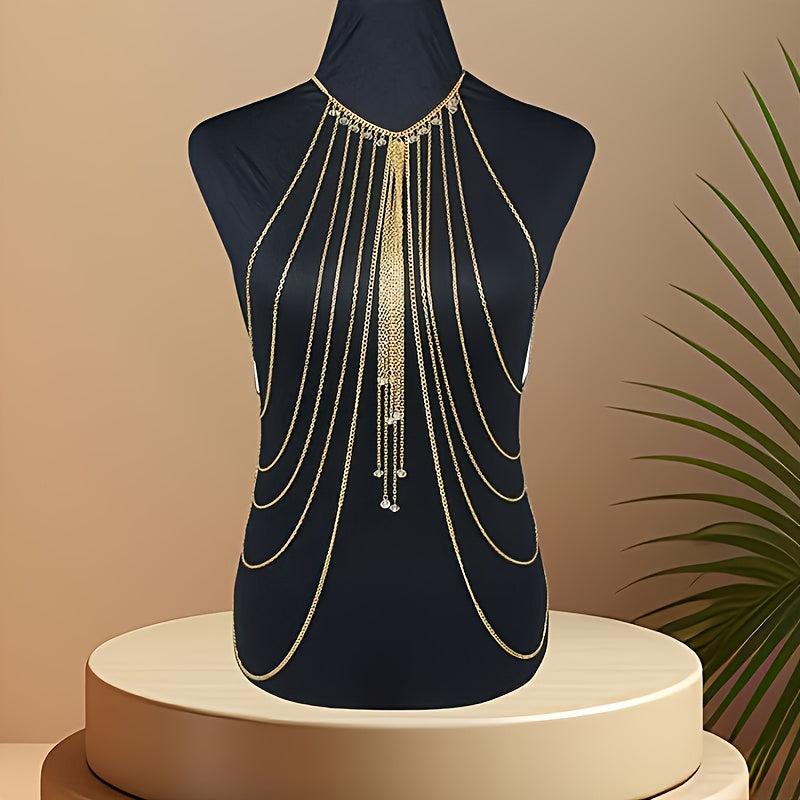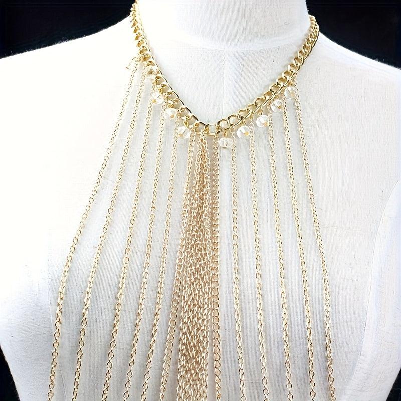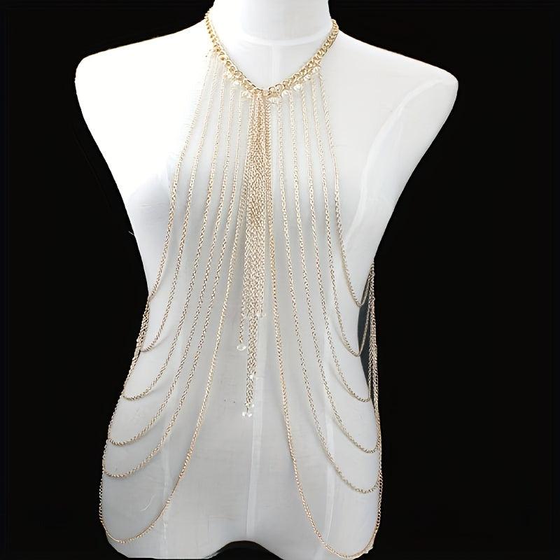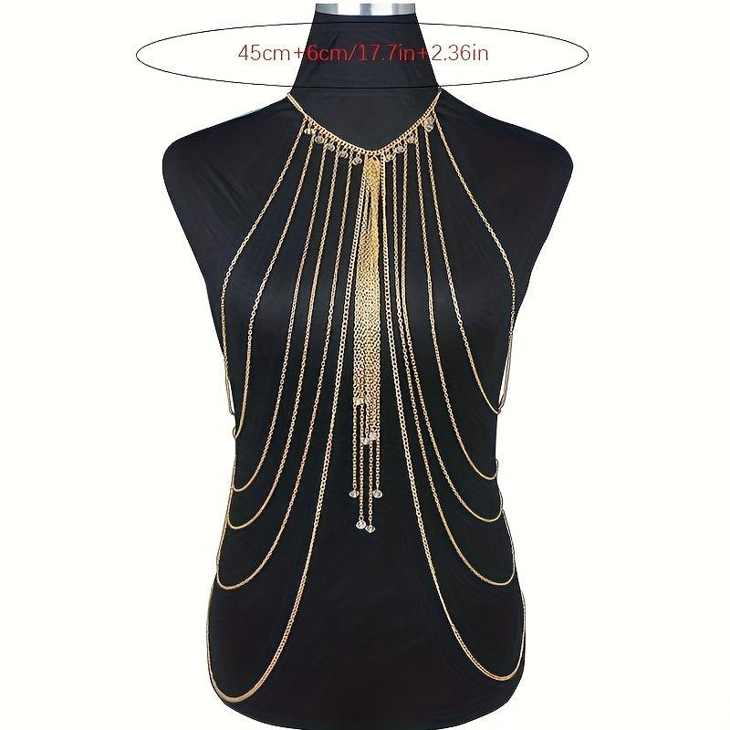 This stylish body chain necklace features an exaggerated layer fringe pendant design that adds a touch of glamour to any outfit.